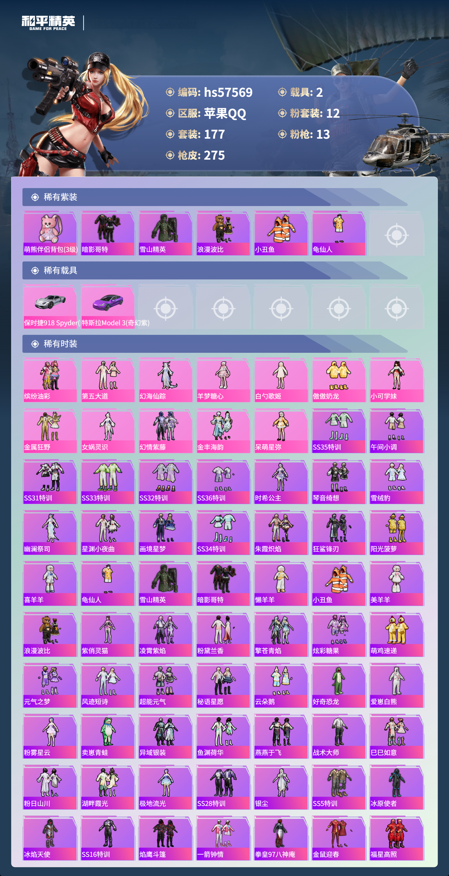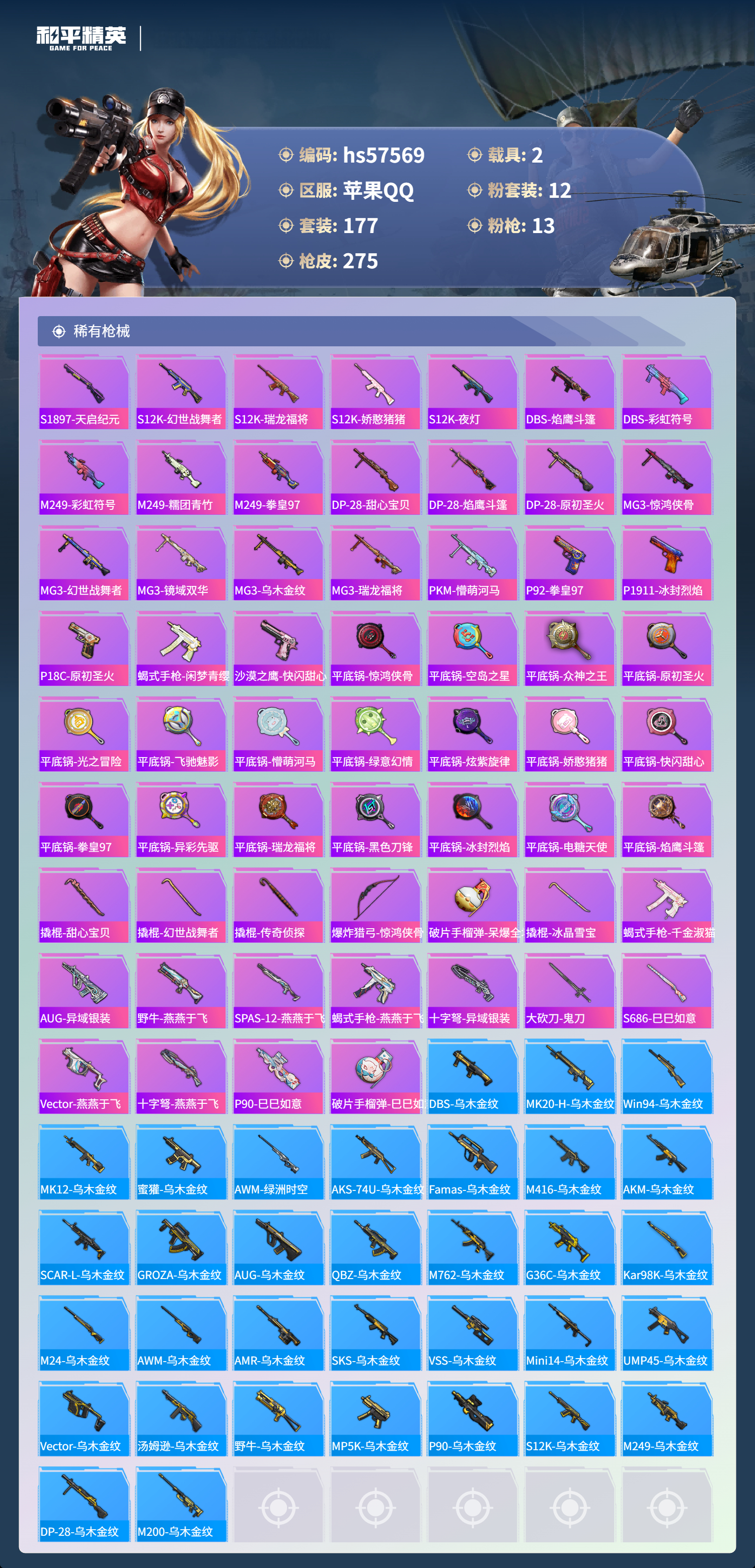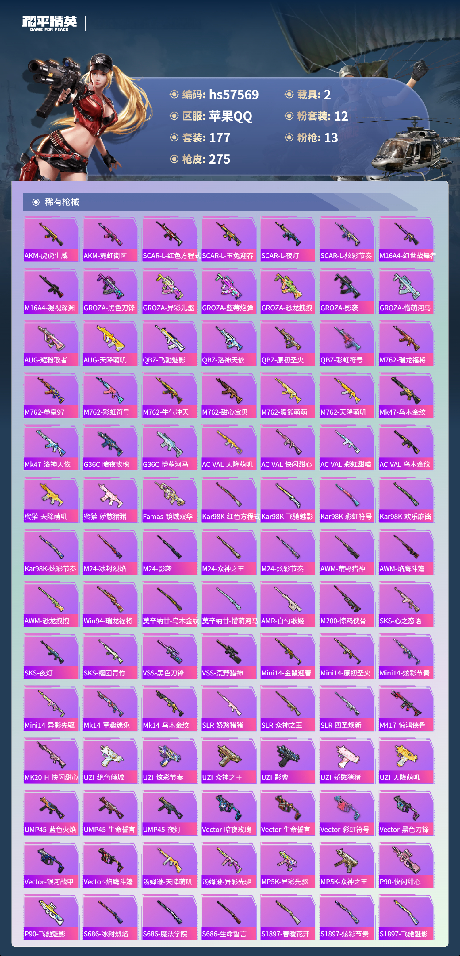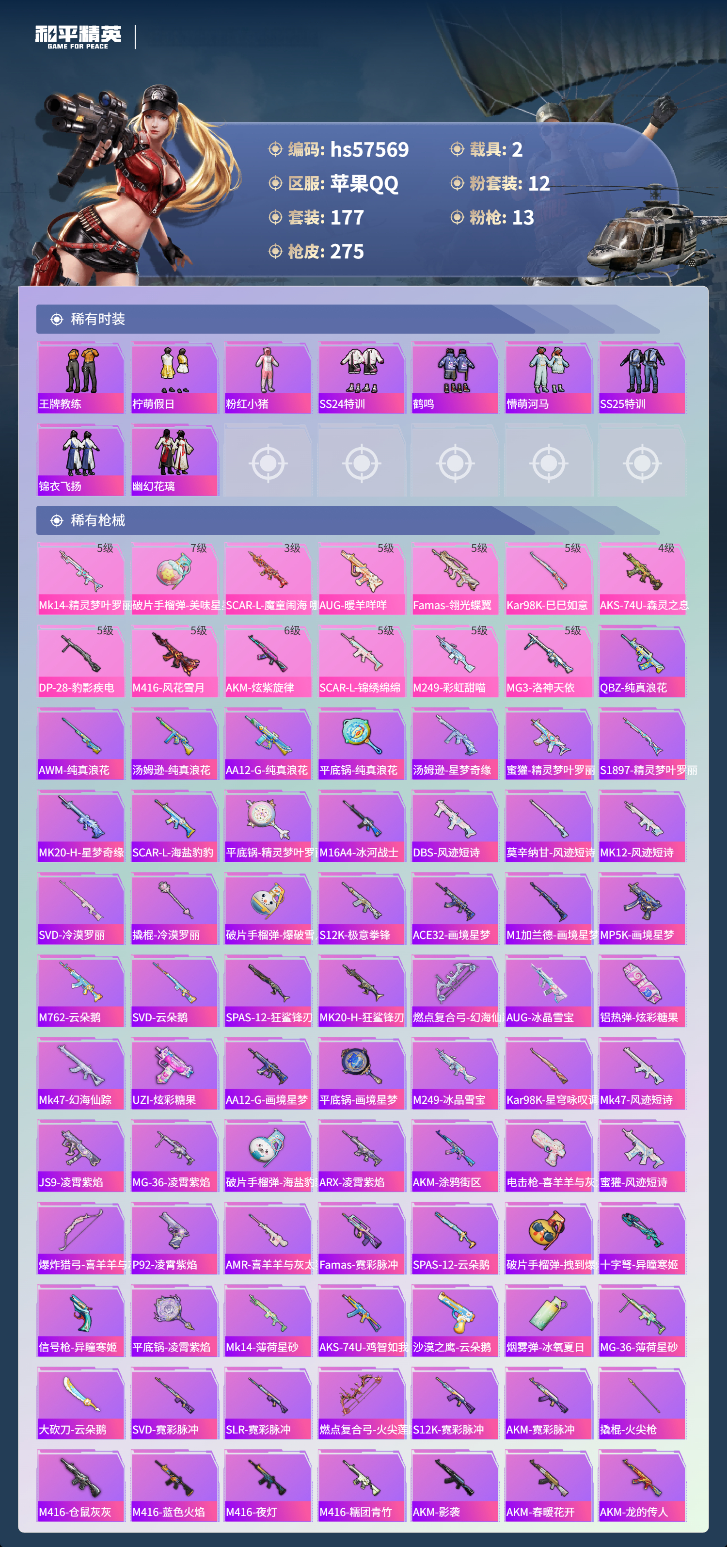 hs57569 苹果手q-11王牌印记-12粉装-13特效呛-2载具-93419热力值-177套装-275呛皮【12粉装】角色-白勺歌姬套装-金属狂野套装-缤纷油彩角色-女娲灵识角色-羊梦糖心套装-傲傲奶龙套装-金丰海韵套装-第五大道角色-幻海仙踪套装-幻情紫藤角色-呆萌星弥角色-小可学妹【13特效呛】mg3-洛神天依/5级mk14-精灵梦叶罗丽/5级aug-暖羊咩