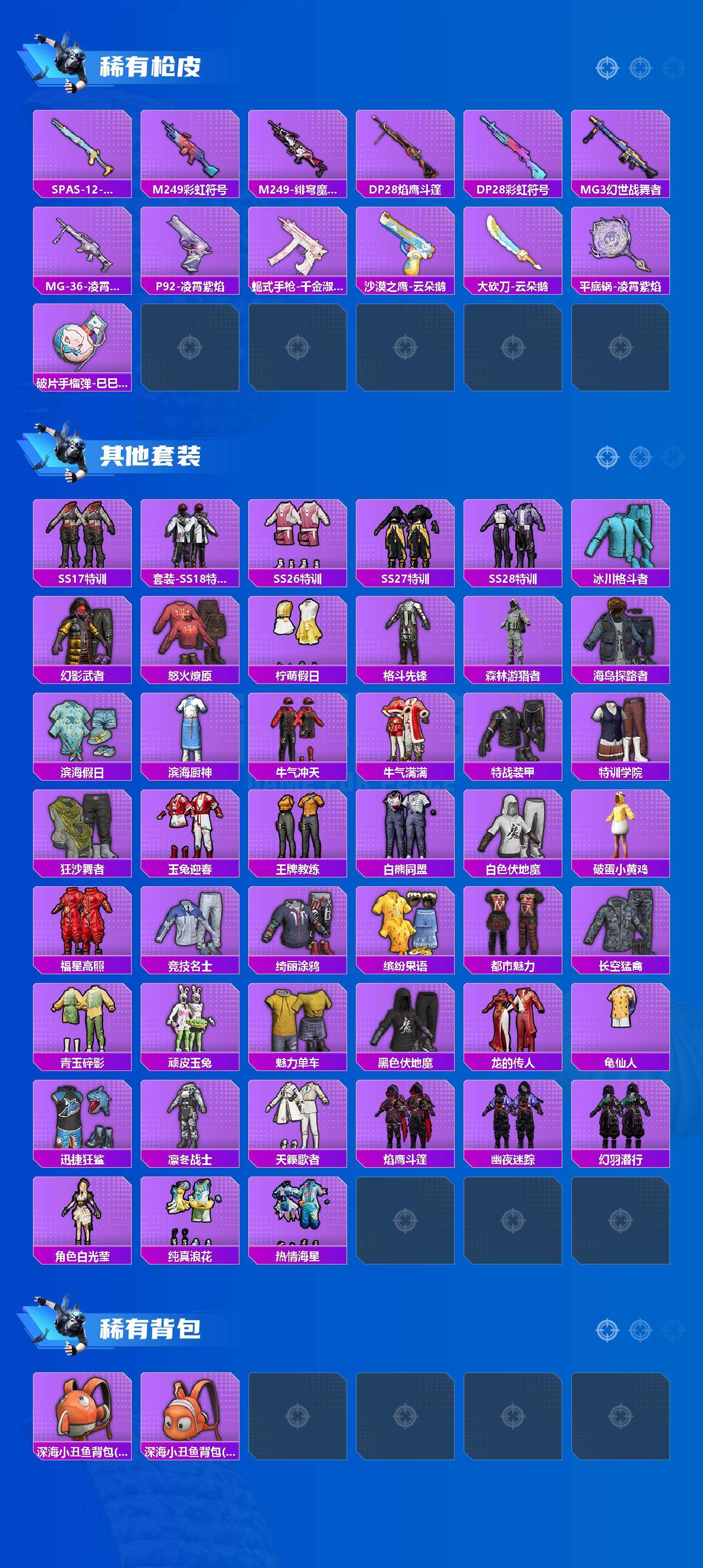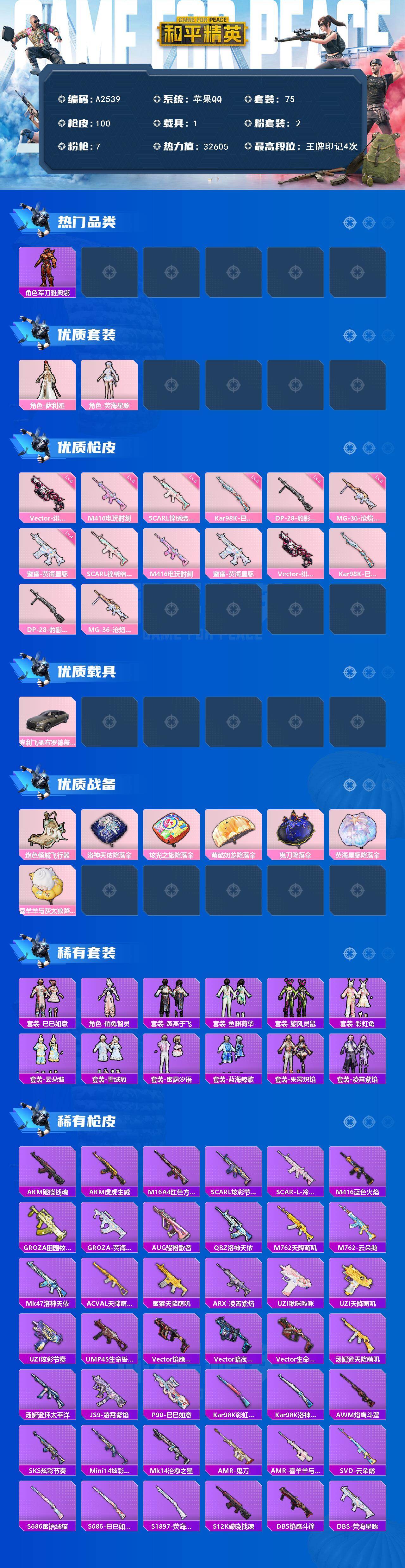 [15747550]苹果【男神号 角色-军刀雅典娜/宾利飞驰(布罗德盖棕双色)/scar-l-锦绣绵绵/kar98k-巳巳如意】 手q-2粉装-7特效呛-1载具-1粉色飞行器-32605热力值-4王牌印记-75套装-100呛皮 【热门品类】:角色-军刀雅典娜,套装-龟仙人 【粉色套装】:角色-萨利娅,角色-荧海星豚 【粉色呛皮等级】:scar-l-锦绣绵绵五级,m416-电玩时刻五级,蜜獾-荧海星豚四级,vect-绯穹魔姬六级,kar98k-巳巳如意五级,dp-28-豹影疾电五级,mg-36-沧焰双生五级 【粉色载具】:宾利飞驰(布罗德盖棕双色) 【粉色呛皮】:scar-l-锦绣绵绵,m416-电玩时刻,蜜獾-荧海星豚,vect-绯穹魔姬,kar98k-巳巳如意,dp-28-豹影疾电,mg-36-沧焰双生 【粉色飞行器】:绝色倾城飞行器 【粉色降落伞】:洛神天依降落伞,炫光之旅降落伞,萌酷奶龙降落伞,鬼刀降落伞,荧海星豚降落伞,喜羊羊与灰太狼降落伞 【稀有套装】:套装-龟仙人,套装-巳巳如意,角色-俏兔智灵,套装-燕燕于飞,套装-鱼渊荷华,套装-旋风灵鼠,套装-彩虹兔,套装-云朵鹅,套装-雪绒豹,套装-蜜露汐语,套装-蓝海鲸歌,套装-朱霞炽焰,套装-凌霄紫焰 【稀有呛皮】:akm-破晓战魂,akm-虎虎生威,m16a4-红色方程式,scar-l-炫彩节奏,scar-l-冷漠罗丽,m416-蓝色火焰,groza-田园牧歌,groza-荧海星豚,aug-耀粉歌者,q-洛神天依,m762-天降萌叽,m762-云朵鹅,mk47-洛神天依,ac-val-天降萌叽,蜜獾-天降萌叽,arx-凌霄紫焰,uzi-啾咪啾咪,uzi-天降萌叽,uzi-炫彩节奏,ump45-生命誓言,vect-焰鹰斗篷,vect-暗夜玫瑰,vect-生命誓言,汤姆逊-天降萌叽,汤姆逊-环太平洋,js9-凌霄紫焰,p90-巳巳如意,kar98k-彩虹符号,kar98k-洛神天依,awm-焰鹰斗篷,sks-炫彩节奏,mini14-炫彩节奏,mk14-治愈之星,amr-喜羊羊与灰太狼,amr-鬼刀,svd-云朵鹅,s686-蜜语绒猫,s686-巳巳如意,s1897-荧海星豚,s12k-破晓战魂,dbs-焰鹰斗篷,dbs-荧海星豚,spas-12-云朵鹅,m249-彩虹符号,m2