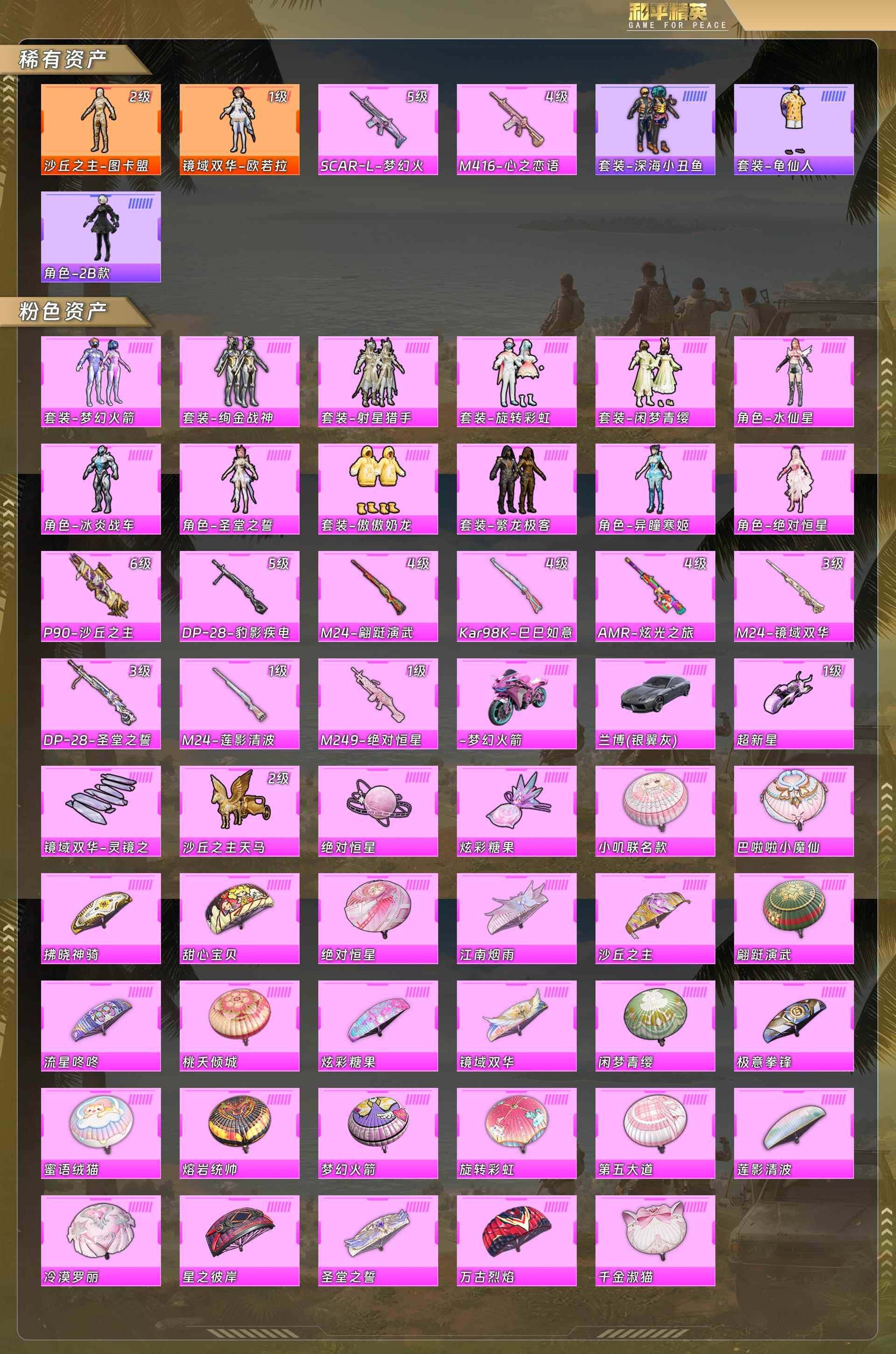 身法号-图卡盟[2级]/欧若拉[1级]/深海小丑鱼/梦幻火箭/绚金战神/射星猎手/旋转彩虹/水仙星/冰炎战车/圣堂之誓/傲傲奶龙/繁龙极客/异瞳寒姬/绝对恒星/scar-l-梦幻火箭[5级]/m4-心之恋语[4级]/p90-沙丘之主[6级]/amr-炫光之旅[4级]/m24-镜域双华[3级]/m249-绝对恒星[1级]/双人摩托-梦幻火箭/兰博基尼estoque银翼灰没战神框 hp5106 【红色神装等级】:镜域双华-欧若拉一级,沙丘之主-图卡盟二级 【红色角色神装】:镜域双华-欧若拉,沙丘之主-图卡盟 【热门品类】:粉装-梦幻火箭,粉装-繁龙极客,套装-深海小丑鱼,角色-2b战斗服款,套装-龟仙人 【粉色套装】:角色-绝对恒星,粉装-梦幻火箭,粉装-绚金战神,粉装-旋转彩虹,粉装-闲梦青缨,角色-水仙星,粉装-射星猎手,粉装-傲傲奶龙,角色-冰炎战车,角色-圣堂之誓,粉装-繁龙极客,角色-异瞳寒姬 【粉色呛皮等级】:scar-l-梦幻火箭五级,m416-心之恋语四级,p90-沙丘之主六级,kar98k-巳巳如意四级,m24-翩跹演武四级,m24-莲影清波一级,m24-镜域双华三级,amr-炫光之旅四级,m249-绝对恒星一级,dp-28-圣堂之誓三级,dp-28-豹影疾电五级 【粉色载具】:兰博基尼estoque(银翼灰),双人摩托-梦幻火箭 【粉色呛皮】:scar-l-梦幻火箭,m416-心之恋语,p90-沙丘之主,kar98k-巳巳如意,m24-翩跹演武,m24-莲影清波,m24-镜域双华,amr-炫光之旅,m249-绝对恒星,dp-28-圣堂之誓,dp-28-豹影疾电 【粉色飞行器】:绝对恒星飞行器,超新星飞行器,沙丘之主天马,镜域双华-灵镜之阶 【粉色降落伞】:绝对恒星降落伞,甜心宝贝降落伞,梦幻火箭降落伞,星之彼岸降落伞,流星咚咚降落伞,翩跹演武降落伞,旋转彩虹降落伞,桃夭倾城降落伞,第五大道降落伞,拂晓神骑降落伞,闲梦青缨降落伞,万古烈焰降落伞,莲影清波降落伞,熔岩统帅降落伞,圣堂之誓降落伞,沙丘之主降落伞,小叽联名款降落伞,蜜语绒猫降落伞,镜域双华降落伞,江南烟雨降落伞,巴啦啦小魔仙降落伞,千金淑猫降落伞,冷漠罗丽降落伞,极意拳锋降落伞,炫彩糖果降落伞 【稀有套装】:套装-龟仙人,角色-超感刻度,角色-甜心蒙太奇,套装-雪国风尚,套装-炫彩糖果 【稀有呛皮】:aug-冰晶雪宝,akm-2p战斗服款,akm-夜灯,akm-彩虹符号,akm-恐龙拽拽,akm-江南烟雨,akm-破晓战魂,akm-虎虎生威,akm-霓虹街区,akm-龙的传人,m16a4-夜灯,scar-l-扶摇飞仙,scar-l-玉兔迎春,scar-l-红色方程式,m416-糯团青竹,m416-红色方程式,m416-蓝色火焰,groza-异彩先驱,groza-影袭,groza-懵萌河马,groza-田园牧歌,aug-海螺星光,aug-耀粉歌者,aug-绝对恒星,q-彩虹符号,q-飞驰魅影,m762-天降萌叽,m762-牛气冲天,m762-瑞龙福将,mk47-妙红点点,mk47-摩登王国,g36c-镜域双华,g36c-懵萌河马,ac-val-天降萌叽,ac-val-彩虹甜喵,ac-val-快闪甜心,蜜獾-垂柳戏鸭,蜜獾-天降萌叽,蜜獾-娇憨猪猪,蜜獾-桃夭倾城,famas-镜域双华,uzi-啾咪啾咪,uzi-天降萌叽,uzi-娇憨猪猪,uzi-炫彩节奏,ump45-夜灯,ump45-怪兽之王,ump45-生命誓言,ump45-蓝色火焰,vect-焰鹰斗篷,vect-彩虹符号,vect-田园牧歌,汤姆逊-天降萌叽,汤姆逊-异彩先驱,汤姆逊-耀粉歌者,野牛-桃夭倾城,野牛-沙丘之主,mp5k-异彩先驱,p90-倾城蜜语,p90-快闪甜心,p90-飞驰魅影,kar98k-彩虹符号,kar98k-梦幻火箭,kar98k-飞驰魅影,kar98k-星穹咏叹调,m24-影袭,awm-焰鹰斗篷,awm-圣堂之誓,awm-垂柳戏鸭,sks-未来歌姬,vss-彩虹符号,vss-田园牧歌,mini14-异彩先驱,mini14-梦幻火箭,mini14-涂山之恋,mini14-炫彩节奏,mini14-生命誓言,mk14-海螺星光,win94-瑞龙福将,slr-四圣焕新,slr-娇憨猪猪,莫辛纳甘-懵萌河马,amr-妙红点点,m417-惊鸿侠骨,mk20-h-快闪甜心,m200-惊鸿侠骨,s686-彩虹符号,s686-生命誓言,s1897-春暖花开,s1897-暗夜鎏金,s1897-炫彩节奏,s1897-飞驰魅影,s12k-玩趣呆呆,s12k-瑞龙福将,s12k-夜灯,s12k-娇憨猪猪,s12k-极意拳锋,dbs-焰鹰斗篷,dbs-圣堂之誓,dbs-彩虹符号,aa12-g-炫光之旅,spas-12-田园牧歌,m249-四圣焕新,m249-妙红点点,m249-彩虹符号,m249-沙丘之主,m249-破晓战魂,m249-糯团青竹,dp-28-焰鹰斗篷,dp-28-彩虹符号,mg3-镜域双华,mg3-妙红点点,mg3-幻世战舞者,mg3-惊鸿侠骨,mg3-瑞龙福将,pkm-懵萌河马,r1895-六号树人,r45-幻彩电音,沙墨之鹦-快闪甜心,tmp-9-江南烟雨,战术弩-江南烟雨,爆炸猎弓-鎏金朋克,爆炸猎弓-惊鸿侠骨,突击盾牌-绝对恒星,撬棍-沙丘之主权杖 【其他套装】:套装-ss14特训,套装-ss15特训,套装-ss16特训,套装-ss17特训,套装-ss18特训,套装-ss19特训,套装-ss20特训,套装-ss21特训,套装-ss22特训,套装-ss23特训,套装-ss24特训,套装-ss25特训,套装-ss26特训,套装-ss27特训,套装-ss28特训,套装-ss29特训,套装-光之冒险,套装-千禧之恋,套装-夏日音浪,套装-帅气教官,套装-幻影武者,套装-柠萌假日,套装-格斗先锋,套装-沙漠兵团,套装-海岛探路者,套装-涂山之恋,套装-深蓝色名流,套装-湖蓝色名流,套装-滨海厨神,套装-炫蓝之夏,套装-燃烧卡路里,套装-牛气冲天,套装-牛气满满,套装-特战装甲,套装-特训学院,套装-猎鹰,套装-猛禽,套装-玉兔迎春,套装-王牌教练,套装-甜蜜告白,套装-疯狂小兔子,套装-白色伏地魔,套装-破晓战魂,套装-破蛋小黄鸡,套装-福星高照,套装-空岛之星,套装-空投萌叽,套装-竞技名士,套装-竞技达人朋克,套装-绮丽涂鸦,套装-绯格组合,套装-绯红恋人,套装-缤纷果语,套装-耀粉歌者,套装-荣耀,套装-萌黄之夏,套装-虎虎生威吉莉,套装-街头潮人,套装-都市魅力,套装-酒红色名流,套装-酷潮明星,套装-长空猛禽,套装-霓虹街区,套装-青春校园,套装-青玉碎影,套装-骑行爱好者