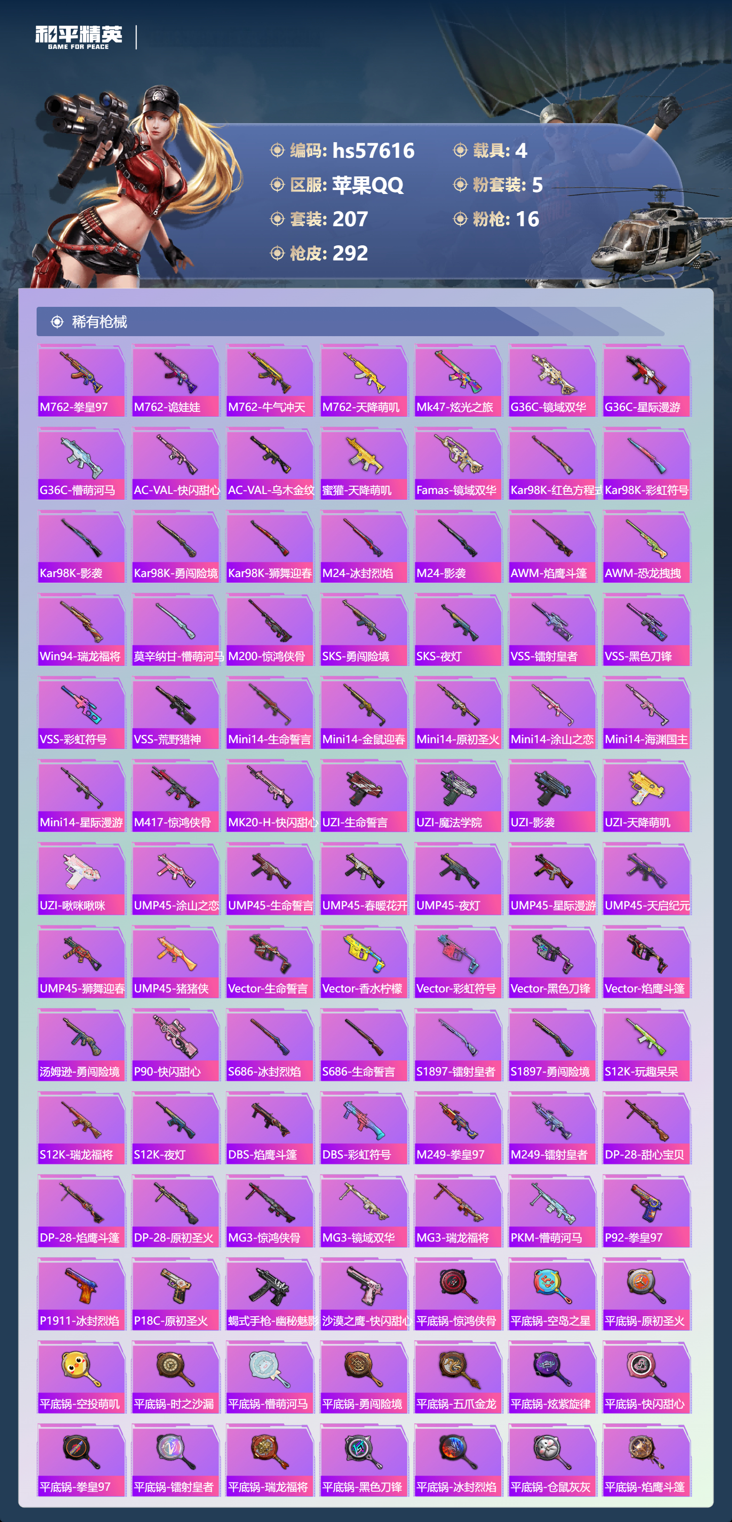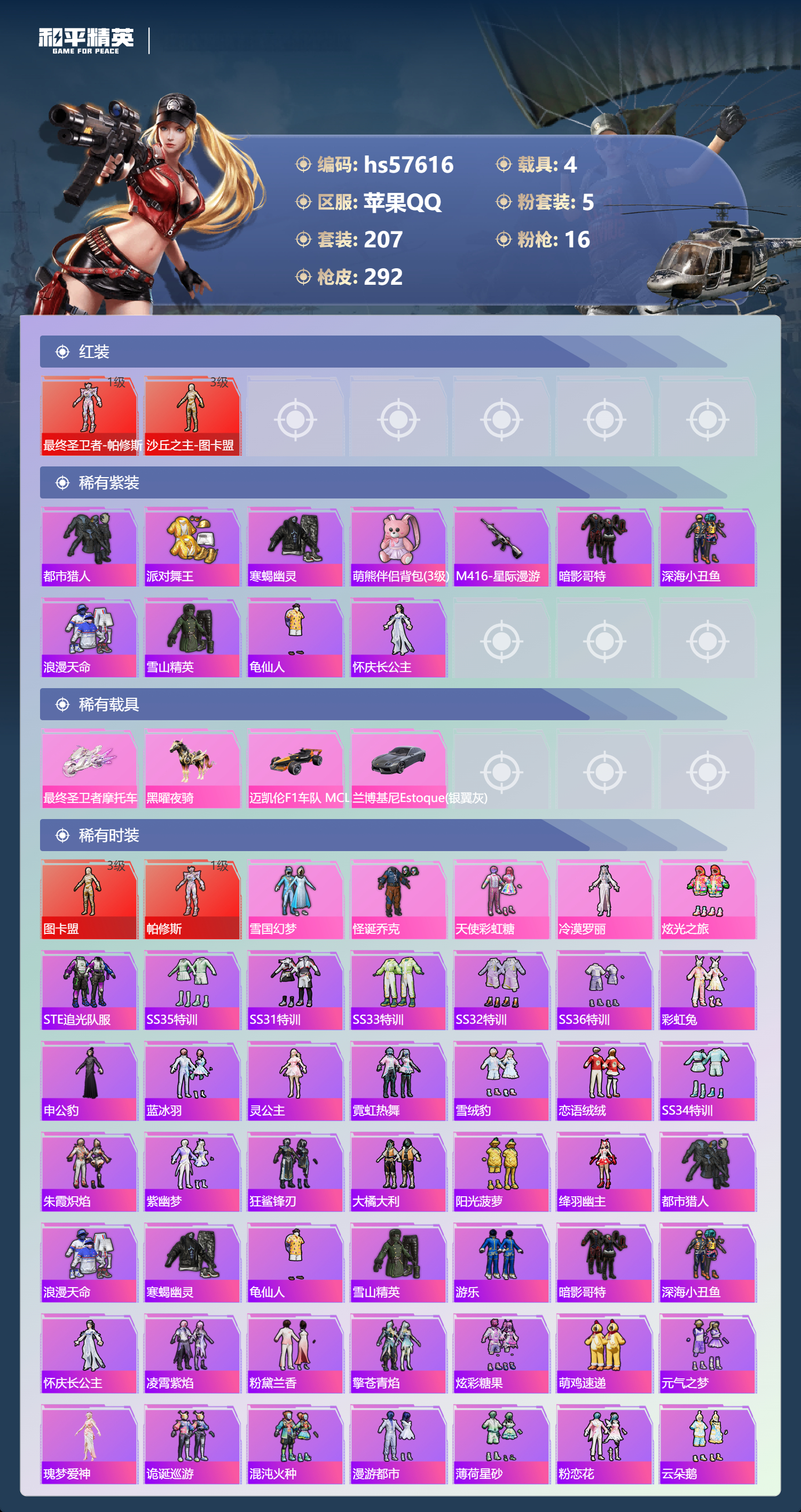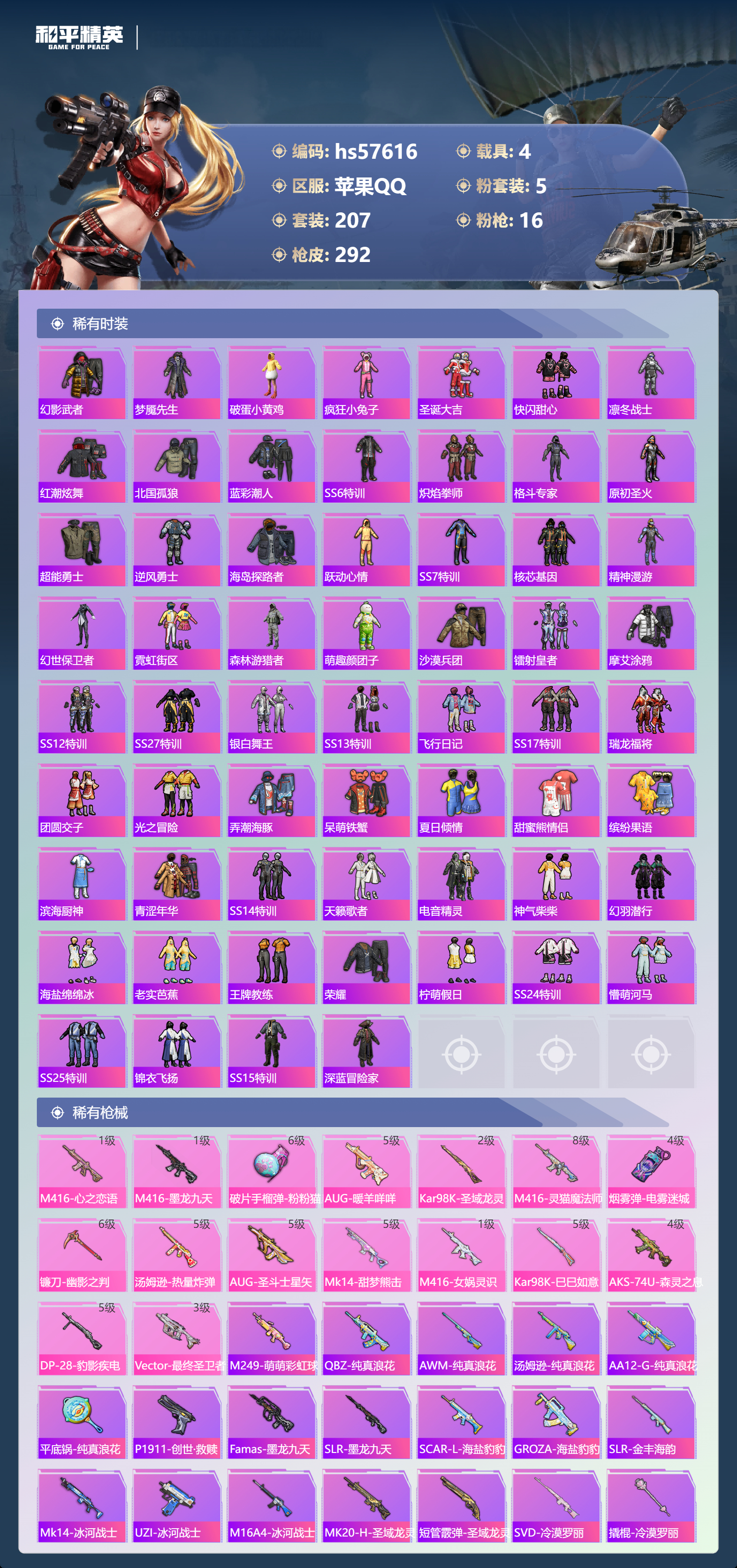 hs57616苹果手q-11王牌印记-有战神框-2红装-5粉装-16特效呛-4载具-热力值-207套装-292呛皮-5卓越印记-2传奇印记【2红装】最终圣卫者-帕修斯/1级沙丘之主-图卡盟/3级【5粉装】套装-怪诞乔克角色-冷漠罗丽套装-炫光之旅套装-天使彩虹糖套装-雪国幻梦【16特效呛】dp-28-豹影疾电/5级vect-最终圣卫者/3级aug-圣斗士星矢/5