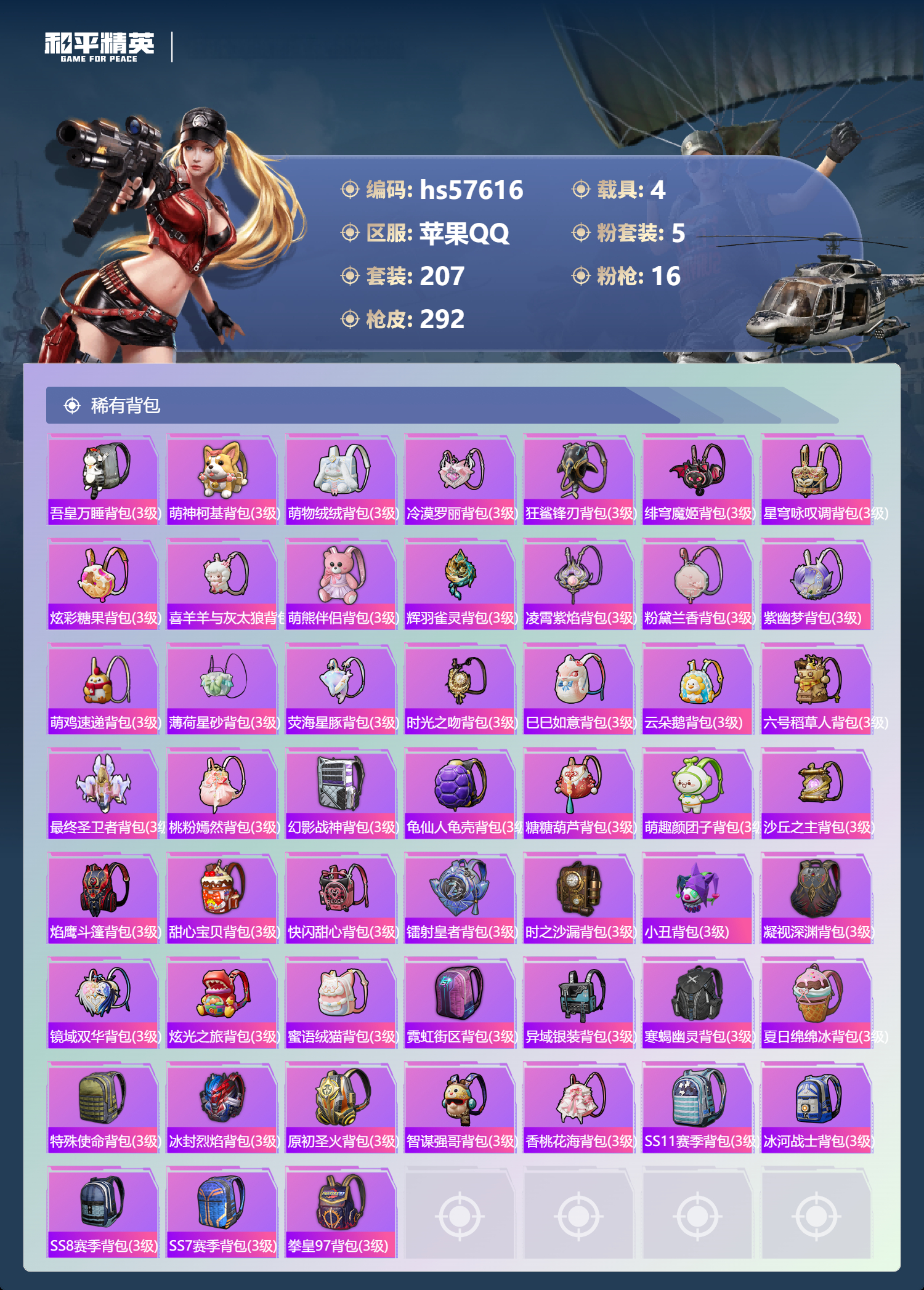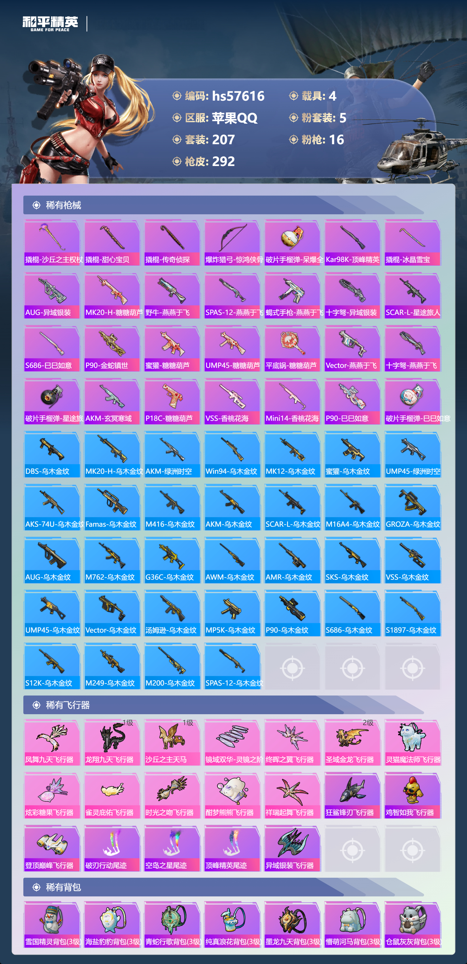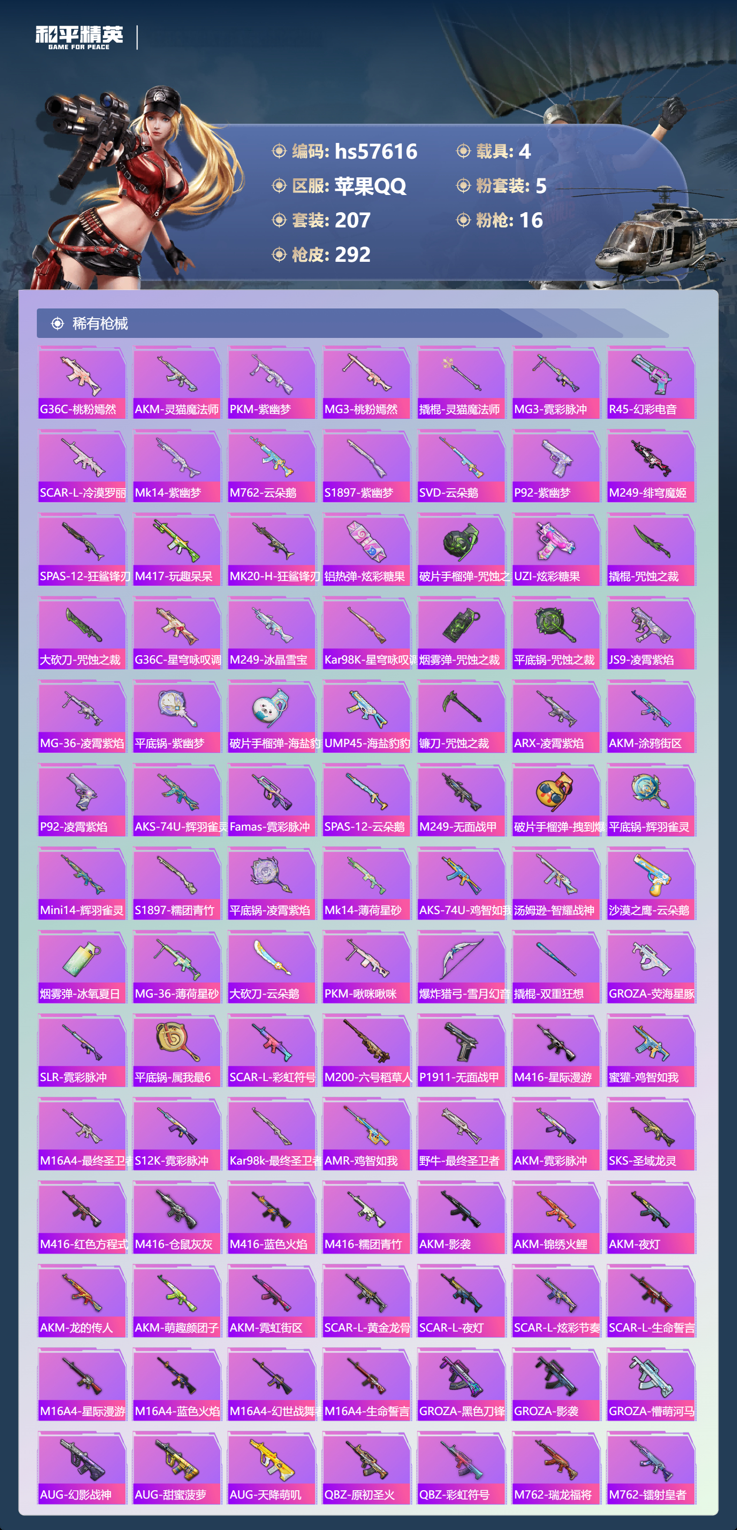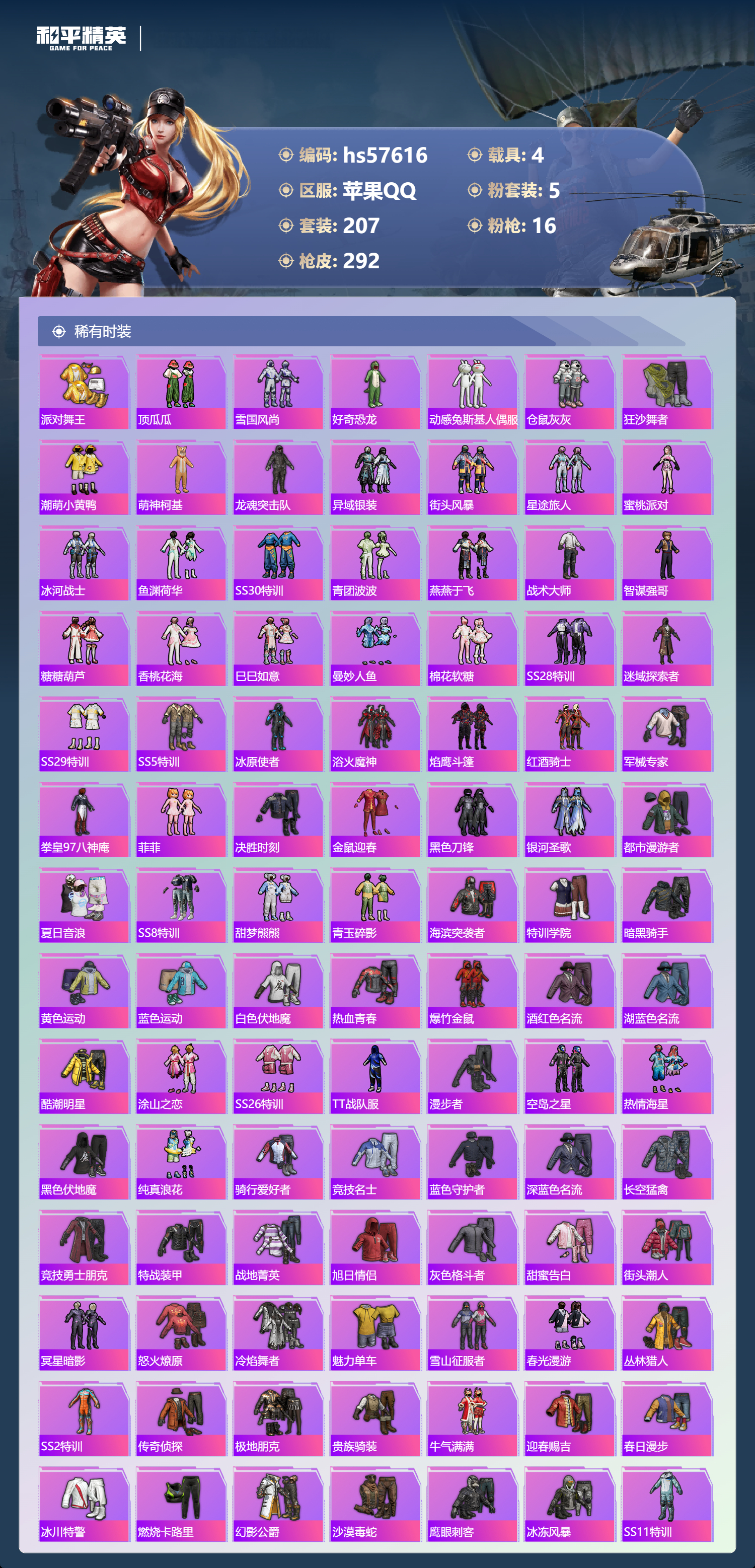 hs57616苹果手q-11王牌印记-有战神框-2红装-5粉装-16特效呛-4载具-热力值-207套装-292呛皮-5卓越印记-2传奇印记【2红装】最终圣卫者-帕修斯/1级沙丘之主-图卡盟/3级【5粉装】套装-怪诞乔克角色-冷漠罗丽套装-炫光之旅套装-天使彩虹糖套装-雪国幻梦【16特效呛】dp-28-豹影疾电/5级vect-最终圣卫者/3级aug-圣斗士星矢/5