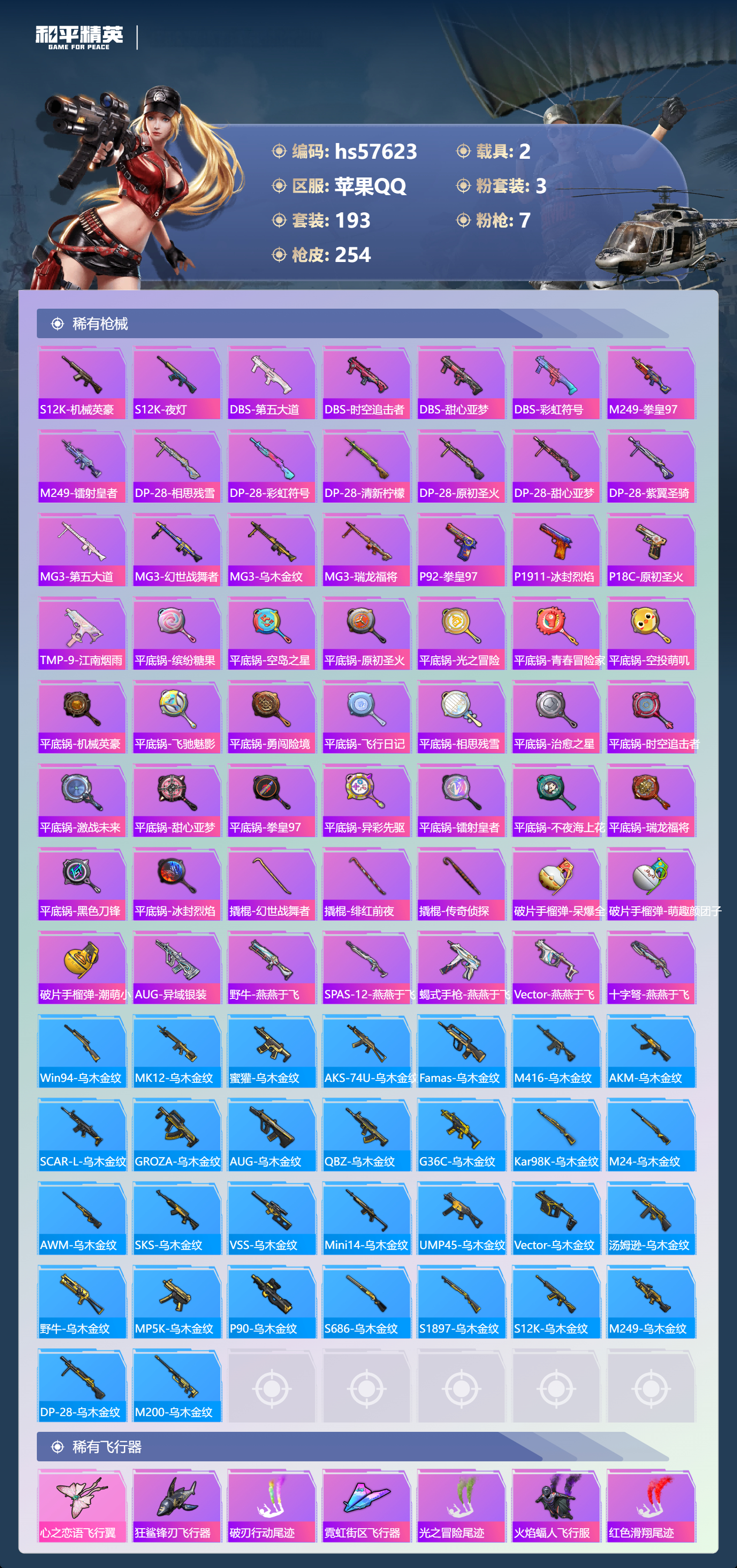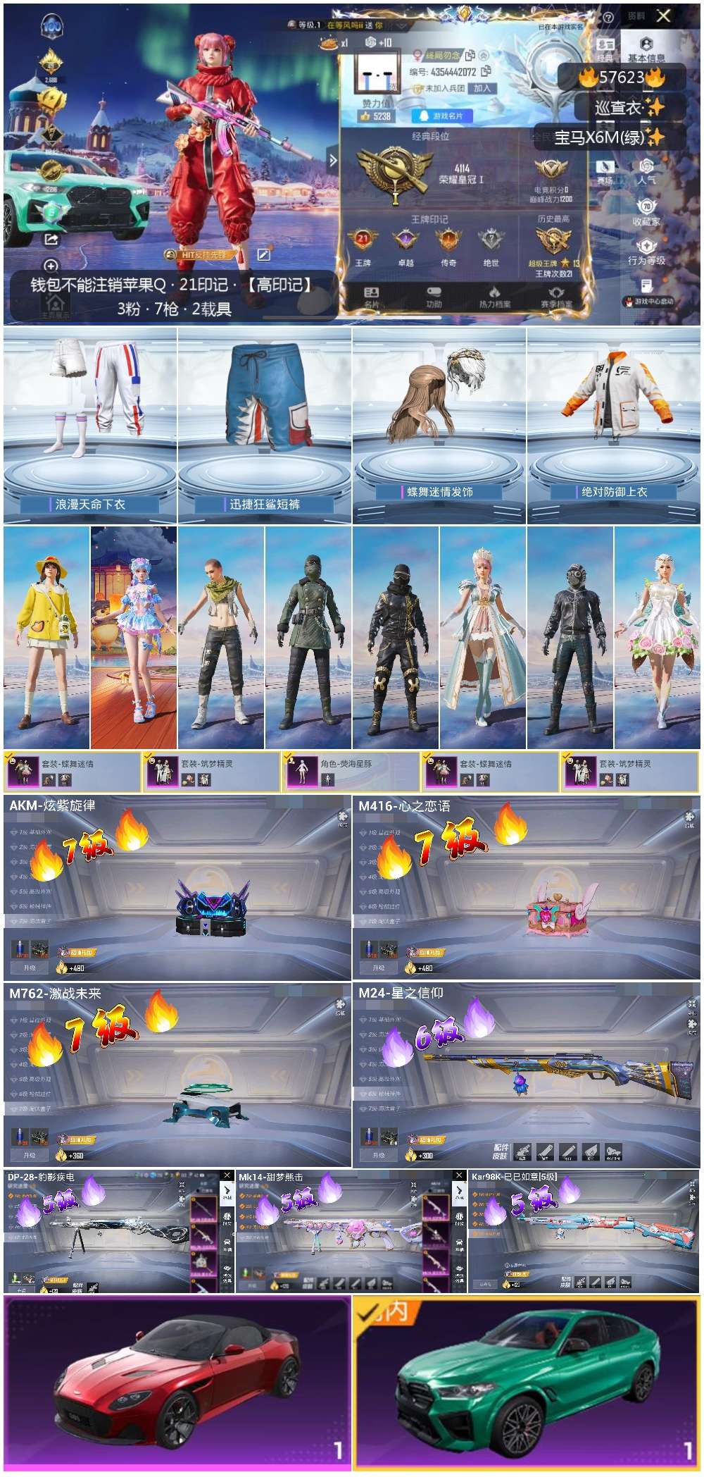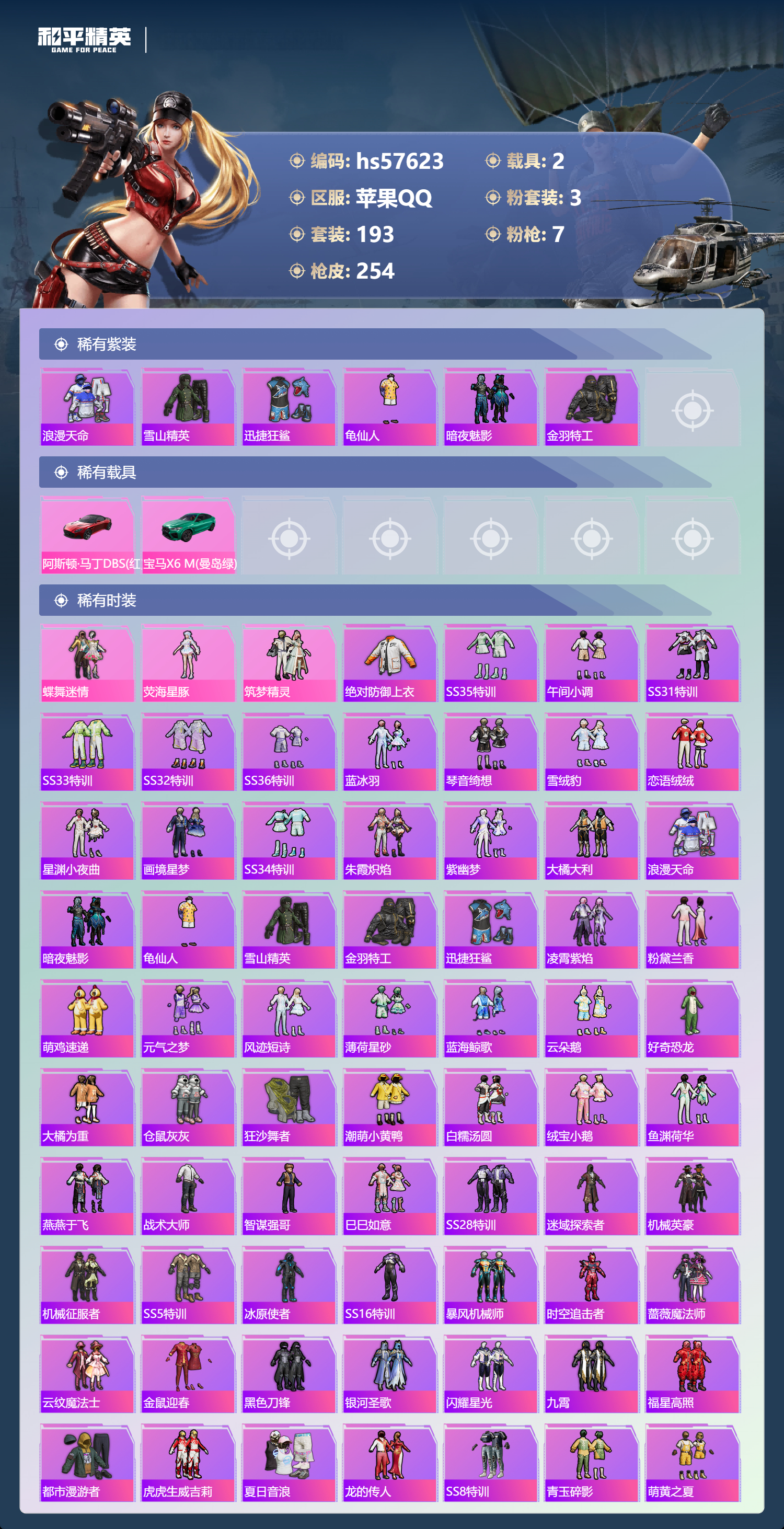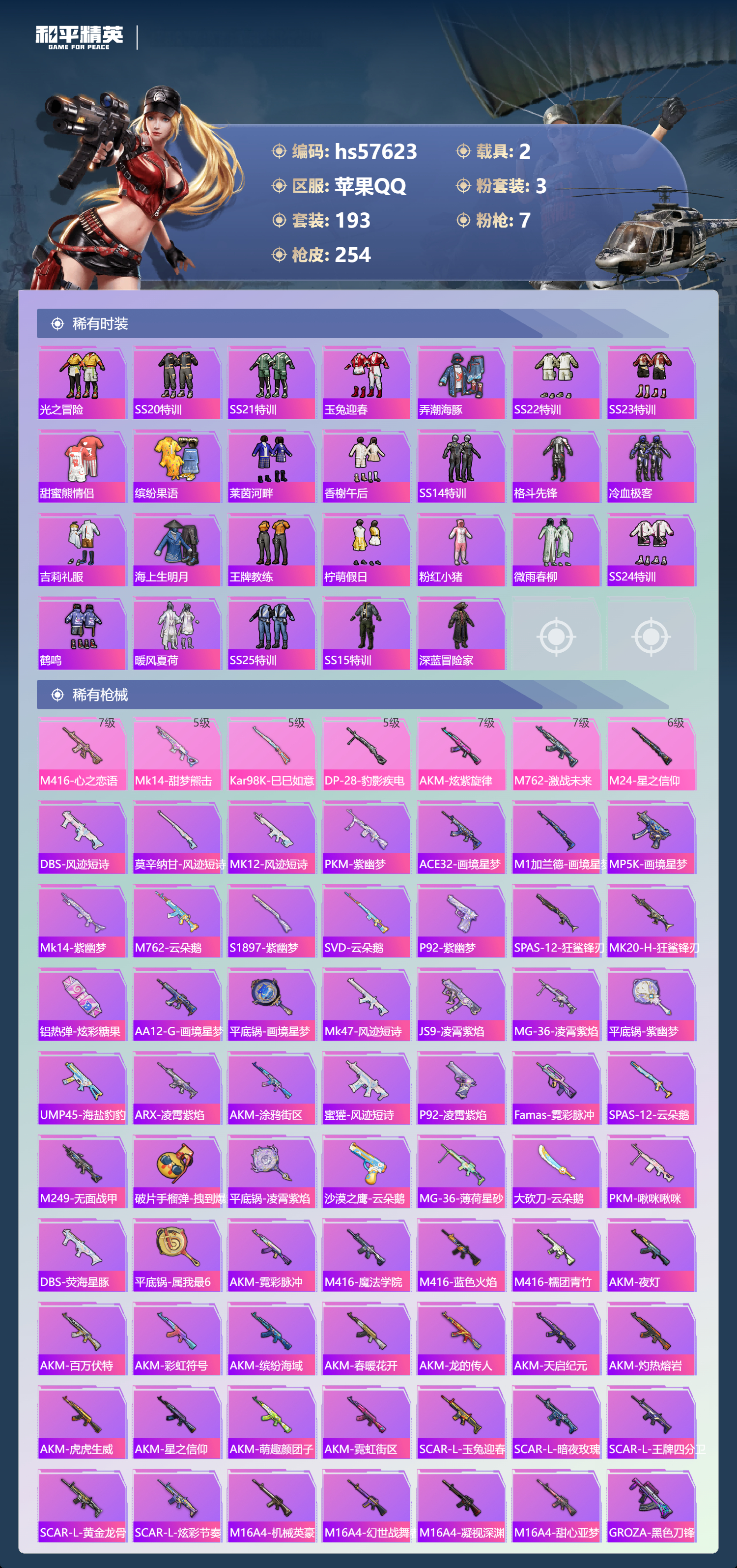 hs57623 苹果手q-21王牌印记-3粉装-7特效呛-2载具-85085热力值-193套装-254呛皮-1卓越印记-1传奇印记【3粉装】套装-筑梦精灵套装-蝶舞迷情角色-荧海星豚【7特效呛】m24-星之信仰/6级dp-28-豹影疾电/5级m762-激战未来/7级akm-炫紫旋律/7级m416-心之恋语/7级kar98k-巳巳如意/5级mk14-甜梦熊击/5级【7稀有紫装】