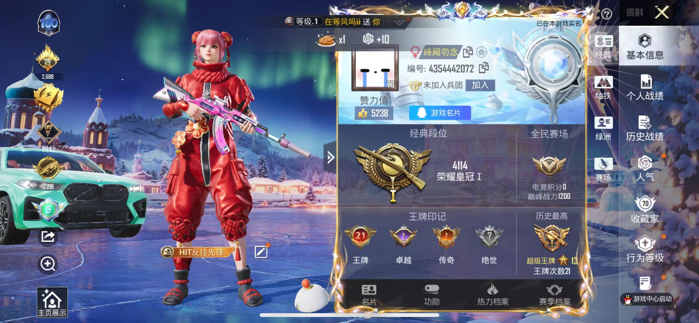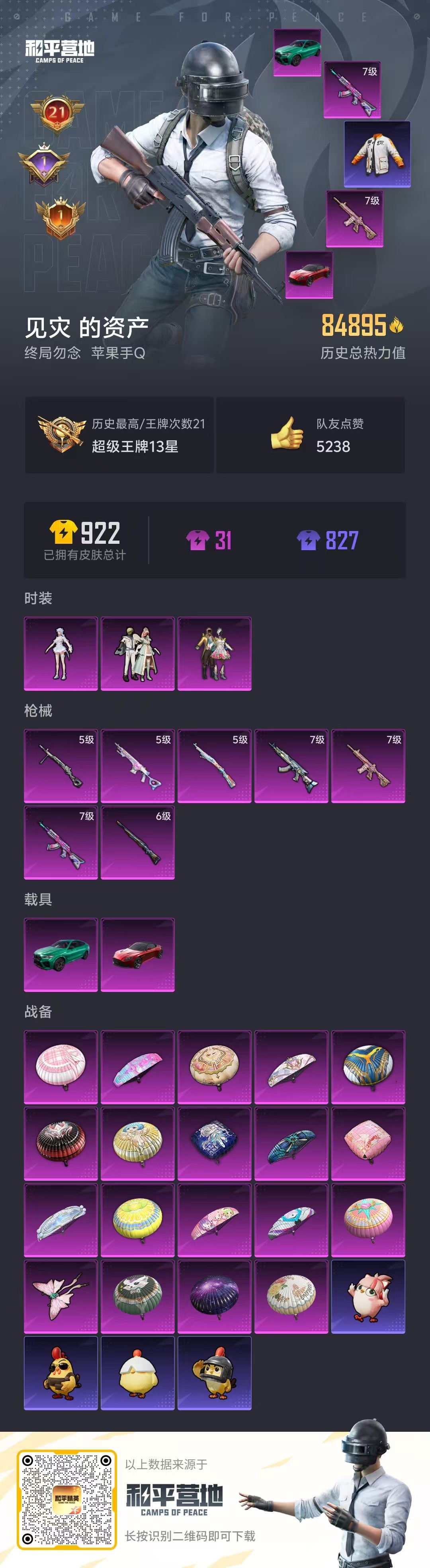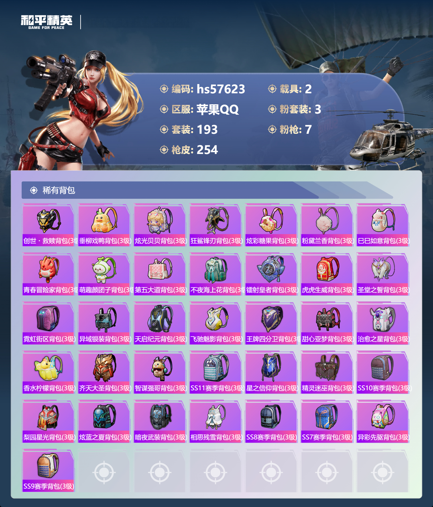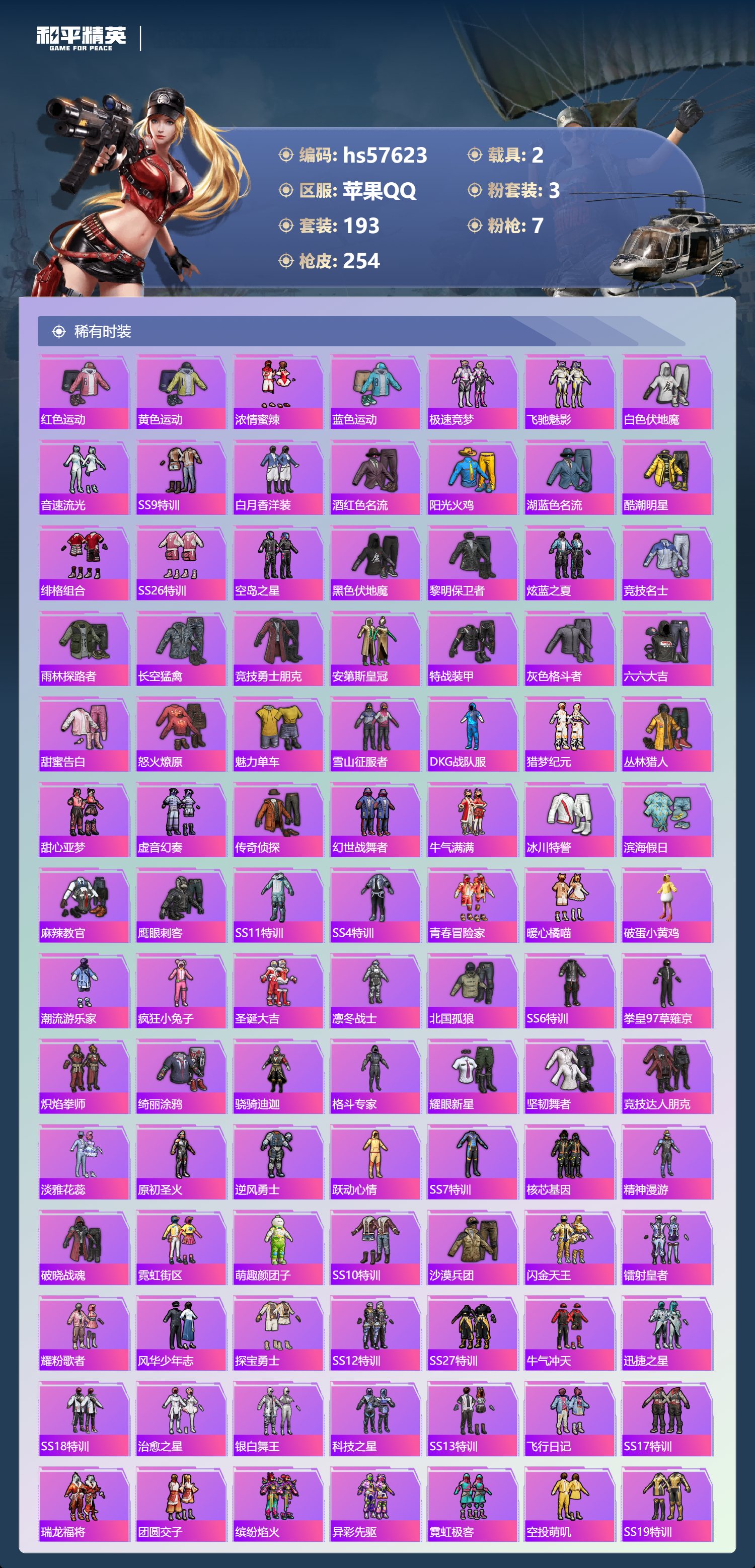 hs57623 苹果手q-21王牌印记-3粉装-7特效呛-2载具-85085热力值-193套装-254呛皮-1卓越印记-1传奇印记【3粉装】套装-筑梦精灵套装-蝶舞迷情角色-荧海星豚【7特效呛】m24-星之信仰/6级dp-28-豹影疾电/5级m762-激战未来/7级akm-炫紫旋律/7级m416-心之恋语/7级kar98k-巳巳如意/5级mk14-甜梦熊击/5级【7稀有紫装】