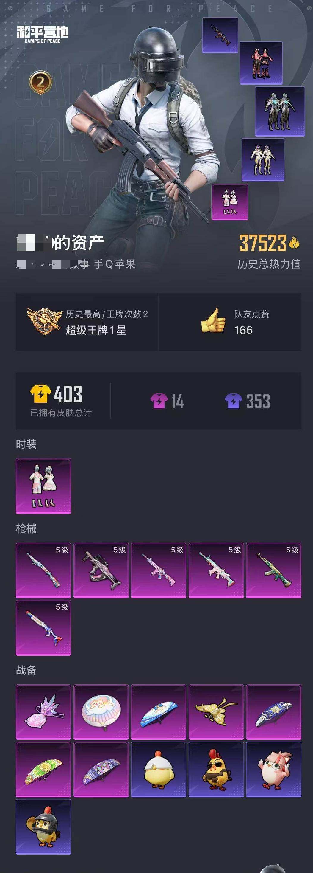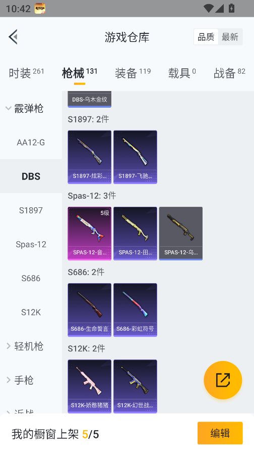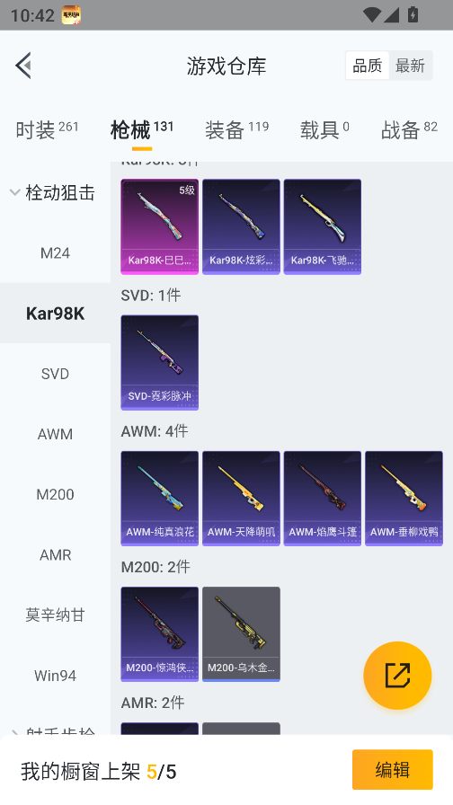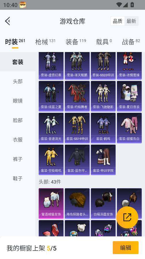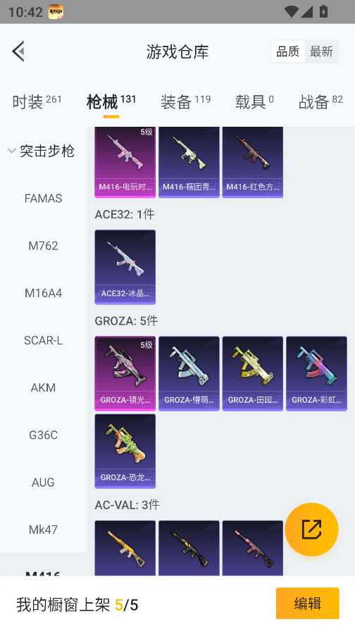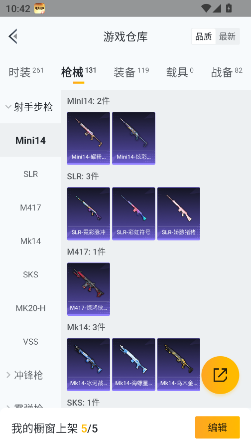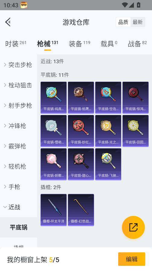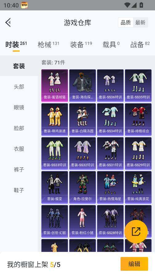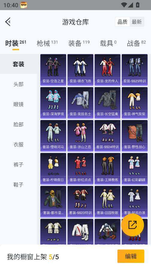 0载具-261套装-131呛皮-实名: 可修改 时装数: 71 呛械数: 131 战备数: 82 热门装扮: 蜜语绒猫 稀有呛皮: 五级m416-电玩时刻五级scar-l-锦绣绵绵五级akm-绿萝繁花五级spas-12-音爆索尼克五级groza-镜光银凌五级kar98k-巳巳如意