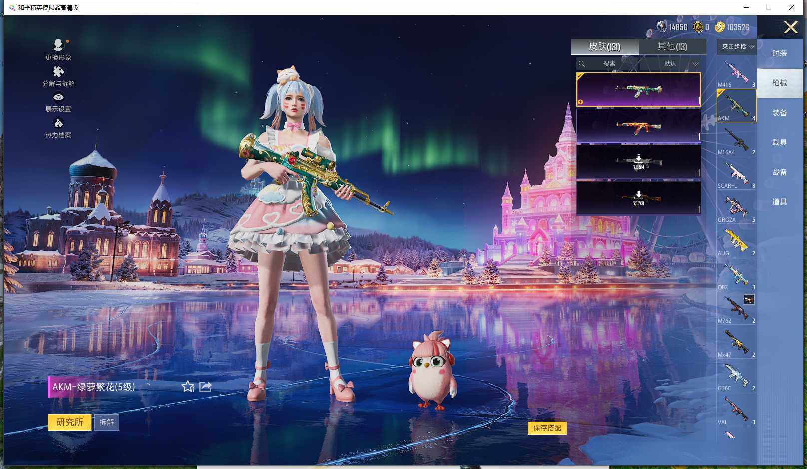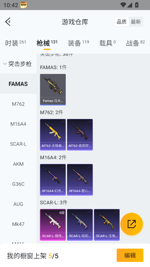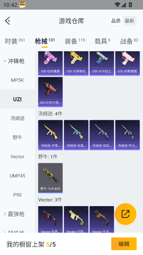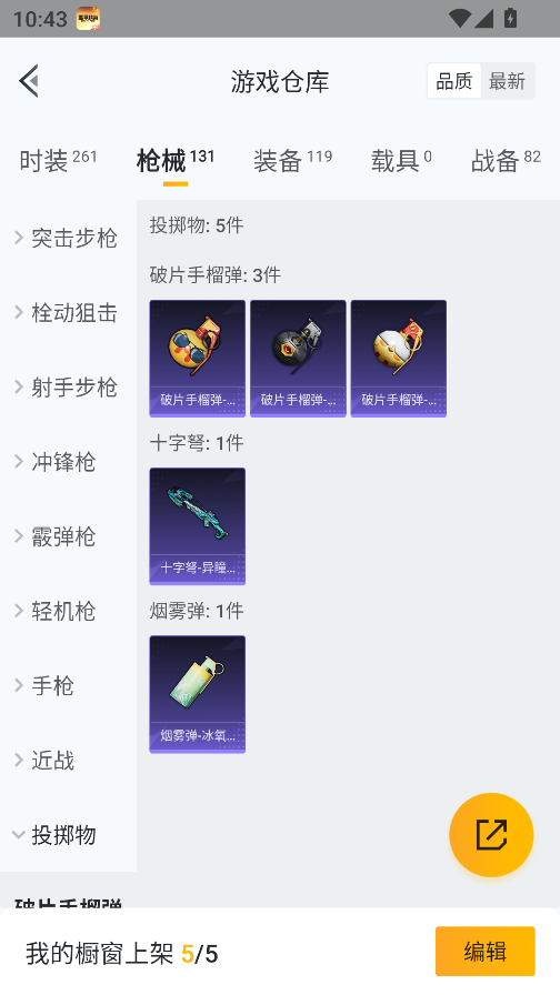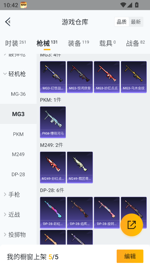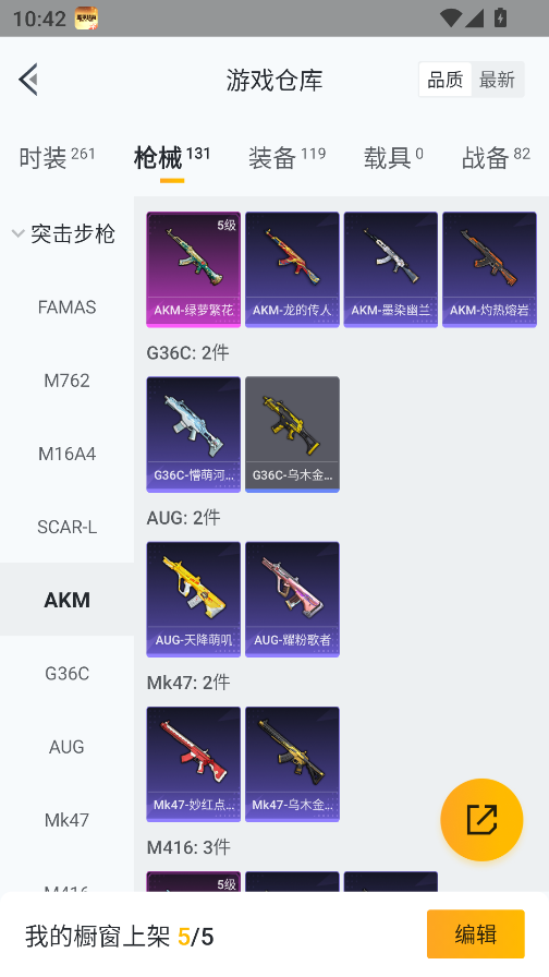 0载具-261套装-131呛皮-实名: 可修改 时装数: 71 呛械数: 131 战备数: 82 热门装扮: 蜜语绒猫 稀有呛皮: 五级m416-电玩时刻五级scar-l-锦绣绵绵五级akm-绿萝繁花五级spas-12-音爆索尼克五级groza-镜光银凌五级kar98k-巳巳如意