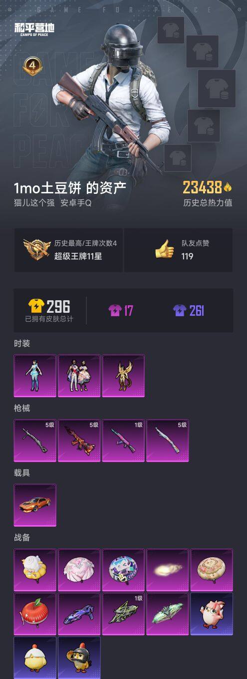 安卓 手q【异瞳寒姬 1载具】3粉装-4特效呛-1载具-3粉色飞行器-23438热力值-4王牌印记-35套装-82呛皮 【粉色套装】:角色-凤凰座 一辉,粉装-星穹咏叹调,角色-异瞳寒姬 【粉色呛皮等级】:akm-炫紫旋律一级,m416-风花雪月五级,kar98k-巳巳如意五级,dp-28-豹影疾电五级 【粉色载具】:天马凌跃(星芒橙) 【粉色呛皮】:akm-炫紫旋律,m416