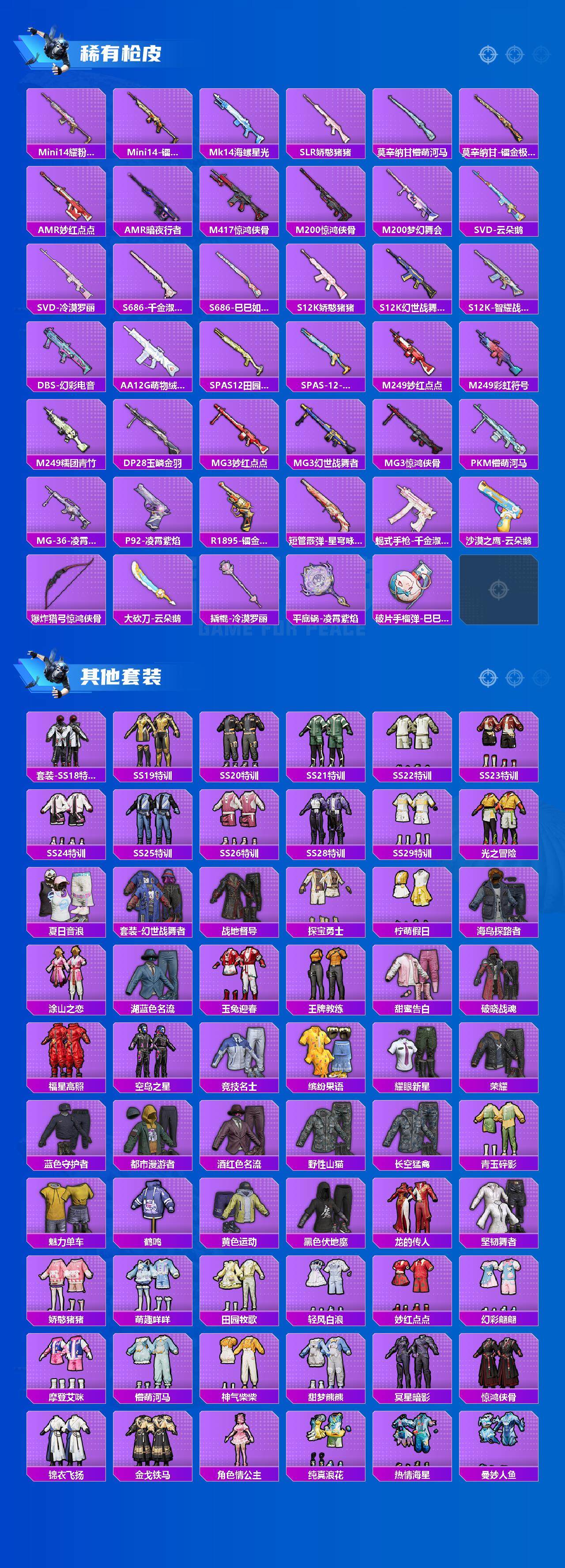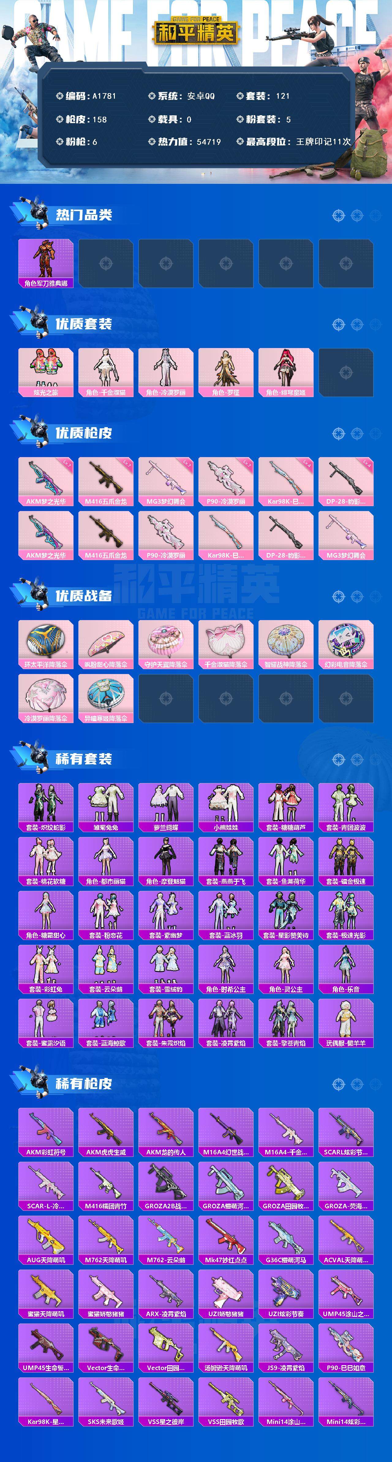 [15359434]安卓【小号】 手q-5粉装-6特效呛-0载具-0粉色飞行器-54719热力值-11王牌印记-121套装-158呛皮 【热门品类】:角色-军刀雅典娜 【粉色套装】:粉装-炫光之旅,角色-千金淑猫,角色-冷漠罗丽,角色-罗征,角色-绯穹魔姬 【粉色呛皮等级】:akm-梦之光华七级,m416-五爪金龙七级,p90-冷漠罗丽七级,kar98k-巳巳如意四级,dp-28-豹影疾电四级,mg3-梦幻舞会七级 【粉色呛皮】:akm-梦之光华,m416-五爪金龙,p90-冷漠罗丽,kar98k-巳巳如意,dp-28-豹影疾电,mg3-梦幻舞会 【粉色降落伞】:环太平洋降落伞,飒粉甜心降落伞,守护天翼降落伞,千金淑猫降落伞,智耀战神降落伞,幻彩电音降落伞,冷漠罗丽降落伞,异瞳寒姬降落伞 【稀有套装】:套装-炽纹蛇影,套装-雏菊兔兔,套装-萝兰蝴蝶,套装-小熊娃娃,套装-糖糖葫芦,套装-青团波波,套装-棉花软糖,角色-都市丽猫,角色-摩登魅猫,套装-燕燕于飞,套装-鱼渊荷华,套装-镭金极速,角色-糖霜甜心,套装-粉恋花,套装-紫幽梦,套装-蓝冰羽,套装-星影赞美诗,套装-极速光影,套装-彩虹兔,套装-云朵鹅,套装-雪绒豹,角色-时希公主,角色-灵公主,角色-乐音,套装-蜜露汐语,套装-蓝海鲸歌,套装-朱霞炽焰,套装-凌霄紫焰,套装-擎苍青焰,玩偶服-懒羊羊 【稀有呛皮】:akm-彩虹符号,akm-虎虎生威,akm-龙的传人,m16a4-幻世战舞者,m16a4-千金淑猫,scar-l-炫彩节奏,scar-l-冷漠罗丽,m416-糯团青竹,groza-2b战斗服款,groza-懵萌河马,groza-田园牧歌,groza-荧海星豚,aug-天降萌叽,m762-天降萌叽,m762-云朵鹅,mk47-妙红点点,g36c-懵萌河马,ac-val-天降萌叽,蜜獾-天降萌叽,蜜獾-娇憨猪猪,arx-凌霄紫焰,uzi-娇憨猪猪,uzi-炫彩节奏,ump45-涂山之恋,ump45-生命誓言,vect-生命誓言,vect-田园牧歌,汤姆逊-天降萌叽,js9-凌霄紫焰,p90-巳巳如意,kar98k-星穹咏叹调,sks-未来歌姬,vss-星之彼岸,vss-田园牧歌,mini14-涂山之恋,mini14-炫彩节奏,mini14-耀粉歌者,mini14-镭金极速,mk14-海螺星