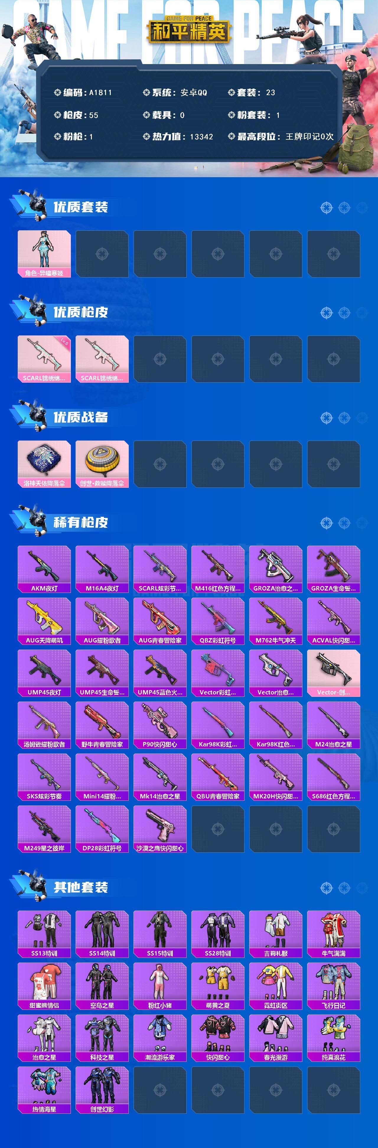 [15383962]安卓 【小号 1粉装-1特效呛】手q-1粉装-1特效呛-0载具-0粉色飞行器-13342热力值-1王牌印记-23套装-55呛皮 【热门品类】:套装-粉红小猪 【粉色套装】:角色-异瞳寒姬 【粉色呛皮等级】:scar-l-锦绣绵绵五级 【粉色呛皮】:scar-l-锦绣绵绵 【粉色降落伞】:洛神天依降落伞,创世·救赎降落伞 【稀有呛皮】:akm-夜灯,m16a4-夜灯,scar-l-炫彩节奏,m416-红色方程式,groza-治愈之星,groza-生命誓言,aug-天降萌叽,aug-耀粉歌者,aug-青春冒险家,q-彩虹符号,m762-牛气冲天,ac-val-快闪甜心,ump45-夜灯,ump45-生命誓言,ump45-蓝色火焰,vect-彩虹符号,vect-治愈之星,vect-创世·救赎,汤姆逊-耀粉歌者,野牛-青春冒险家,p90-快闪甜心,kar98k-彩虹符号,kar98k-红色方程式,m24-治愈之星,sks-炫彩节奏,mini14-耀粉歌者,mk14-治愈之星,qbu-青春冒险家,mk20-h-快闪甜心,s686-红色方程式,m249-星之彼岸,dp-28-彩虹符号,沙墨之鹦-快闪甜心 【其他套装】:套装-ss13特训,套装-ss14特训,套装-ss15特训,套装-ss28特训,套装-吉莉礼服,套装-牛气满满,套装-甜蜜熊情侣,套装-空岛之星,套装-粉红小猪,套装-萌黄之夏,套装-霓虹街区,套装-飞行日记,套装-治愈之星,套装-科技之星,套装-潮流游乐家,套装-快闪甜心,套装-春光漫游,套装-纯真浪花,套装-热情海星,套装-创世·幻影 【营地id】:761706030
