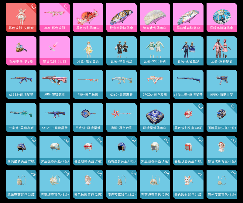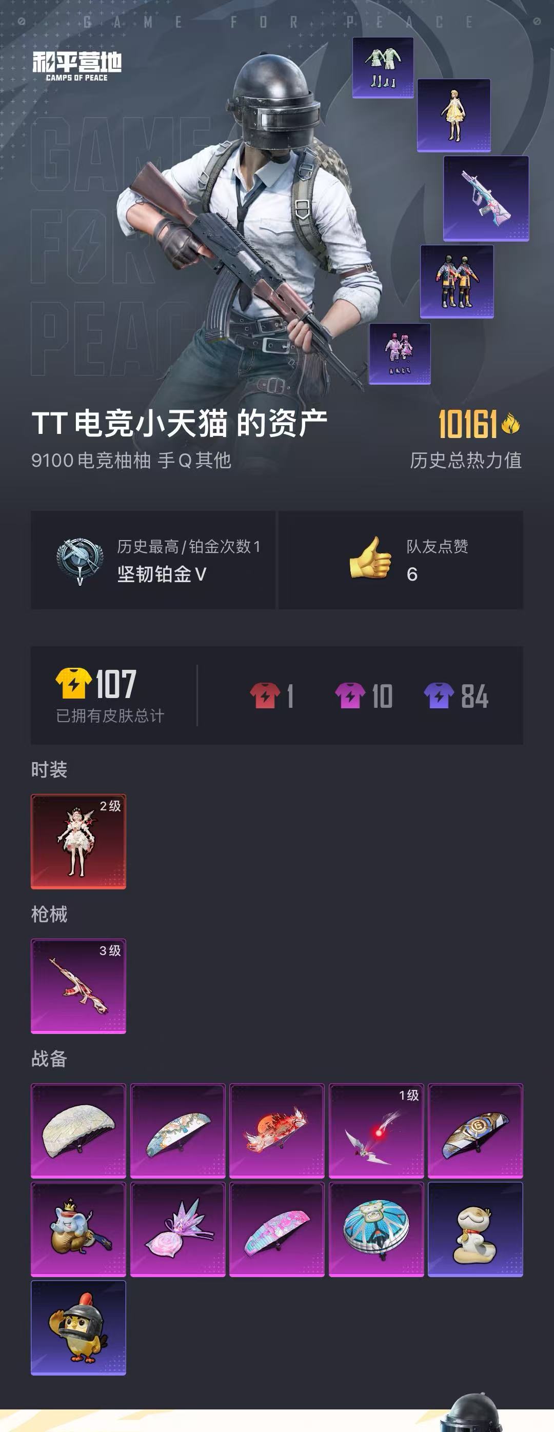 【和平精英】【lyhp20277】2级红装艾丽娅 0粉装,1特效呛,0载具,历史最高段位:坚韧铂金ⅴ 热力值:10161,9套装,29呛械,41装备,19战备;套装:暮色玫影-艾丽娅,套装-耀粉歌者,套装-街头风暴,角色-馥郁金蕊,套装-炫彩糖果,套装-ss35特训,套装-琴音绮想,套装-画境星梦,套装-雪国风尚;呛皮:aug-耀粉歌者,aug-冰晶雪宝,famas-霓彩脉冲,3级akm-暮色玫影,akm-霓彩脉冲,ace32-画境星梦,ace32-冰晶雪宝,groza-暮色玫影,g36c-霁蓝缠春,awm-暮色玫影,win94-乌木金纹,slr-霓彩脉冲,mk12-乌木金纹,m1加兰德-画境星梦,uzi-炫彩糖果,mp5k-画境星梦,aks-74u-乌木金纹,s12k-霓彩脉冲,aa12-g-画境星梦,mg3-幻世战舞者,m249-冰晶雪宝,mg-36-薄荷星砂,平底锅-画境星梦,撬棍-暮色玫影,撬棍-冰晶雪宝,破片手留单-拽到爆炸,破片手留单-爆破雪人,十子怒-异瞳寒姬,铝热弹-炫彩糖果;降落伞:炫彩糖果飞行器,极意拳锋飞行器,暮色之舞飞行器,狂鲨锋刃飞行器; 详情看图
