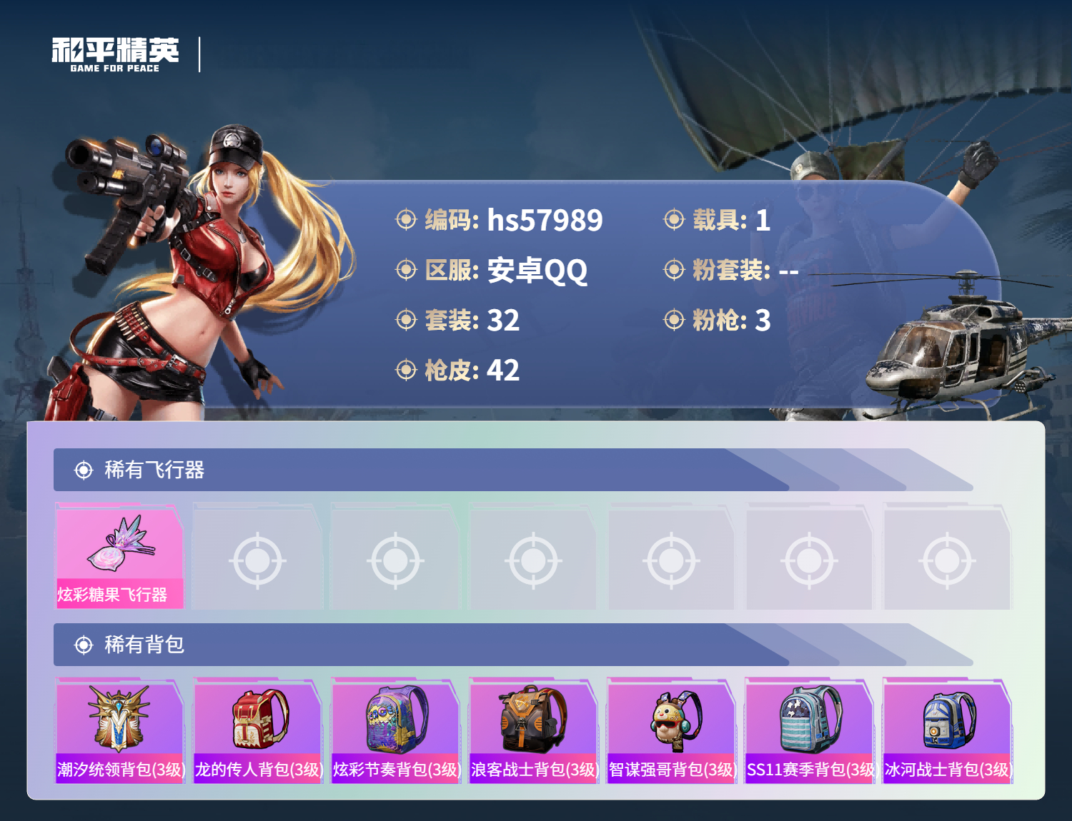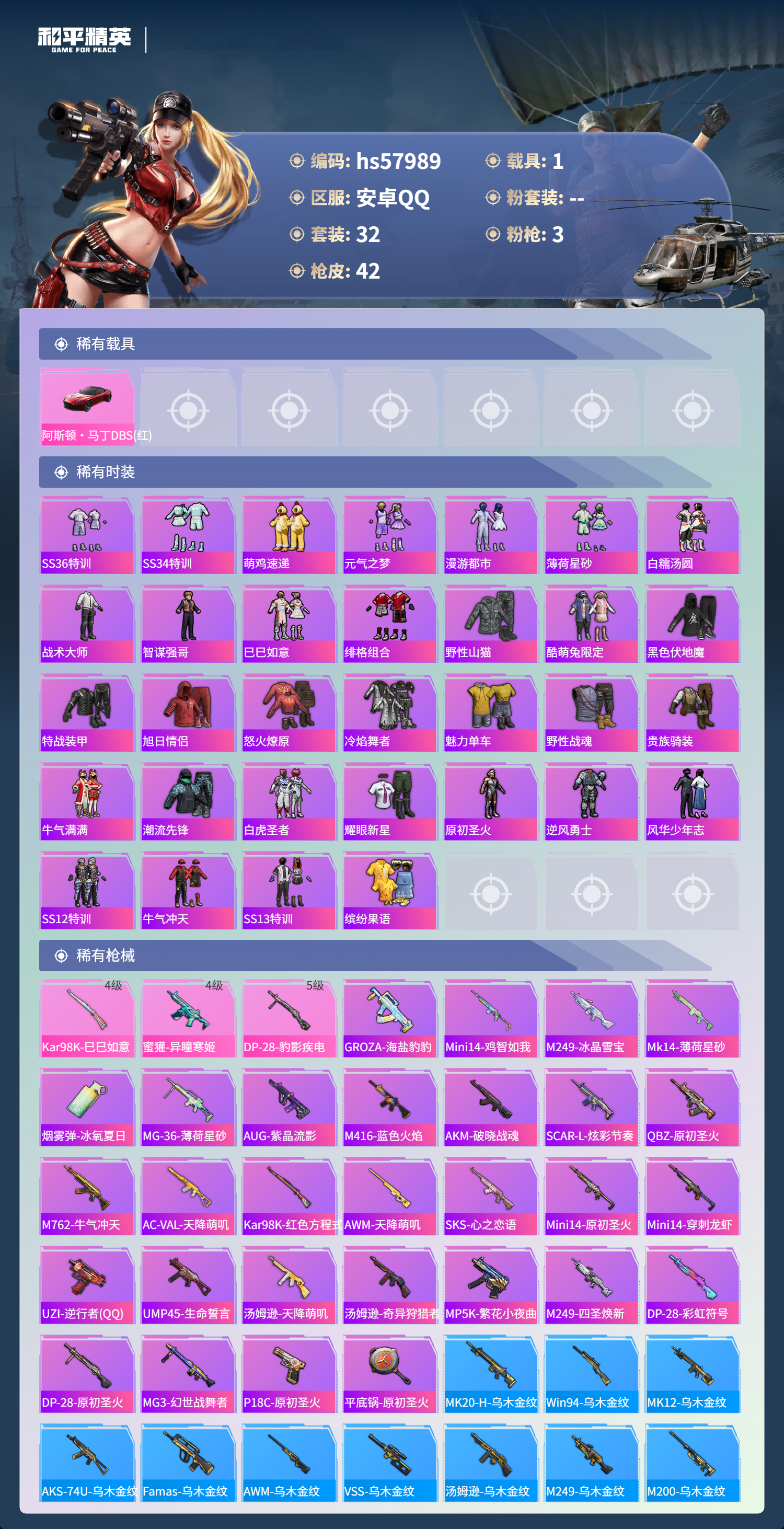 1载具-32套装-42呛皮-hs57989 安卓手q-0王牌印记-3特效呛-1载具-13587热力值-32套装-42呛皮【3特效呛】kar98k-巳巳如意/4级dp-28-豹影疾电/5级蜜獾-异瞳寒姬/4级【1稀有载具】阿斯顿·马丁dbs红【32稀有时装】ss36特训ss34特训萌鸡速递元气之梦漫游都市薄荷星砂白糯汤圆战术大师智谋强哥巳巳如意绯格组合野性山猫酷萌兔限定黑色伏地魔特战