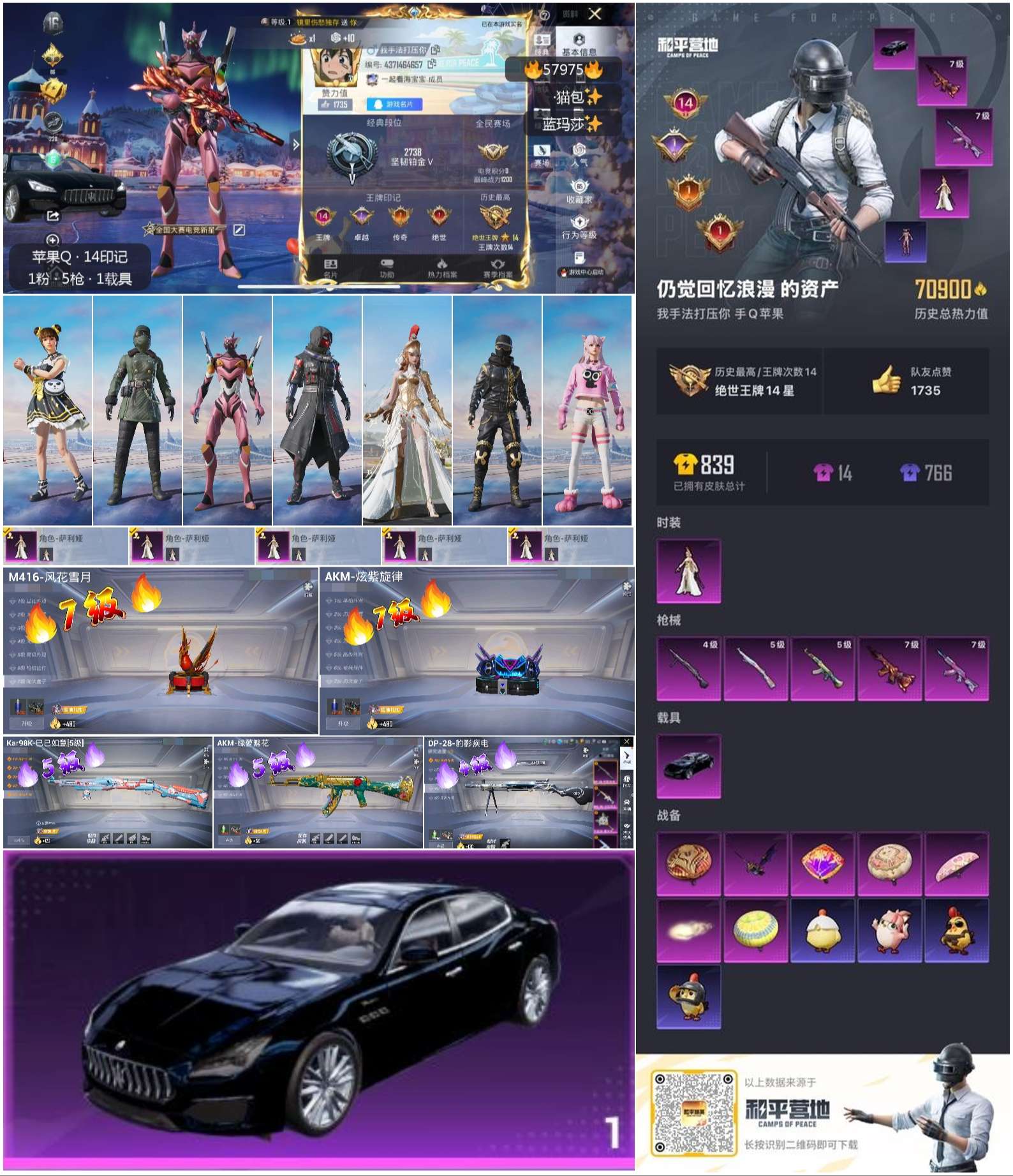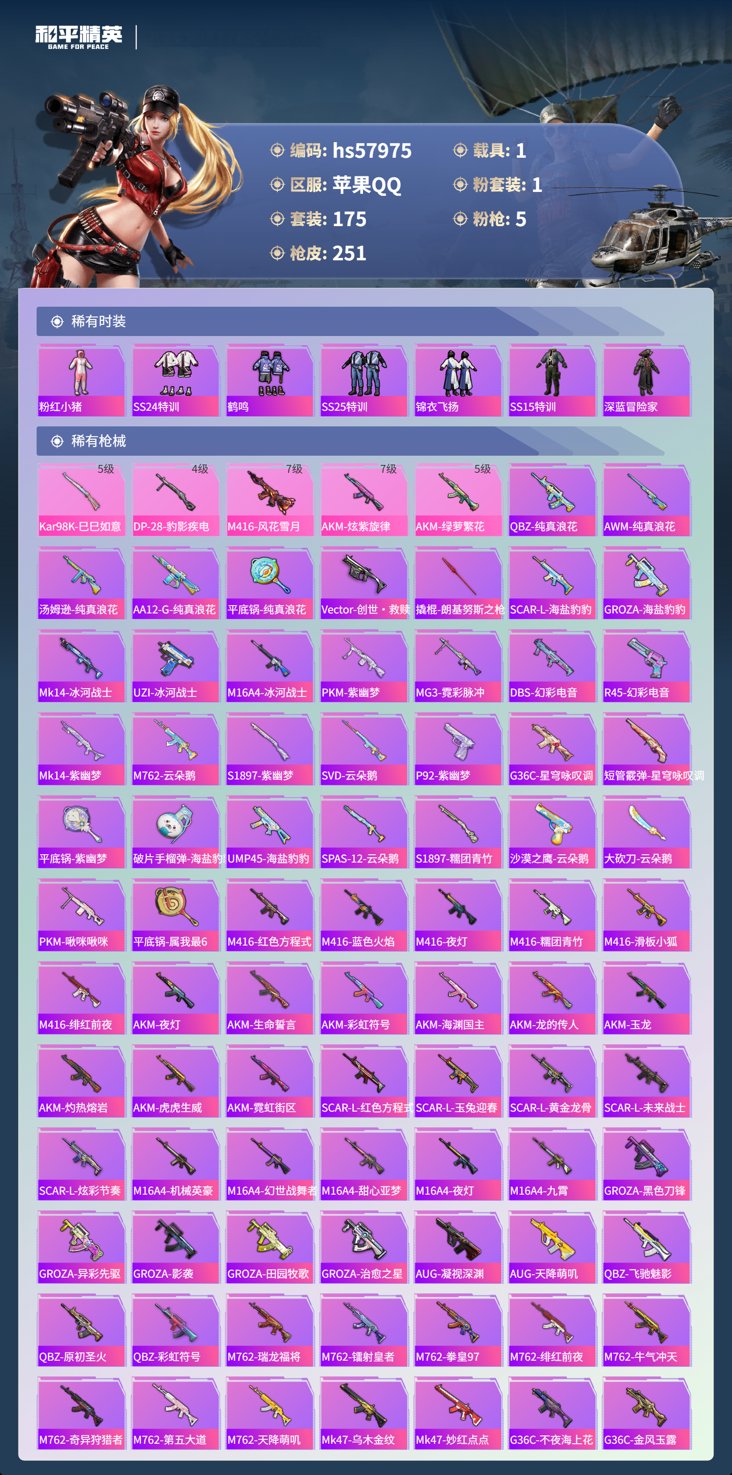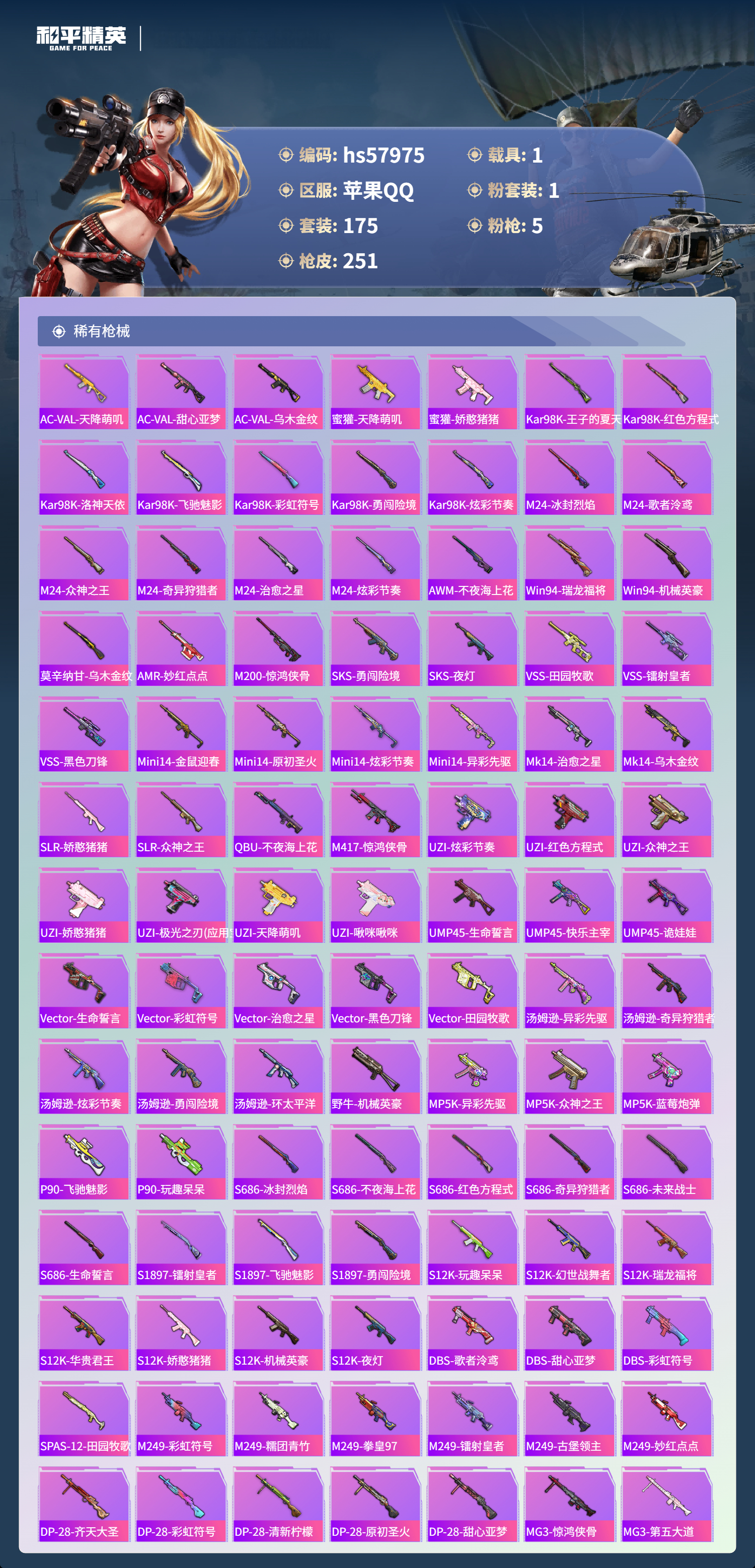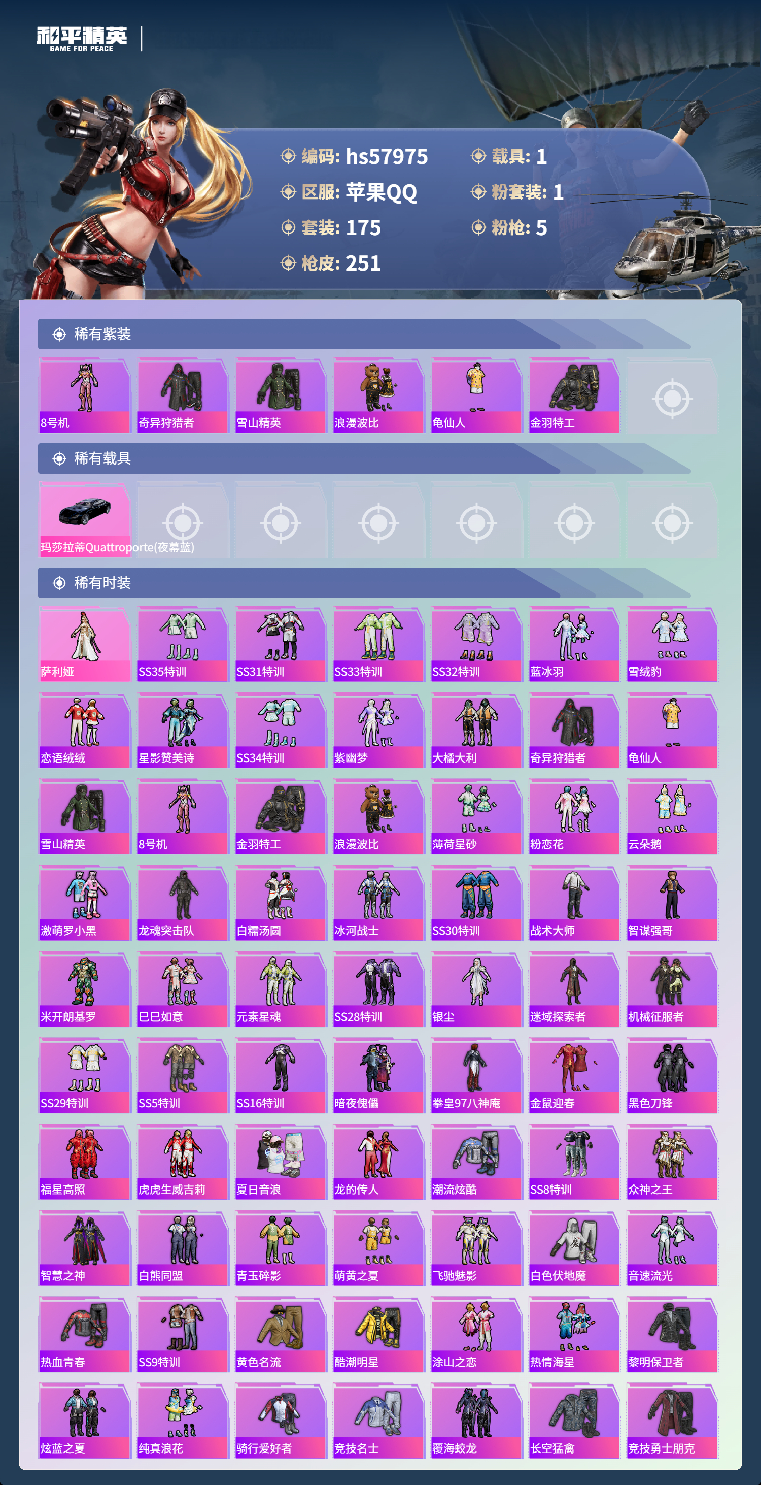 1载具-175套装-251呛皮-hs57975 苹果手q-14王牌印记-1粉装-5特效呛-1载具-70985热力值-175套装-251呛皮-1卓越印记-1传奇印记【1粉装】角色-萨利娅【5特效呛】dp-28-豹影疾电/4级akm-炫紫旋律/7级m416-风花雪月/7级akm-绿萝繁花/5级kar98k-巳巳如意/5级【6稀有紫装】8号机奇异狩猎者雪山精英浪漫波比龟仙人金羽特工【1稀有载具】玛莎拉蒂qu