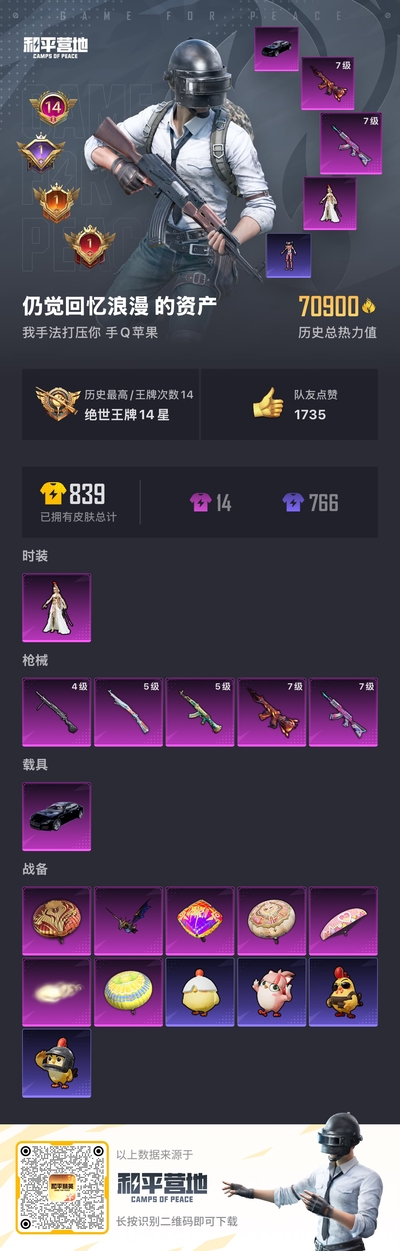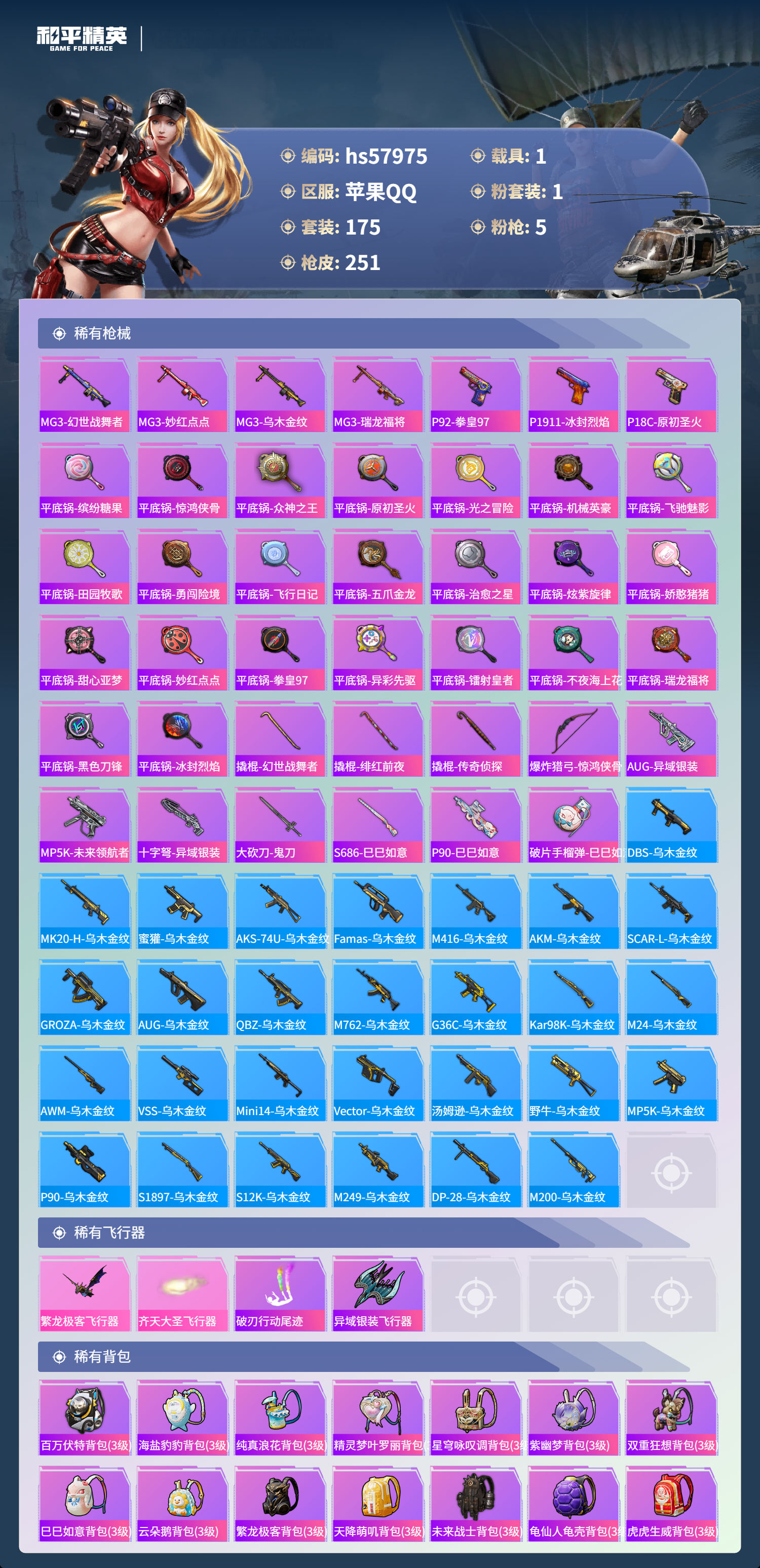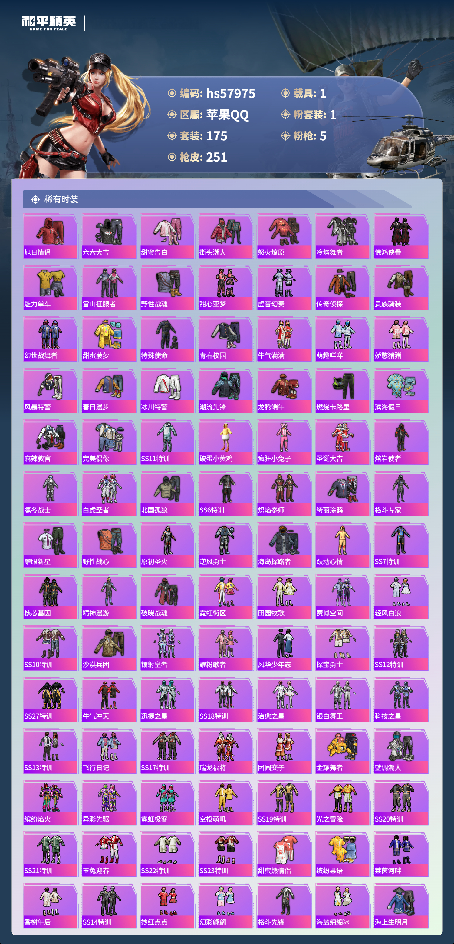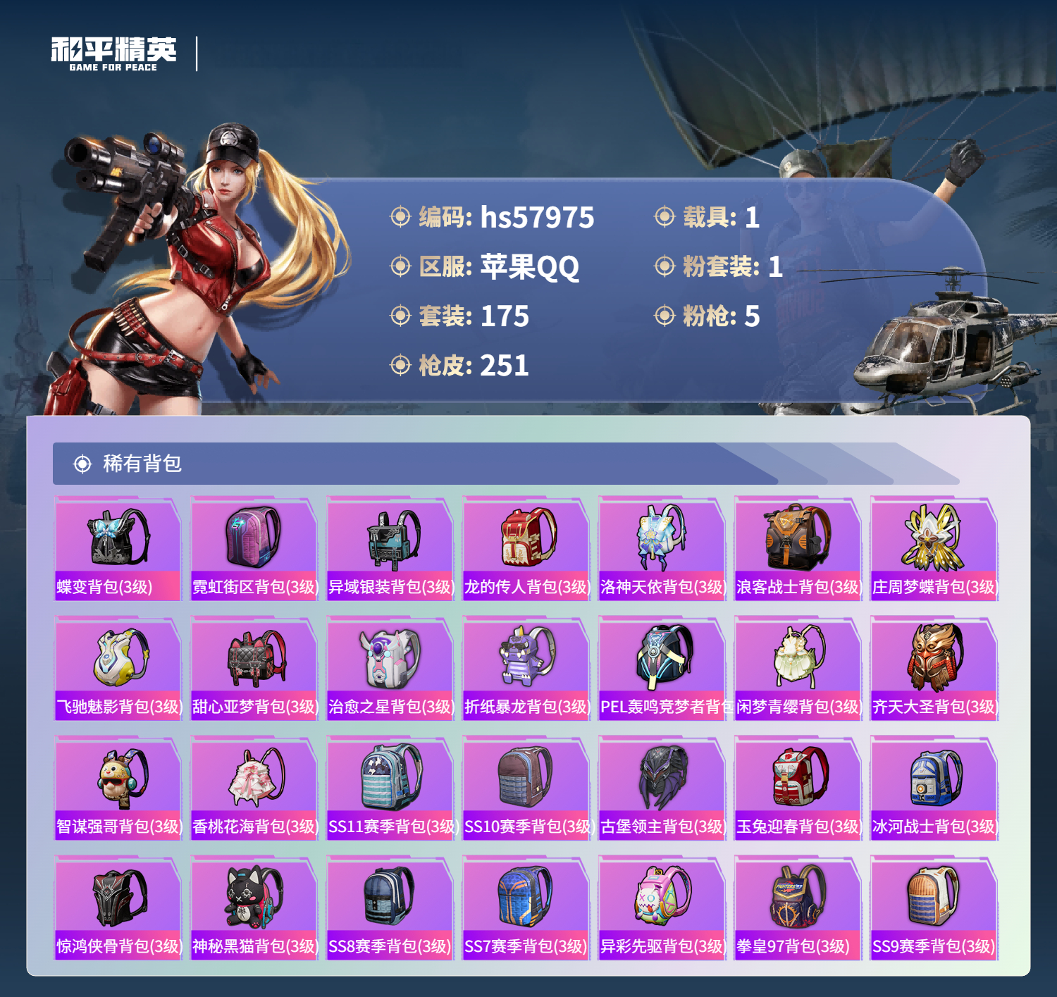 1载具-175套装-251呛皮-hs57975 苹果手q-14王牌印记-1粉装-5特效呛-1载具-70985热力值-175套装-251呛皮-1卓越印记-1传奇印记【1粉装】角色-萨利娅【5特效呛】dp-28-豹影疾电/4级akm-炫紫旋律/7级m416-风花雪月/7级akm-绿萝繁花/5级kar98k-巳巳如意/5级【6稀有紫装】8号机奇异狩猎者雪山精英浪漫波比龟仙人金羽特工【1稀有载具】玛莎拉蒂qu