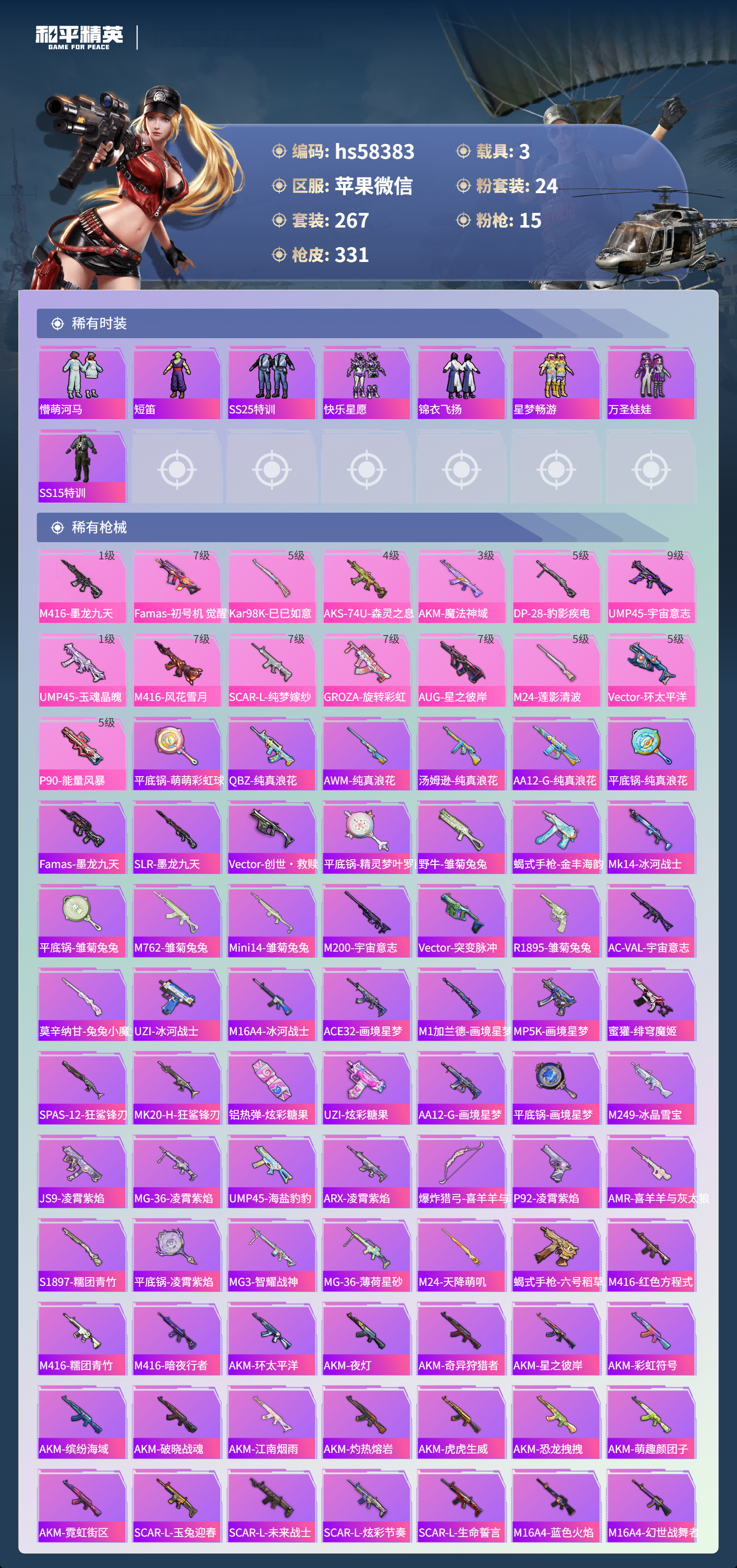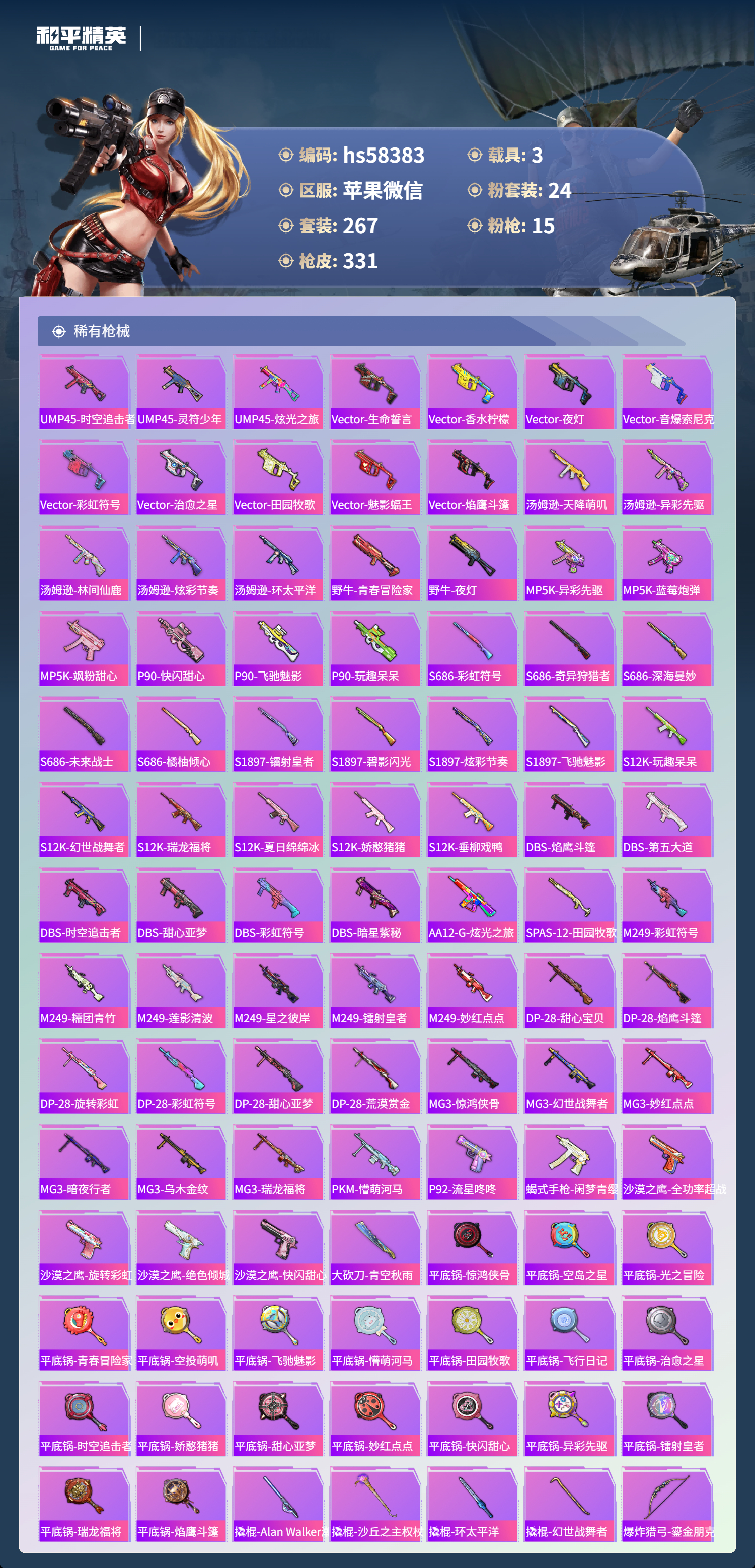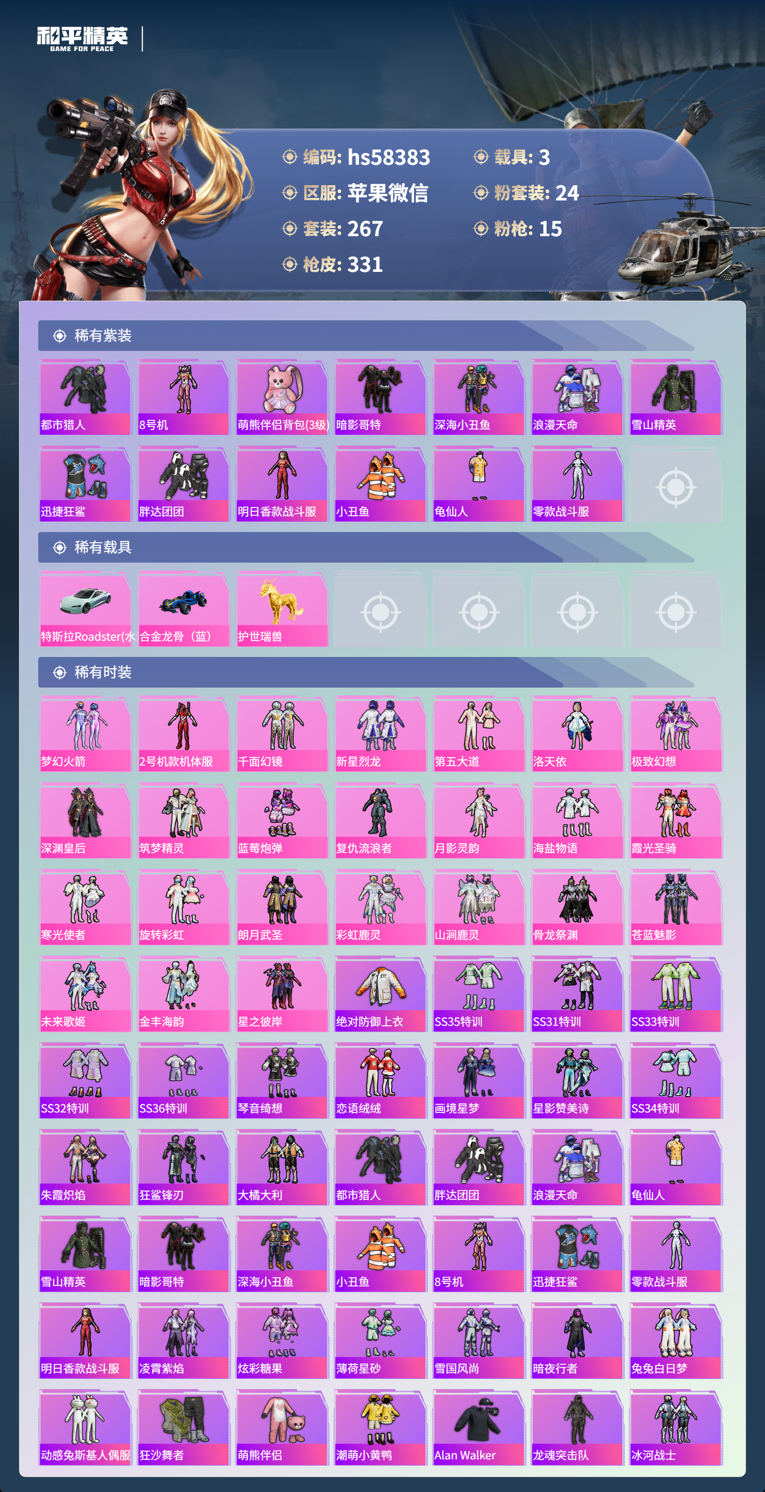 3载具-267套装-331呛皮-hs58383 苹果微信-27王牌印记-有战神框-24粉装-15特效呛-3载具-热力值-267套装-331呛皮-12卓越印记-6传奇印记【24粉装】角色-复仇流浪者套装-未来歌姬套装-星之彼岸套装-海盐物语套装-极致幻想套装-骨龙祭渊套装-苍蓝魅影套装-寒光使者套装-第五大道套装-朗月武圣套装-深渊皇后套装-山涧鹿灵套装-蓝莓炮弹套装-金丰海韵套装-霞光