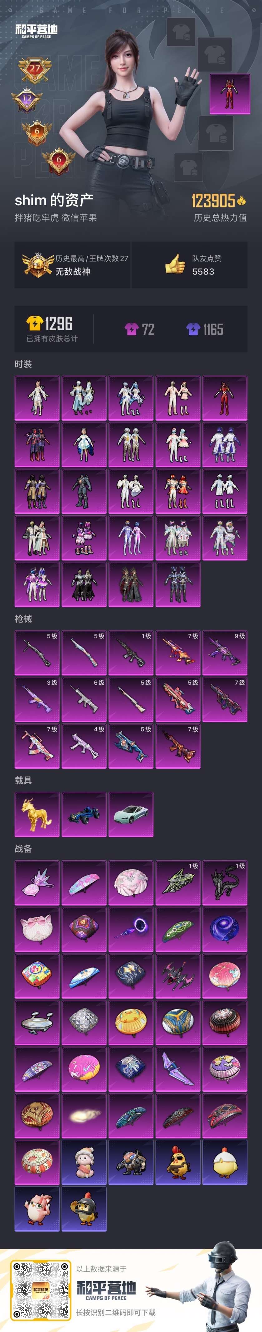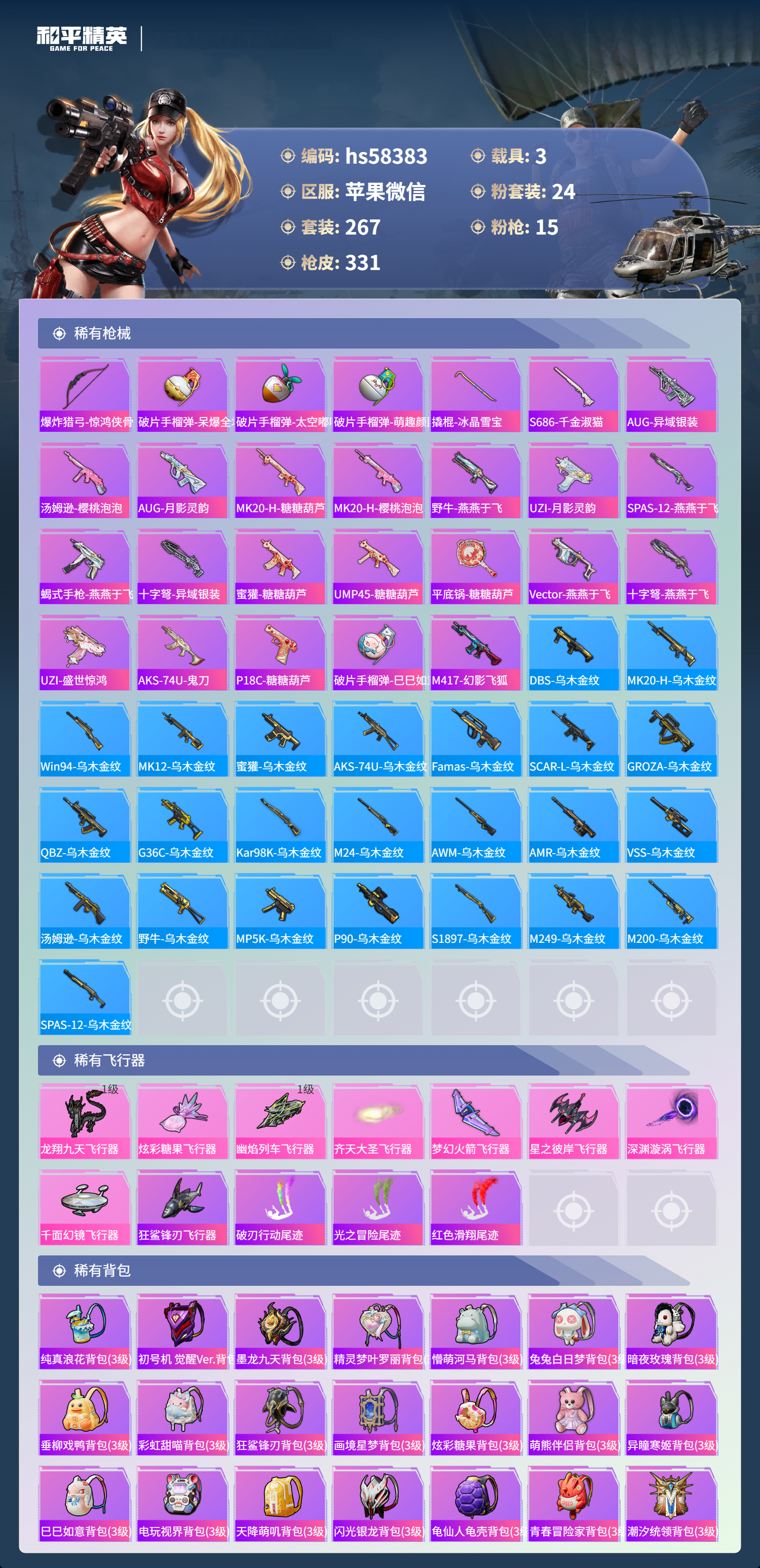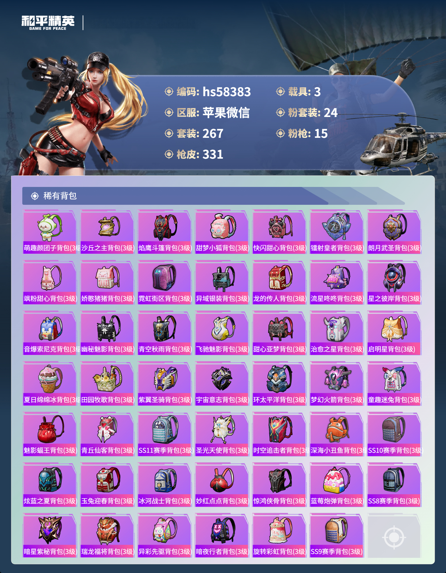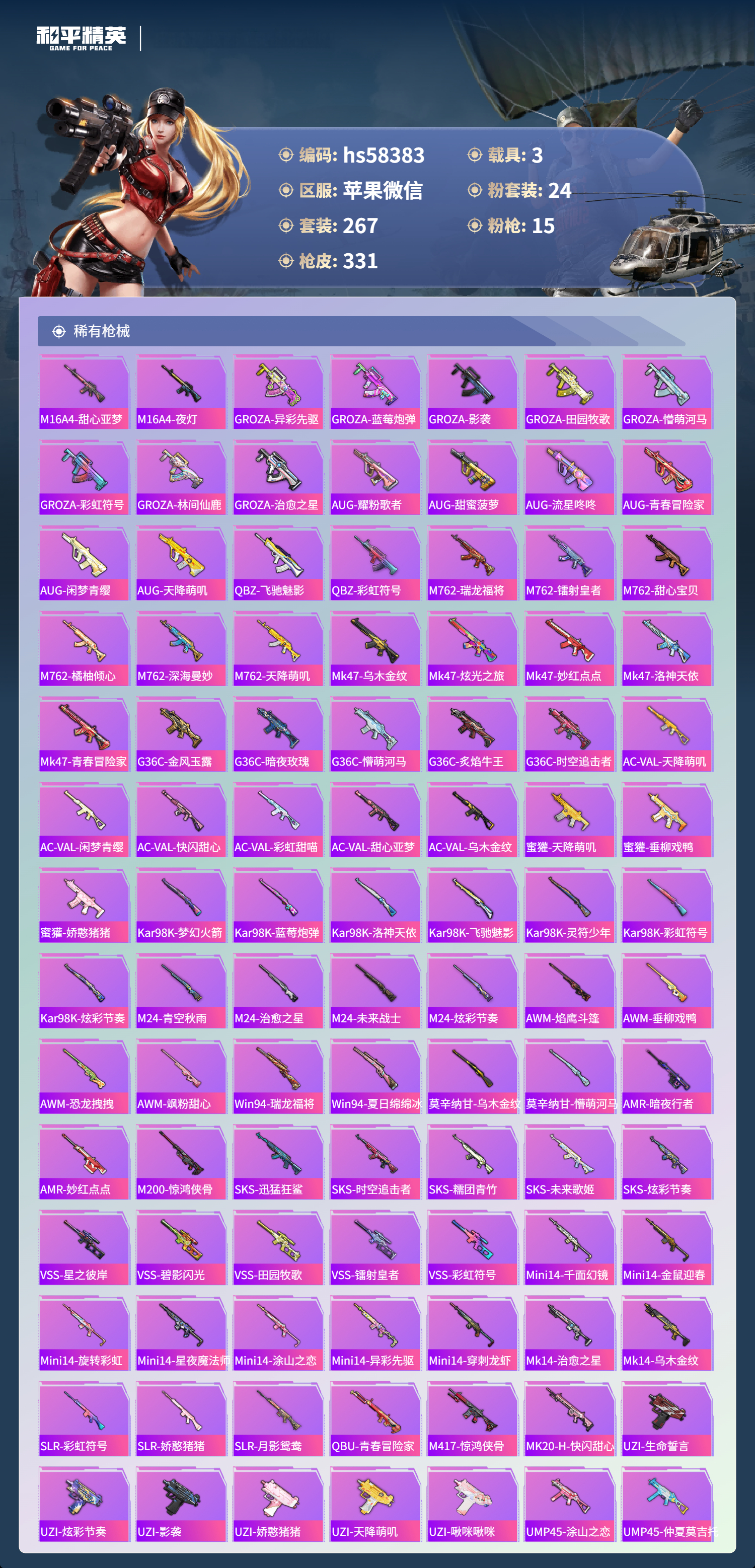 3载具-267套装-331呛皮-hs58383 苹果微信-27王牌印记-有战神框-24粉装-15特效呛-3载具-热力值-267套装-331呛皮-12卓越印记-6传奇印记【24粉装】角色-复仇流浪者套装-未来歌姬套装-星之彼岸套装-海盐物语套装-极致幻想套装-骨龙祭渊套装-苍蓝魅影套装-寒光使者套装-第五大道套装-朗月武圣套装-深渊皇后套装-山涧鹿灵套装-蓝莓炮弹套装-金丰海韵套装-霞光
