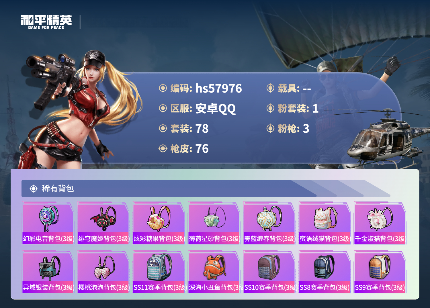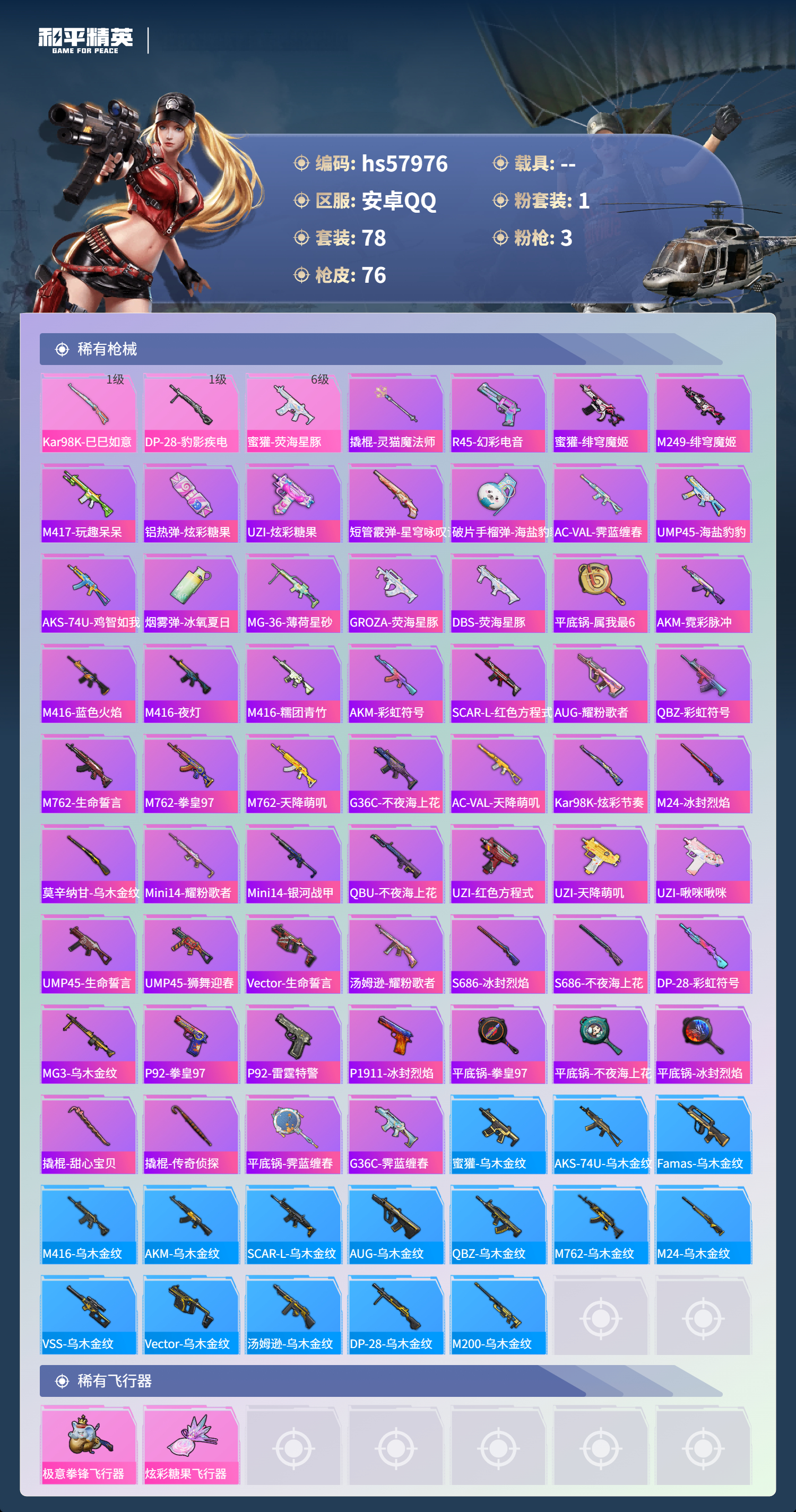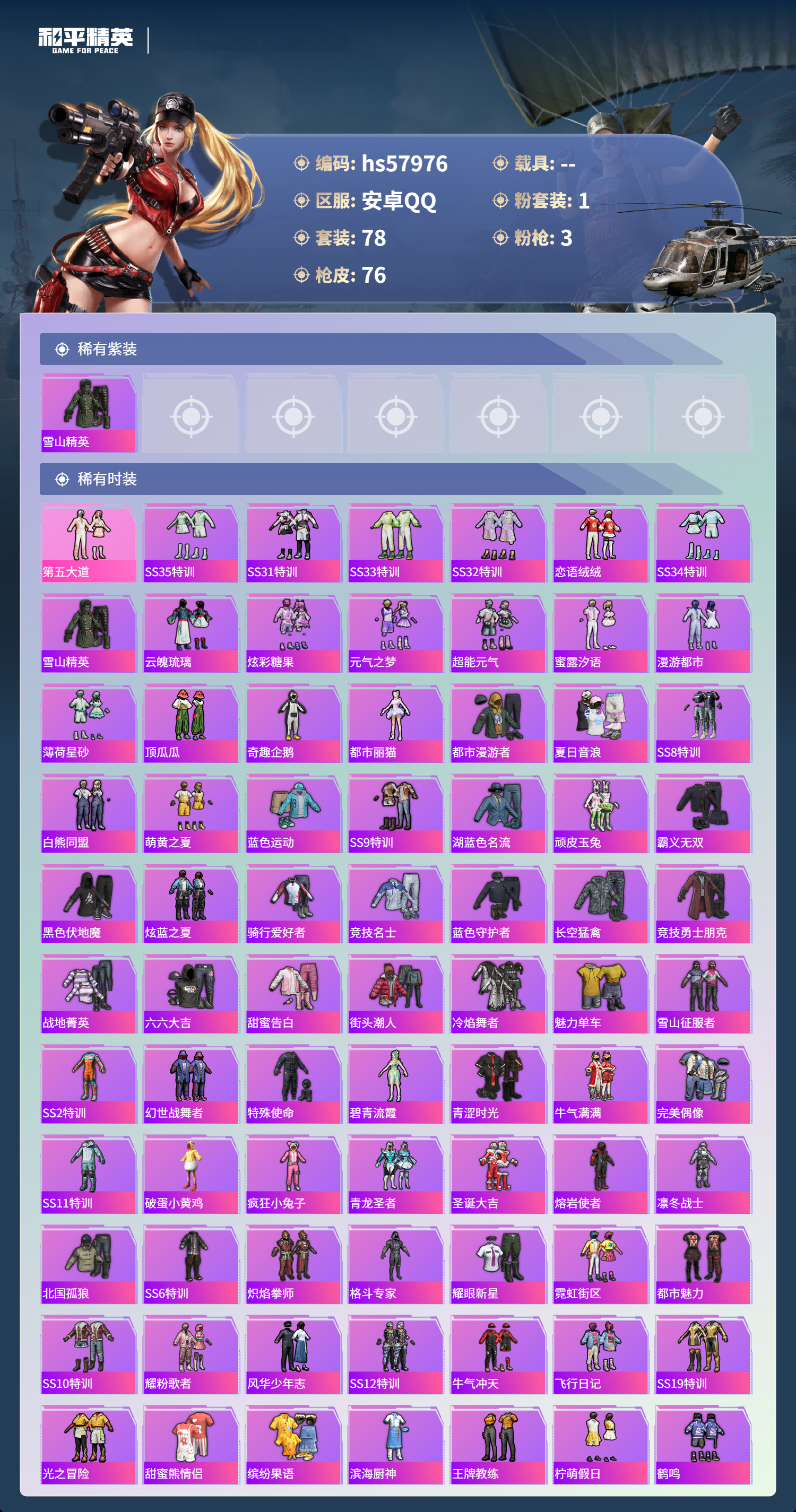 0载具-78套装-76呛皮-hs57976 安卓手q-1王牌印记-1粉装-3特效呛-24581热力值-78套装-76呛皮【1粉装】套装-第五大道【3特效呛】kar98k-巳巳如意/1级dp-28-豹影疾电/1级蜜獾-荧海星豚/6级【1稀有紫装】雪山精英【77稀有时装】第五大道ss35特训ss31特训ss33特训ss32特训恋语绒绒ss34特训雪山精英云魄琉璃炫彩糖果元气之梦超能元气蜜露汐