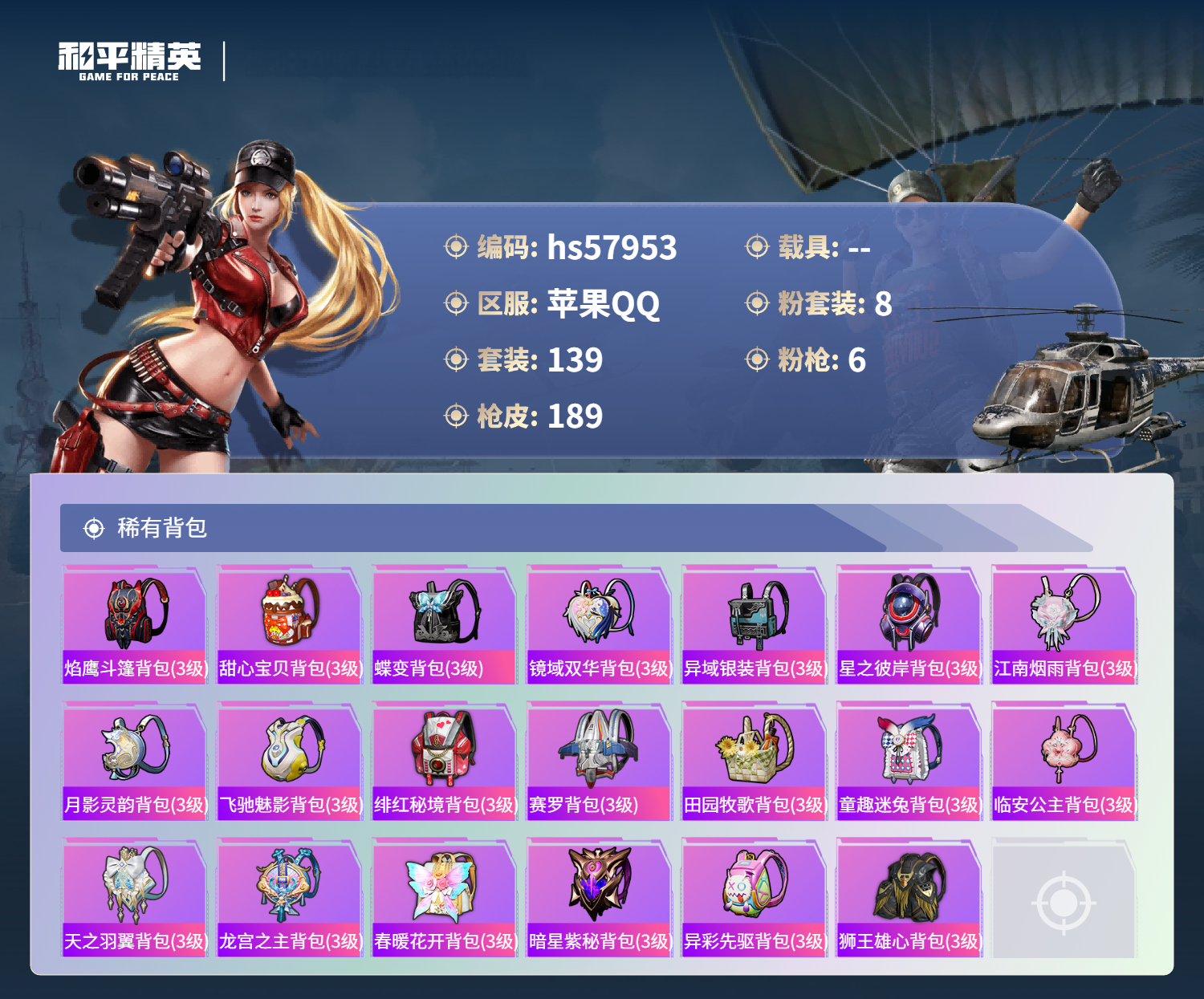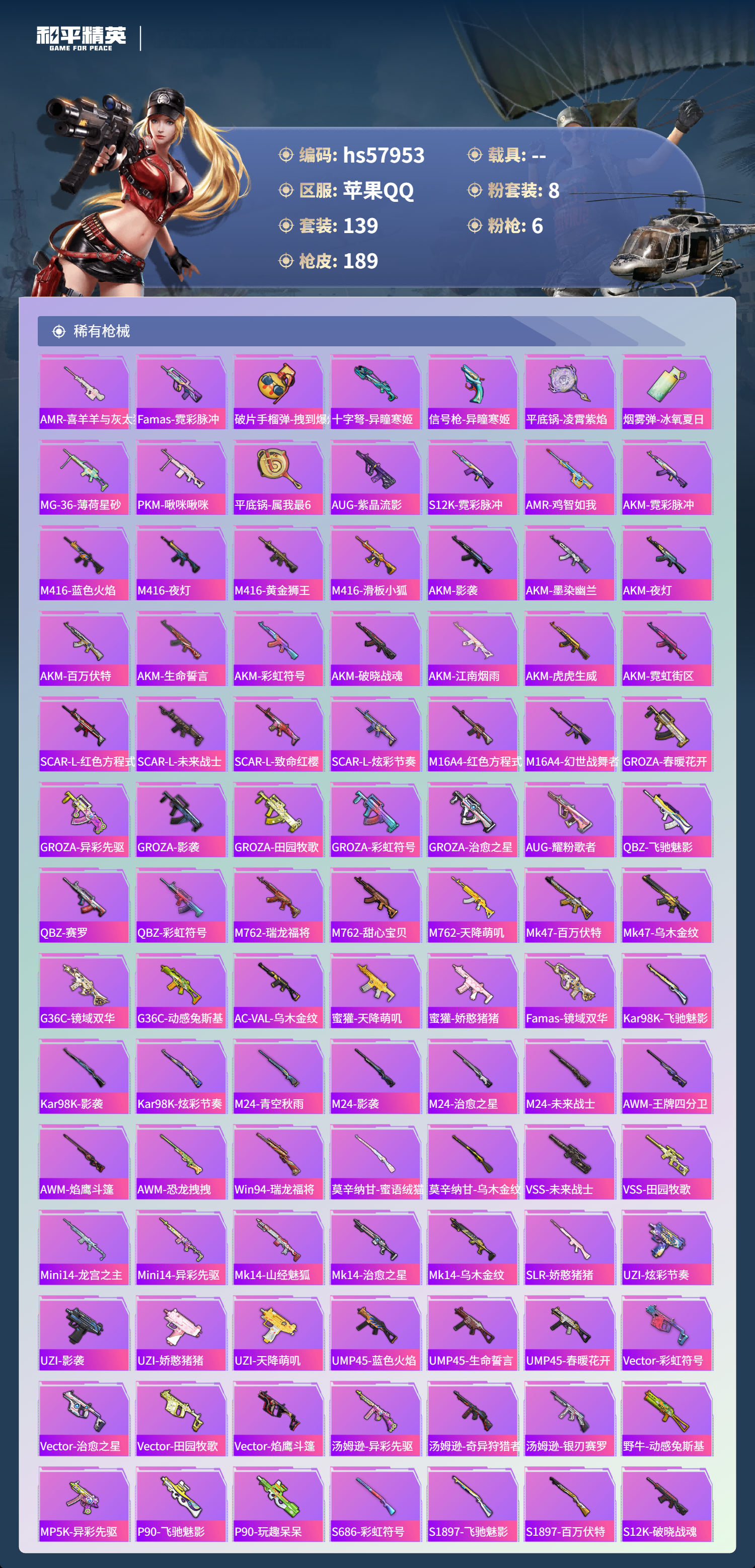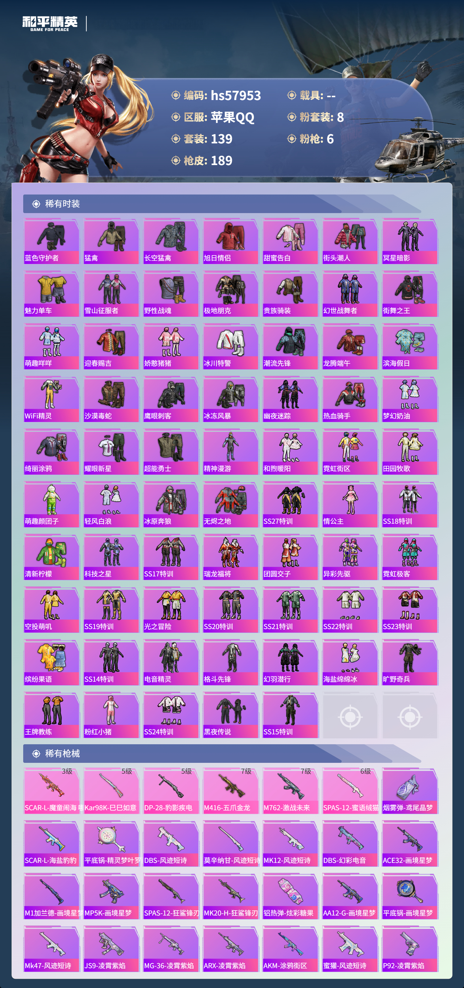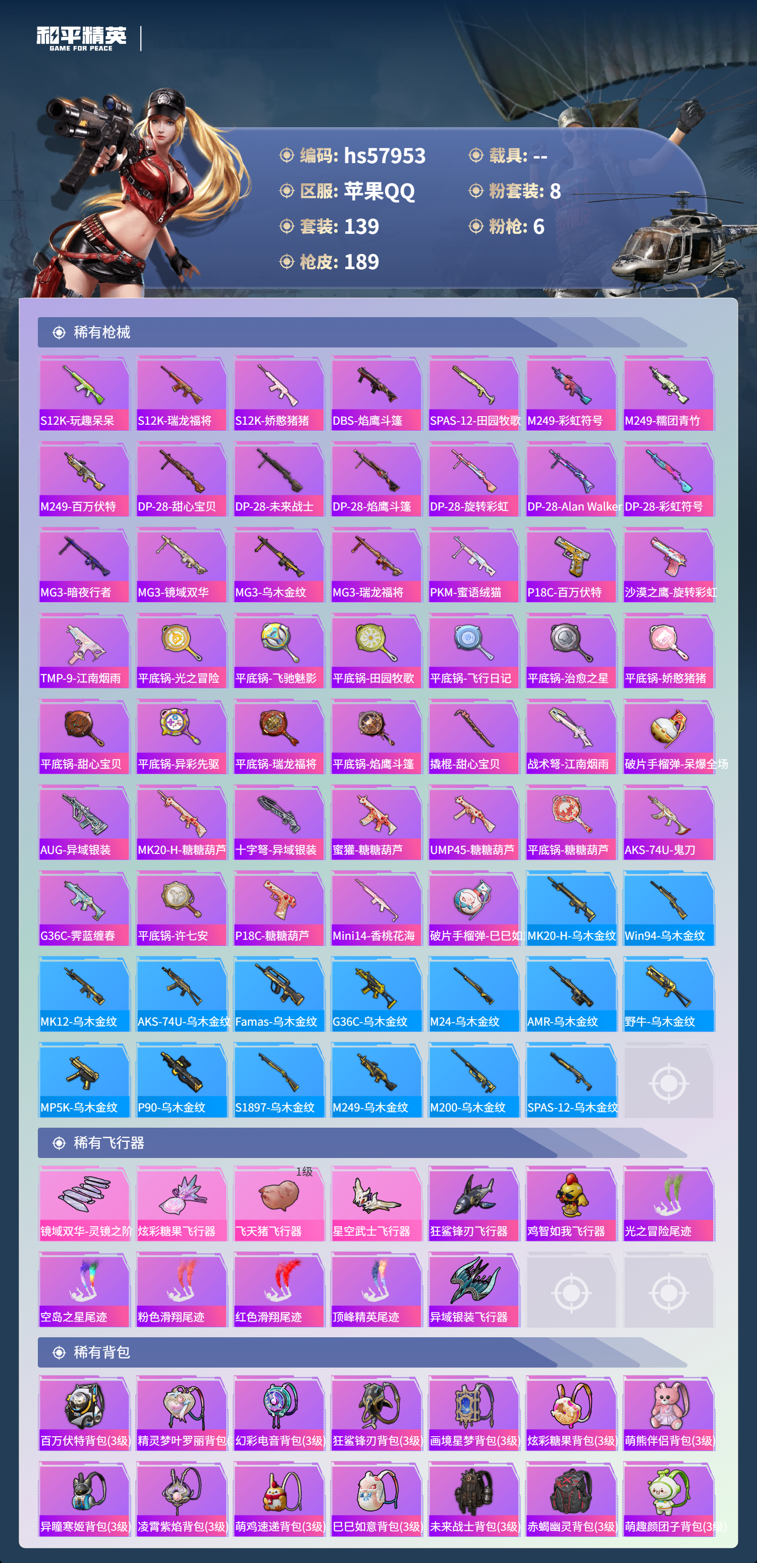 0载具-139套装-189呛皮-hs57953 苹果手q-7王牌印记-8粉装-6特效呛-63310热力值-139套装-189呛皮-1卓越印记-1传奇印记【8粉装】套装-蜜语绒猫角色-冰魄套装-宝贝奶油派角色-智耀战神套装-翡翠骑士套装-未来战士套装-天使彩虹糖套装-甜心巧克力【6特效呛】dp-28-豹影疾电/5级m416-五爪金龙/7级scar-l-魔童闹海 哪吒/3级spas-12-蜜语绒猫/6级