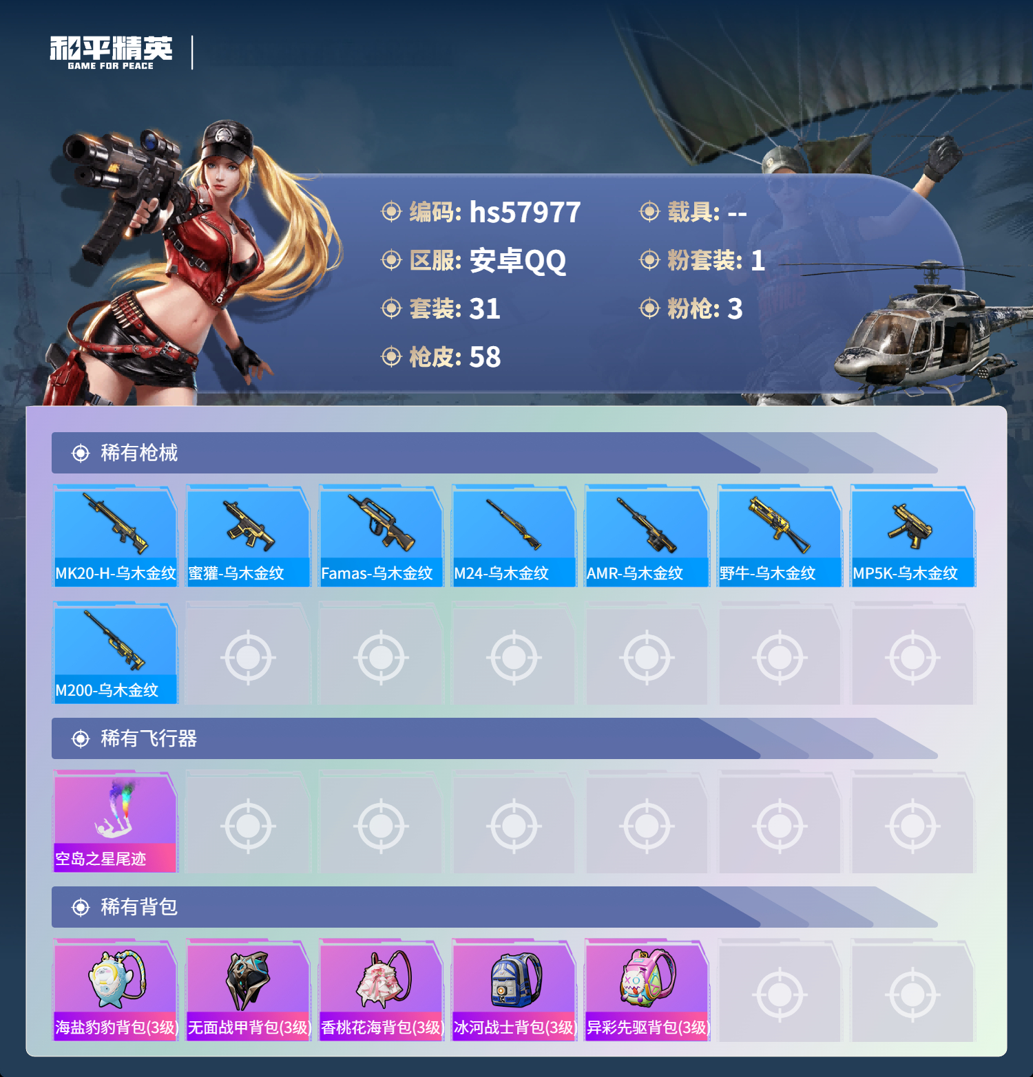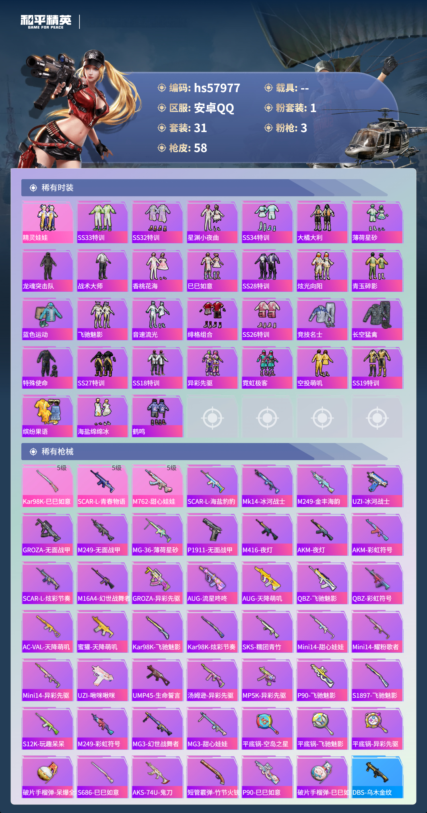 0载具-31套装-58呛皮-hs57977 安卓手q-3王牌印记-1粉装-3特效呛-16691热力值-31套装-58呛皮【1粉装】套装-精灵娃娃【3特效呛】m762-甜心娃娃/5级kar98k-巳巳如意/5级scar-l-青春物语/5级【31稀有时装】ss33特训ss32特训星渊小夜曲ss34特训大橘大利薄荷星砂精灵娃娃龙魂突击队战术大师香桃花海巳巳如意ss28特训炫光向阳青玉碎影蓝色