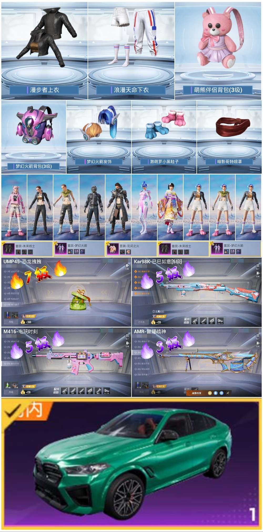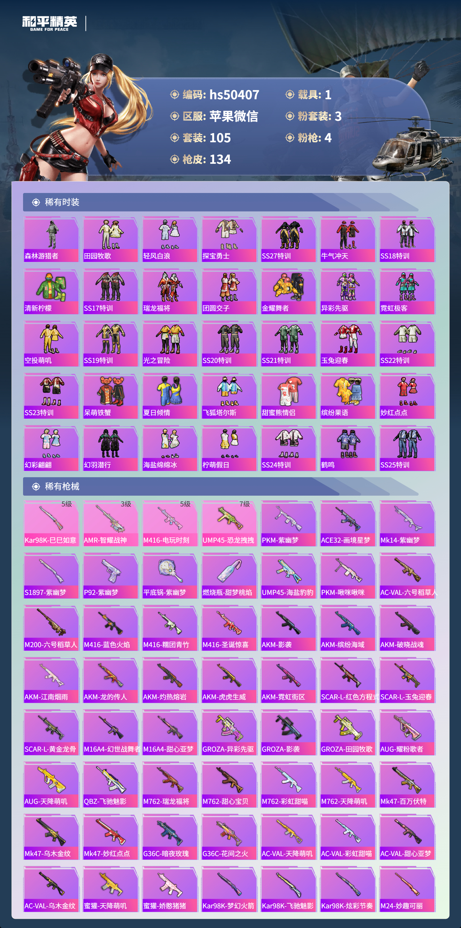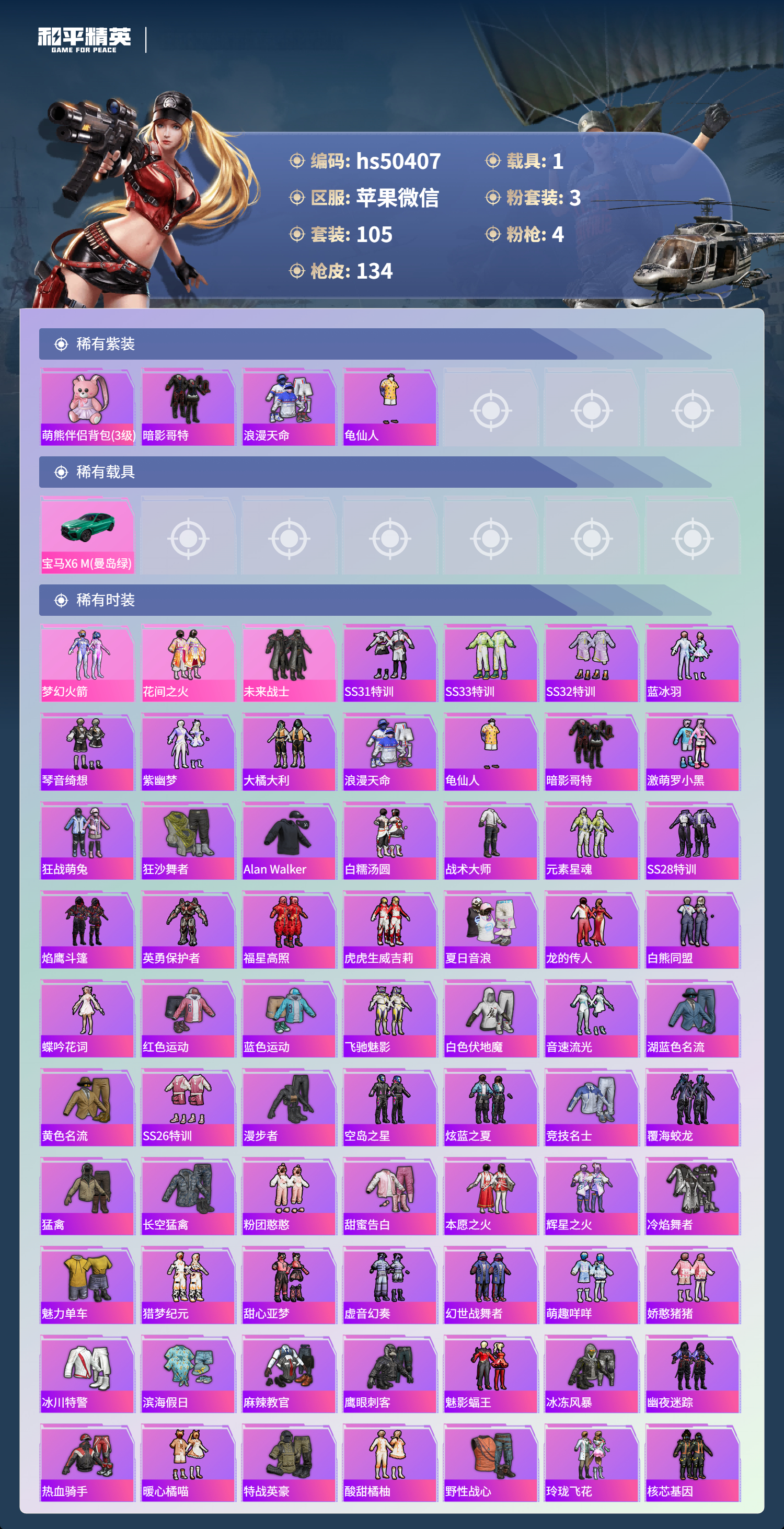 1载具-105套装-134呛皮-hs50407 苹果微信-6王牌印记-3粉装-4特效呛-1载具-43812热力值-105套装-134呛皮【3粉装】套装-未来战士套装-梦幻火箭套装-花间之火【4特效呛】kar98k-巳巳如意/5级amr-智耀战神/3级ump45-恐龙拽拽/7级m416-电玩时刻/5级【4稀有紫装】萌熊伴侣背包3级暗影哥特浪漫天命龟仙人【1稀有载具】宝马x6 m曼岛绿【105稀有