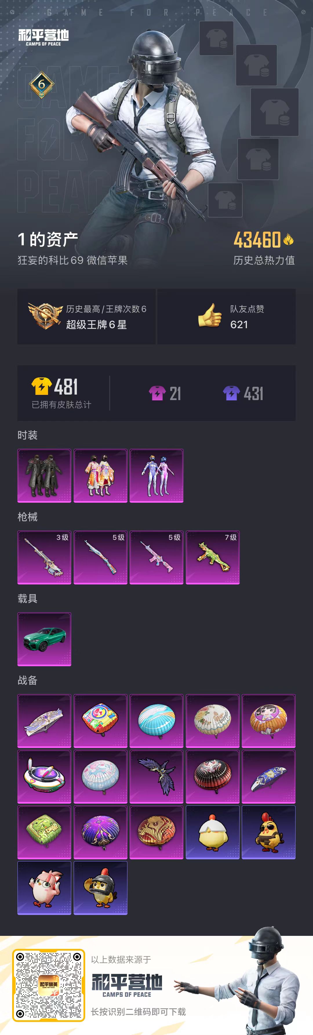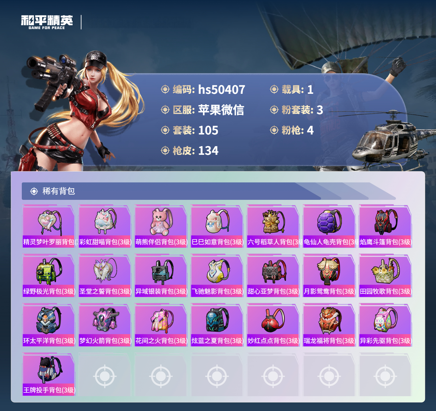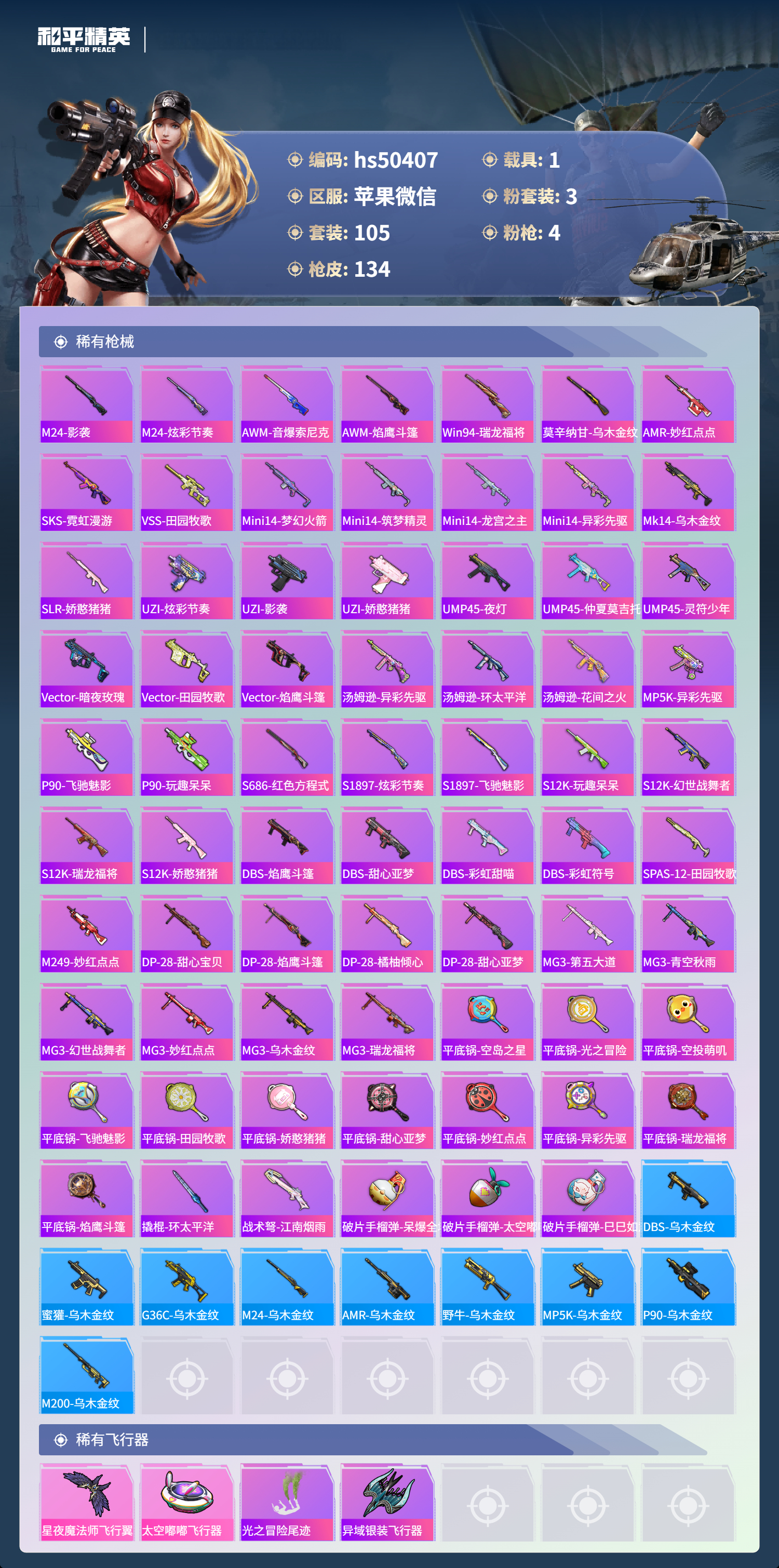 1载具-105套装-134呛皮-hs50407 苹果微信-6王牌印记-3粉装-4特效呛-1载具-43812热力值-105套装-134呛皮【3粉装】套装-未来战士套装-梦幻火箭套装-花间之火【4特效呛】kar98k-巳巳如意/5级amr-智耀战神/3级ump45-恐龙拽拽/7级m416-电玩时刻/5级【4稀有紫装】萌熊伴侣背包3级暗影哥特浪漫天命龟仙人【1稀有载具】宝马x6 m曼岛绿【105稀有