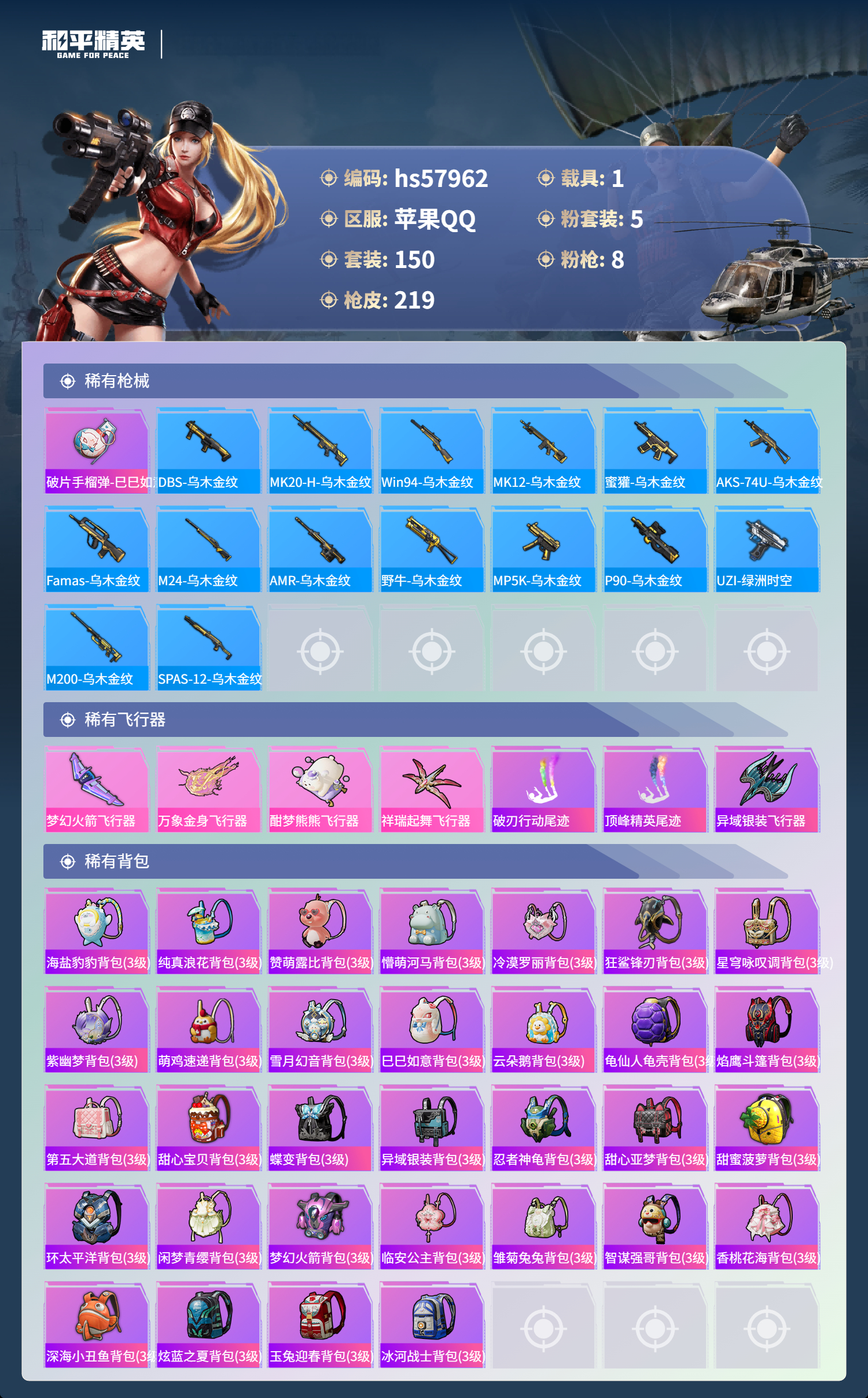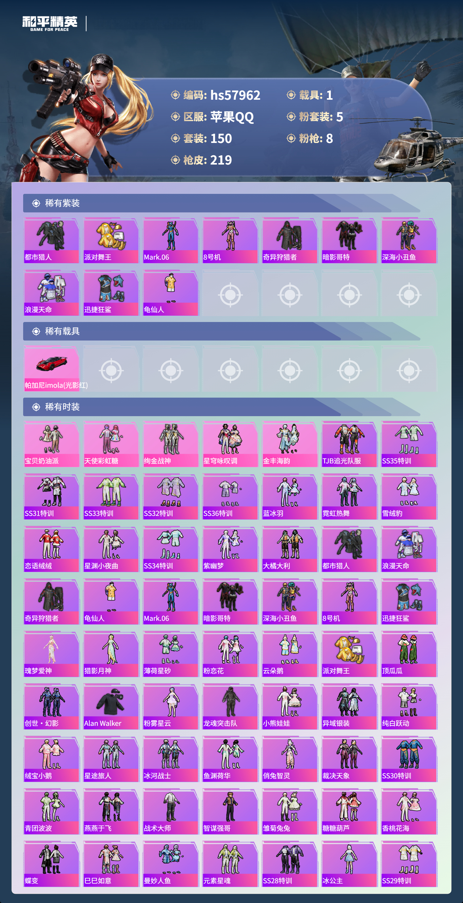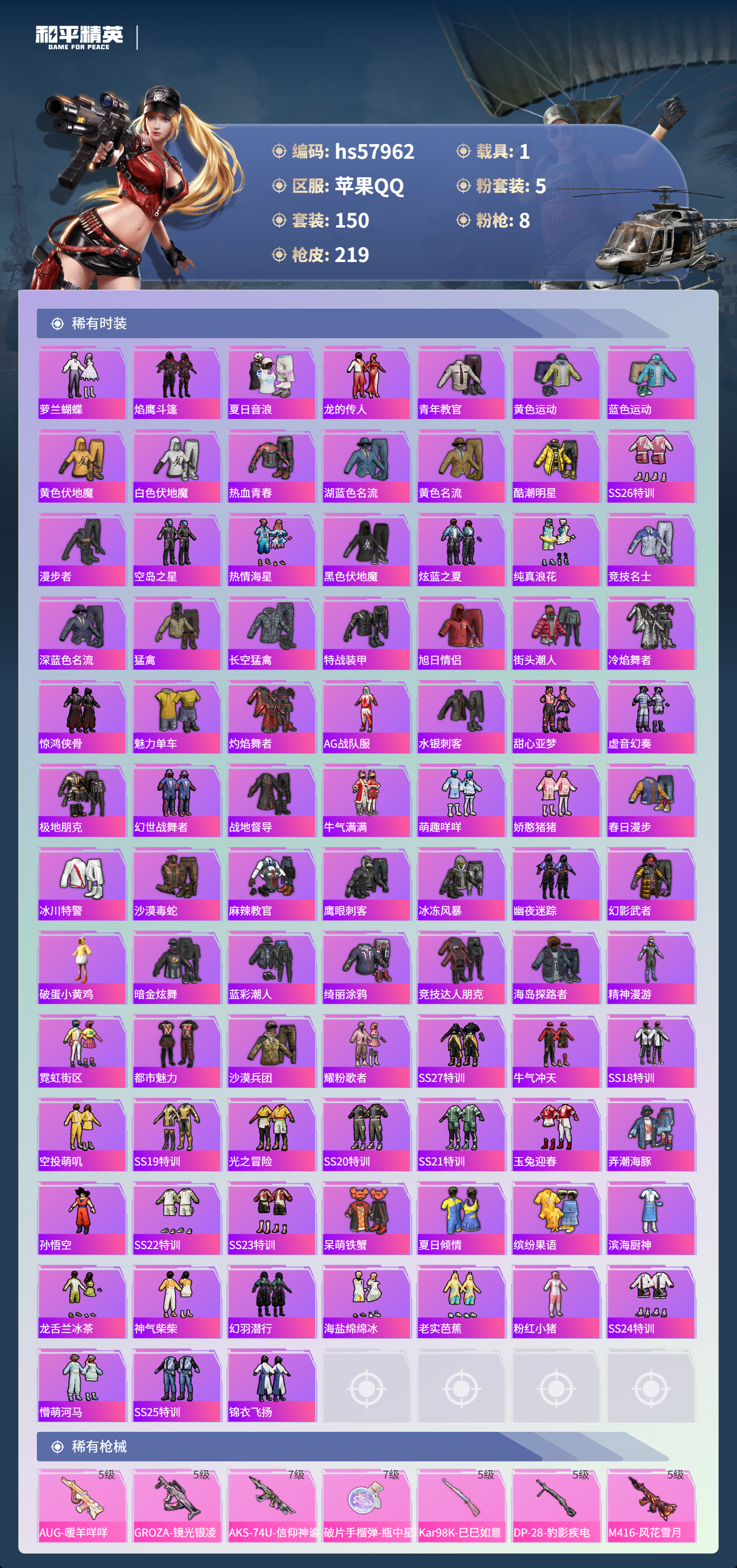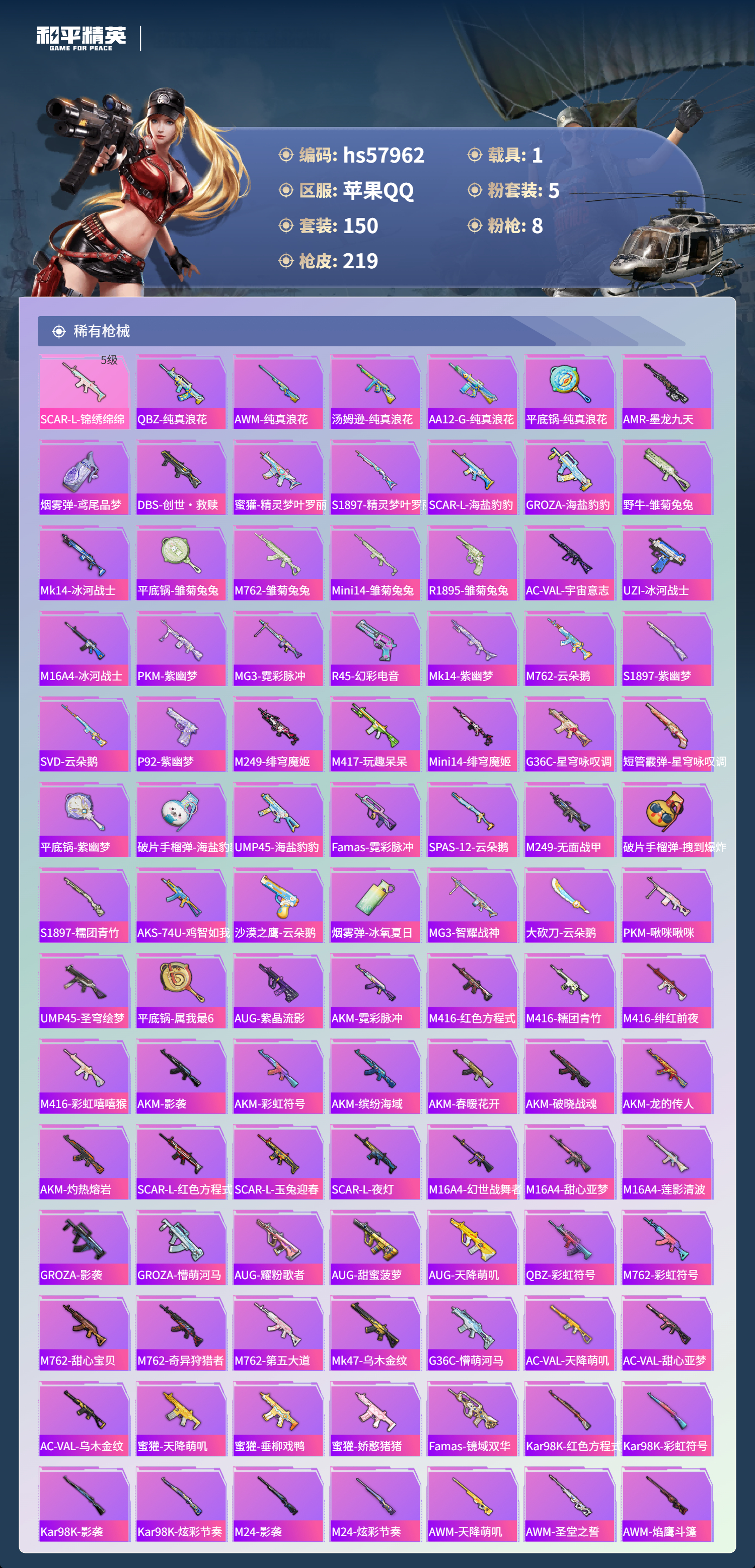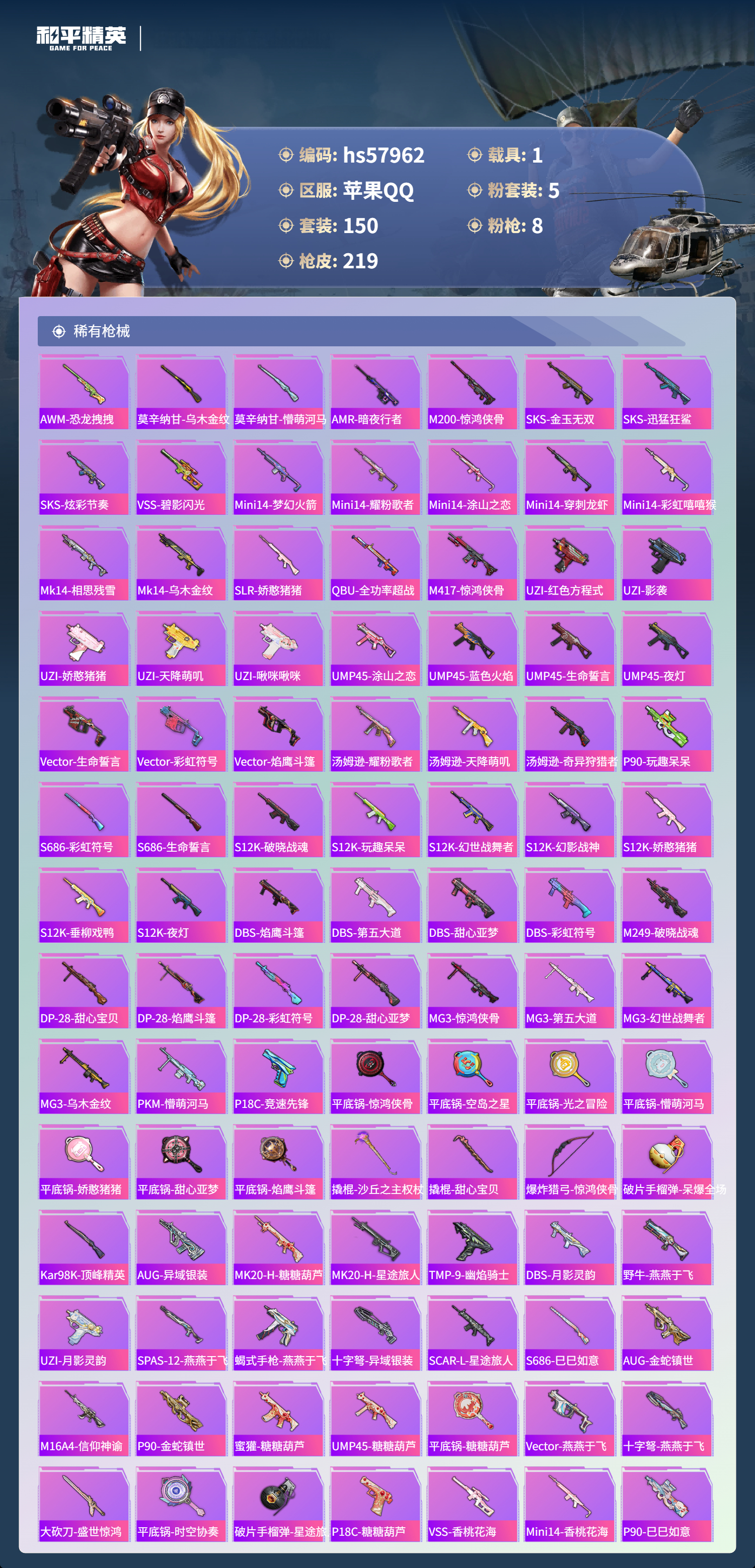 1载具-150套装-219呛皮-hs57962 苹果手q-17王牌印记-5粉装-8特效呛-1载具-65366热力值-150套装-219呛皮-4卓越印记-2传奇印记【5粉装】套装-绚金战神套装-金丰海韵套装-天使彩虹糖套装-宝贝奶油派套装-星穹咏叹调【8特效呛】groza-镜光银凌/5级m416-风花雪月/5级kar98k-巳巳如意/5级aks-74u-信仰神谕/7级dp-28-豹影疾电/5级scar-l-
