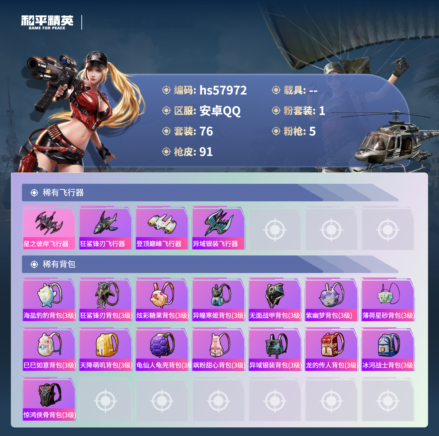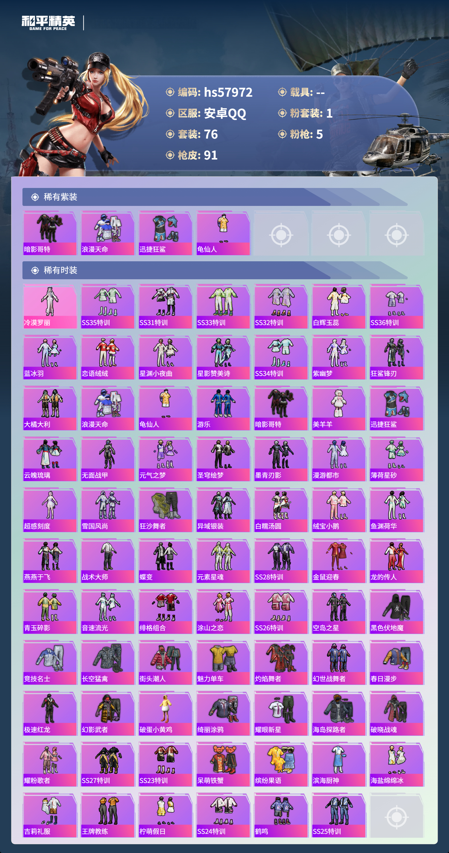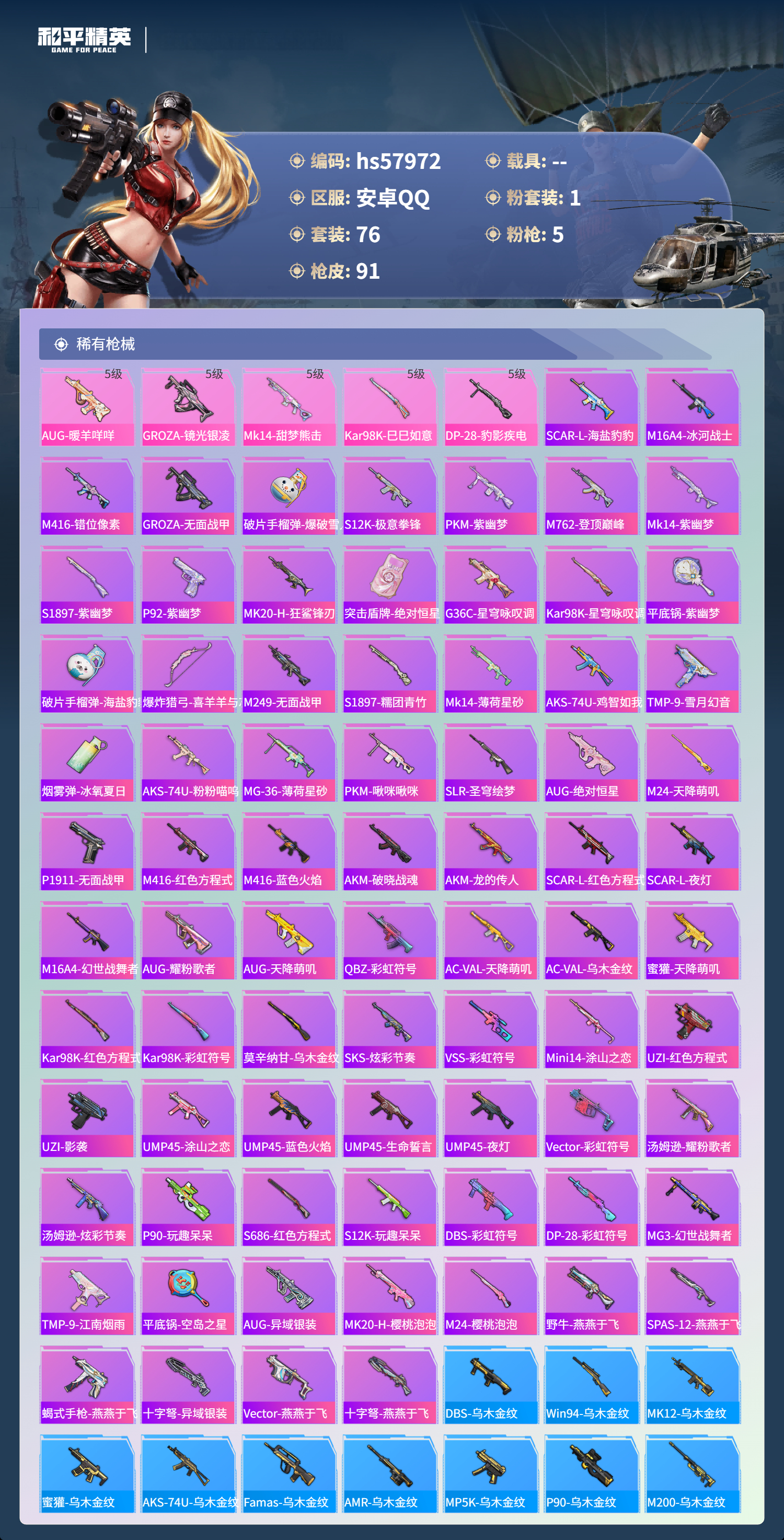 0载具-76套装-91呛皮-hs57972 安卓手q-4王牌印记-1粉装-5特效呛-27406热力值-76套装-91呛皮-1卓越印记【1粉装】角色-冷漠罗丽【5特效呛】aug-暖羊咩咩/5级mk14-甜梦熊击/5级dp-28-豹影疾电/5级kar98k-巳巳如意/5级groza-镜光银凌/5级【4稀有紫装】暗影哥特浪漫天命迅捷狂鲨龟仙人【76稀有时装】冷漠罗丽ss35特训ss31特训ss33特训
