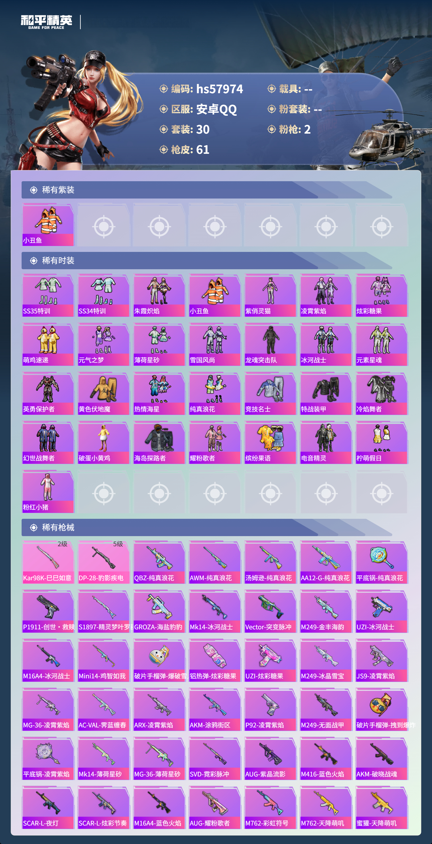 hs57974 安卓手q-0王牌印记-2特效呛-13245热力值-30套装-61呛皮【2特效呛】kar98k-巳巳如意/2级dp-28-豹影疾电/5级【1稀有紫装】小丑鱼【29稀有时装】ss35特训ss34特训朱霞炽焰小丑鱼紫俏灵猫凌霄紫焰炫彩糖果萌鸡速递元气之梦薄荷星砂雪国风尚龙魂突击队冰河战士元素星魂英勇保护者黄色伏地魔热情海星纯真浪花竞技名士特