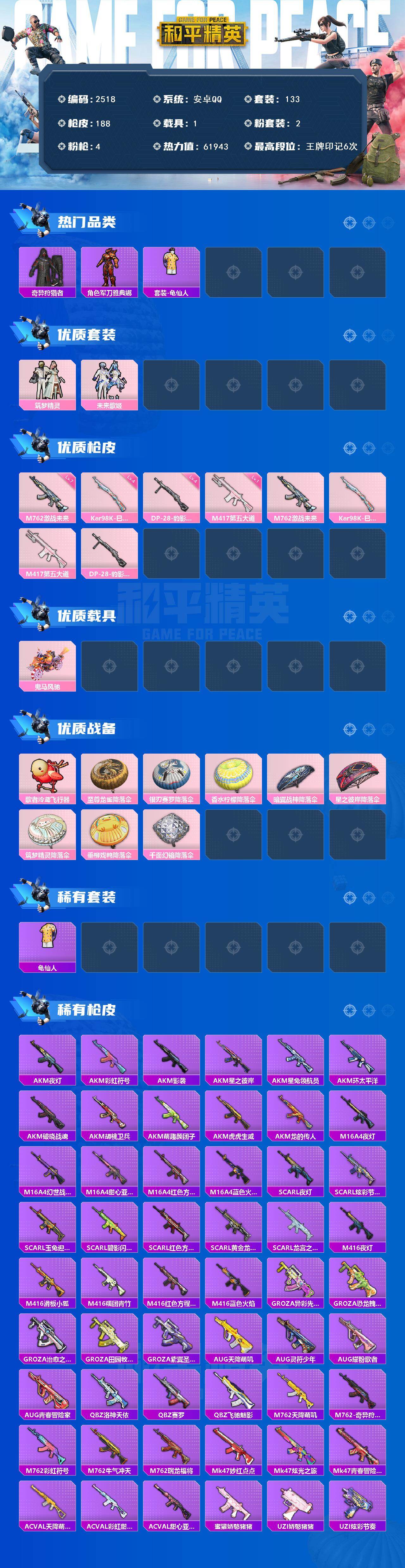 1载具-133套装-188呛皮-133套装/呛械4/装备240/载具1/战备104/王牌印记6/热力值61943/七级m762-激战未来/四级kar98k-巳巳如意/m417-第五大道/四级dp-28-豹影疾电/奇异狩猎者/军刀雅典娜/套装-龟仙人/筑梦精灵/未来歌姬/鬼马风驰/m762-激战未来/kar98k-巳巳如意/dp-28-豹影疾电/歌者泠鸢飞行器/至尊龙雀降落伞/银刃赛罗降落伞/香水柠檬降落伞/暗翼战神降落伞/星