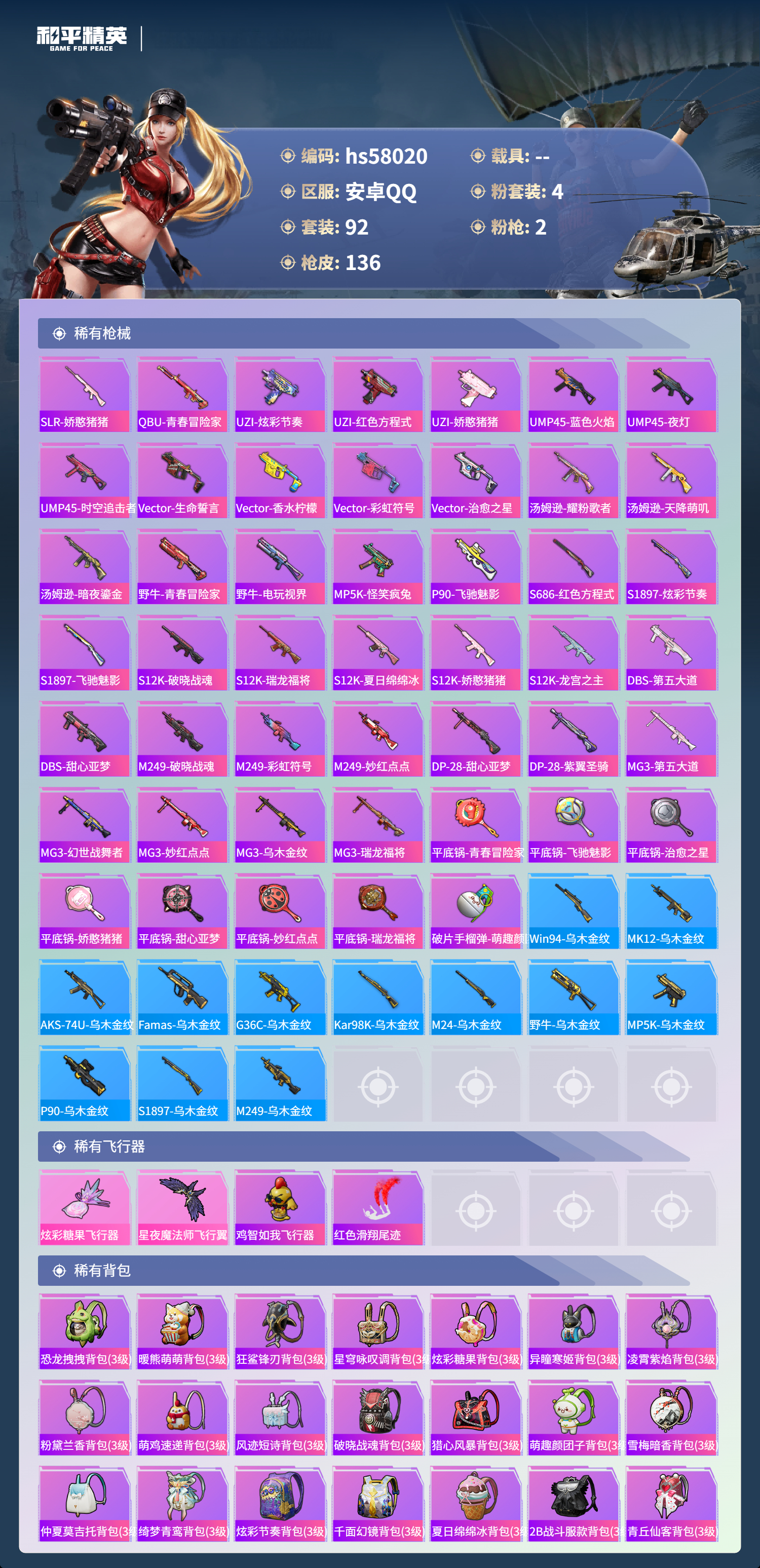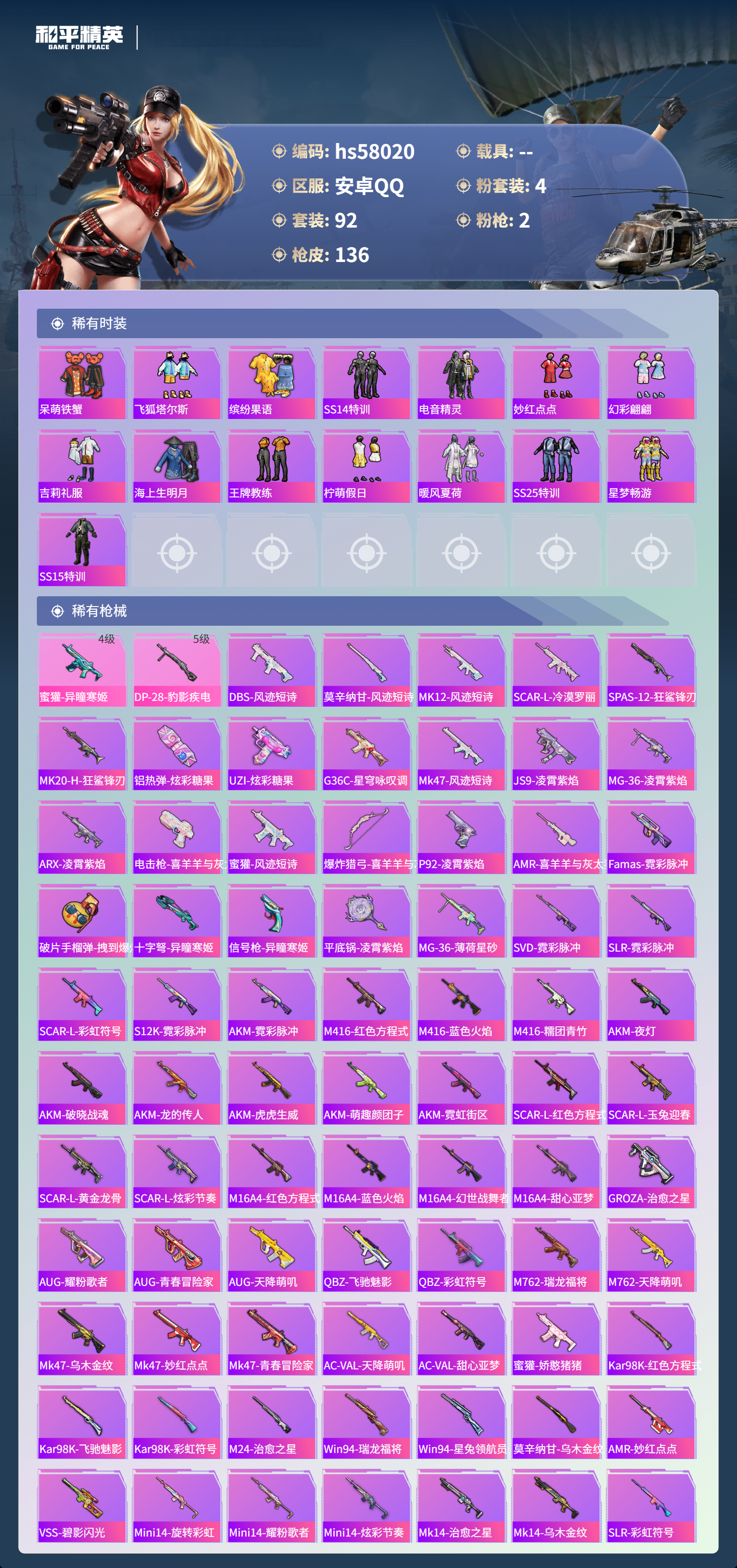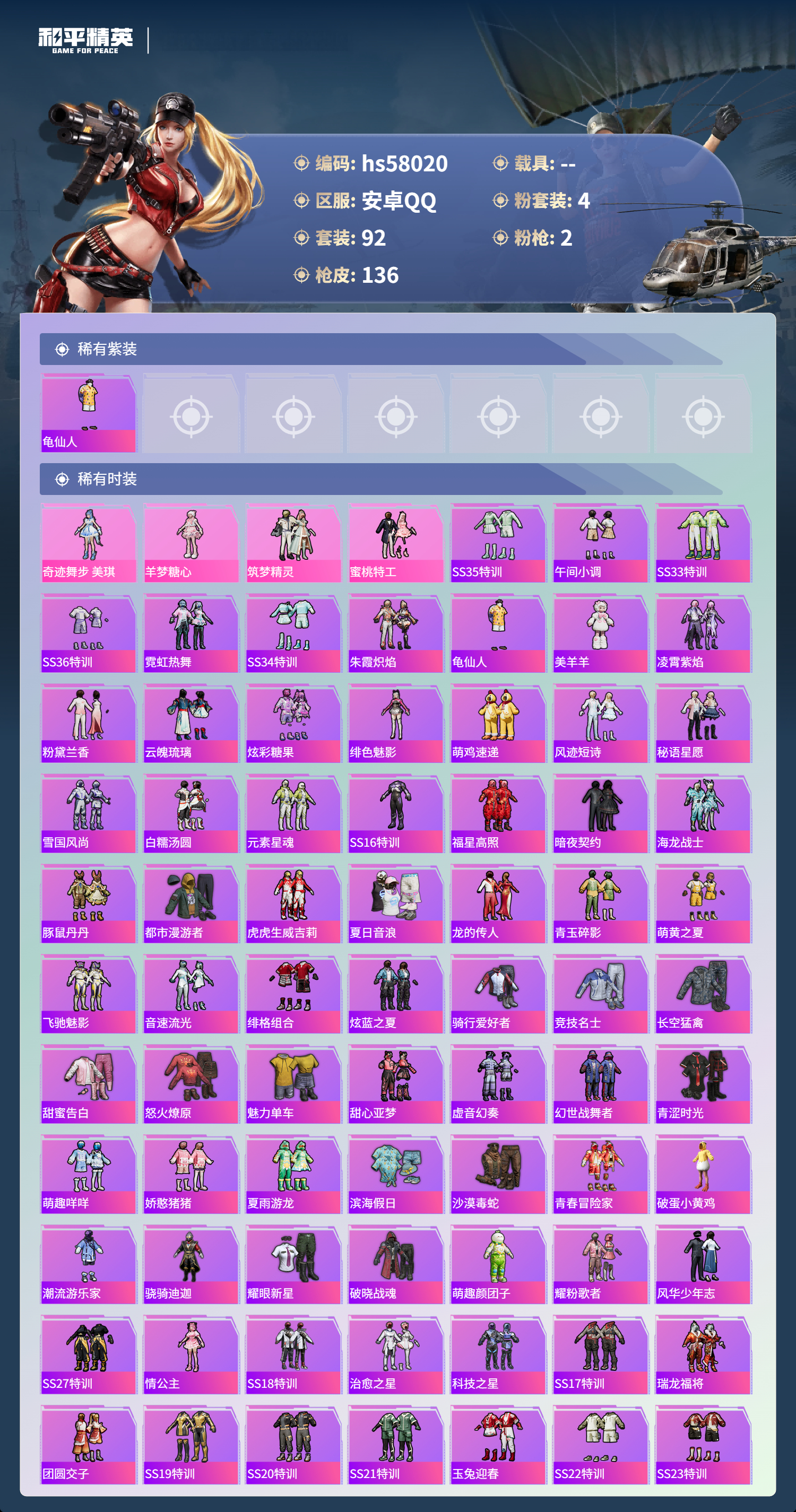 0载具-92套装-136呛皮-hs58020 安卓手q-3王牌印记-4粉装-2特效呛-41096热力值-92套装-136呛皮【4粉装】角色-奇迹舞步 美琪套装-筑梦精灵角色-羊梦糖心套装-蜜桃特工【2特效呛】dp-28-豹影疾电/5级蜜獾-异瞳寒姬/4级【1稀有紫装】龟仙人【92稀有时装】奇迹舞步 美琪羊梦糖心ss35特训午间小调ss33特训ss36特训霓虹热舞ss34特训朱霞炽焰龟仙人美