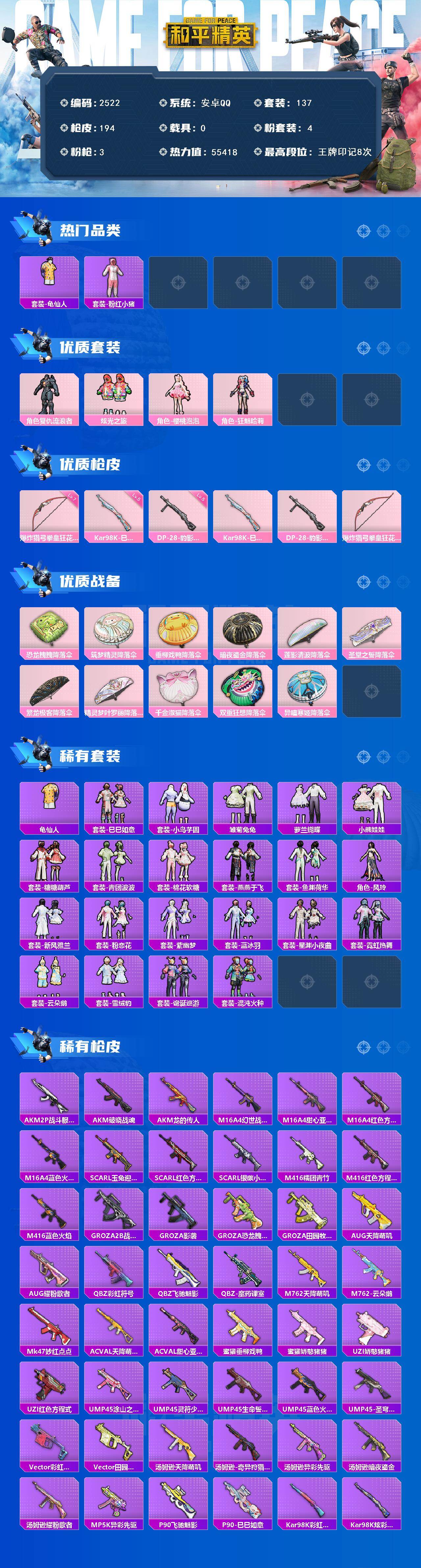 0载具-137套装-194呛皮-137套装/呛械3/装备246/战备144/王牌印记8/热力值55418/五级kar98k-巳巳如意/五级dp-28-豹影疾电/七级爆炸猎弓-拳皇·狂花道/套装-龟仙人/套装-粉红小猪/复仇流浪者/炫光之旅/角色-樱桃泡泡/角色-狂魅哈莉/kar98k-巳巳如意/dp-28-豹影疾电/爆炸猎弓-拳皇·狂花道/恐龙拽拽降落伞/筑梦精灵降落伞/垂柳戏鸭降落伞/暗夜鎏金降落伞/莲影清波降落伞/圣堂之