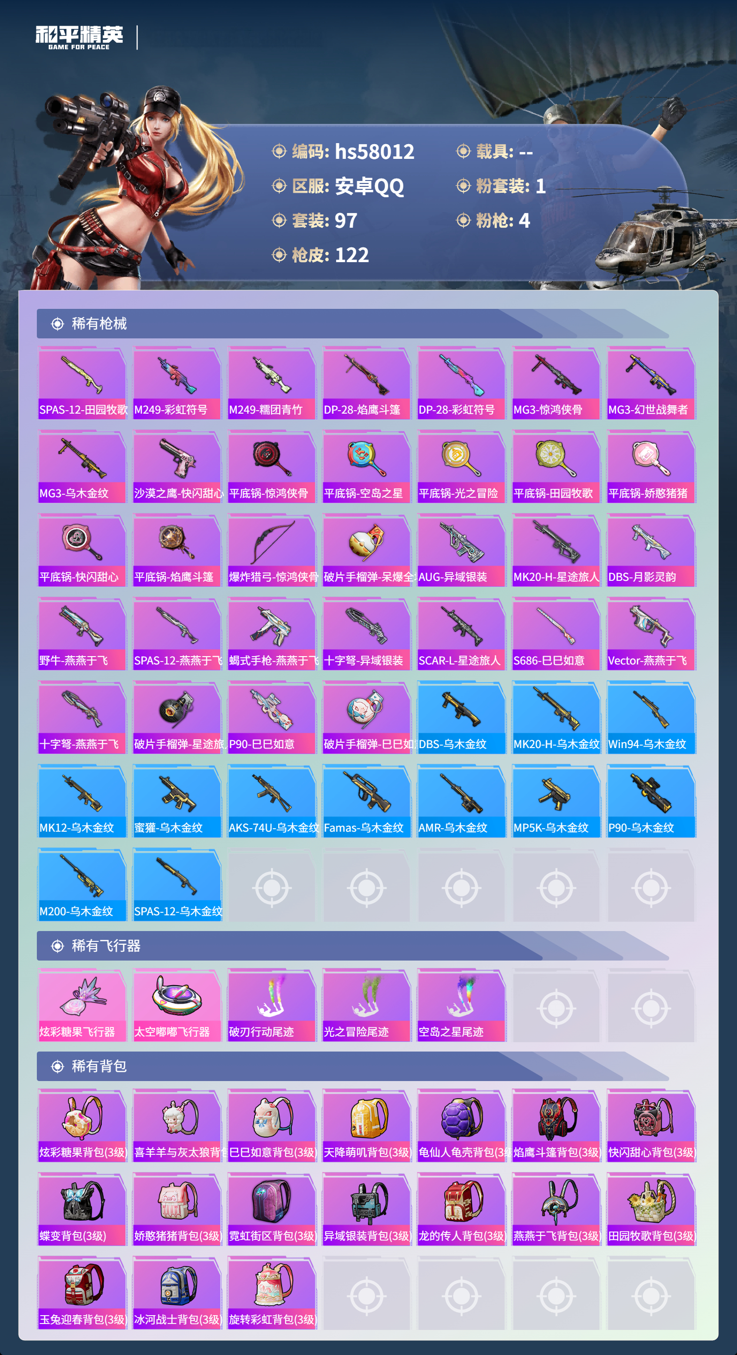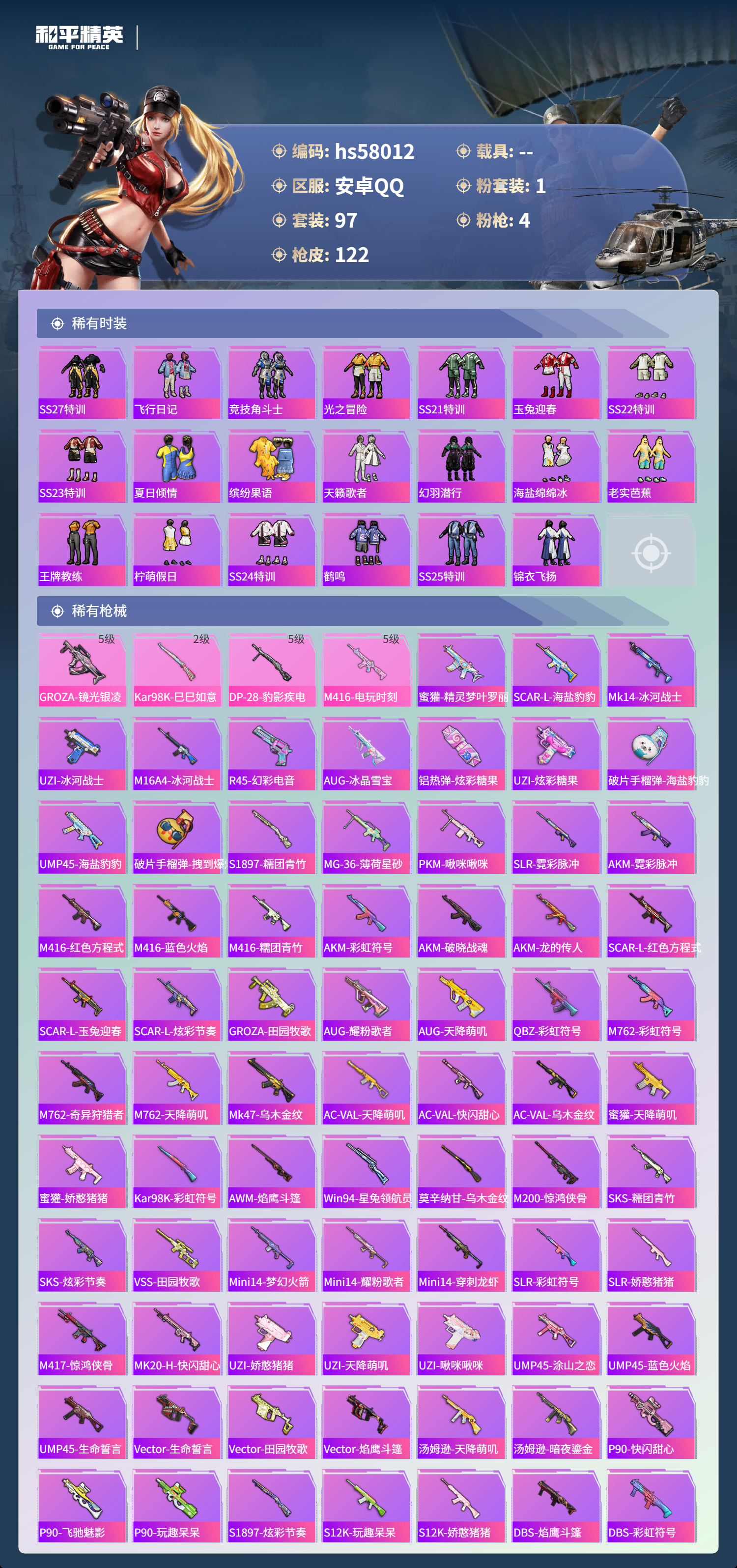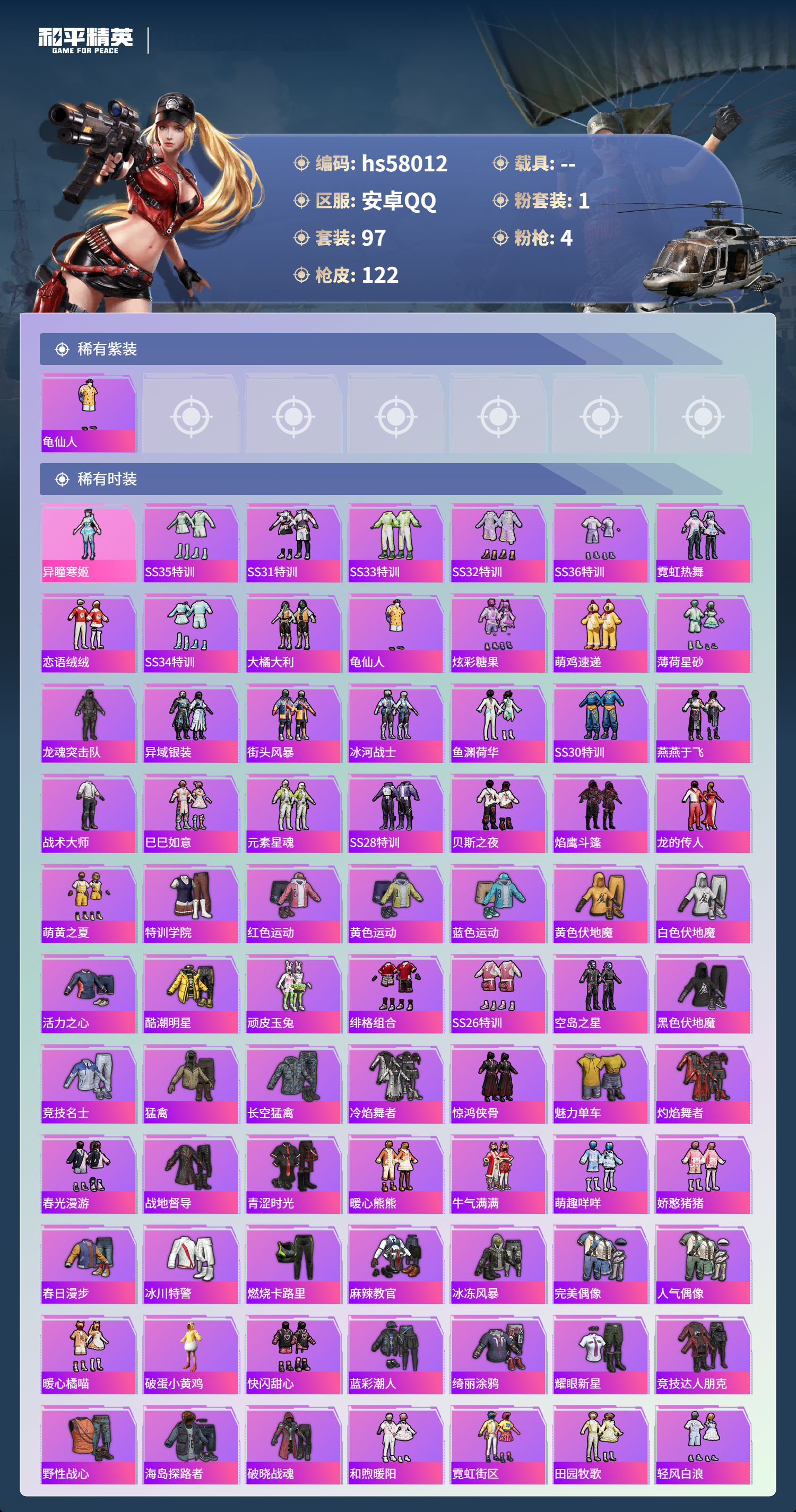 0载具-97套装-122呛皮-hs58012 安卓手q-6王牌印记-1粉装-4特效呛-34133热力值-97套装-122呛皮-1卓越印记【1粉装】角色-异瞳寒姬【4特效呛】m416-电玩时刻/5级groza-镜光银凌/5级kar98k-巳巳如意/2级dp-28-豹影疾电/5级【1稀有紫装】龟仙人【97稀有时装】异瞳寒姬ss35特训ss31特训ss33特训ss32特训ss36特训霓虹热舞恋语绒绒s