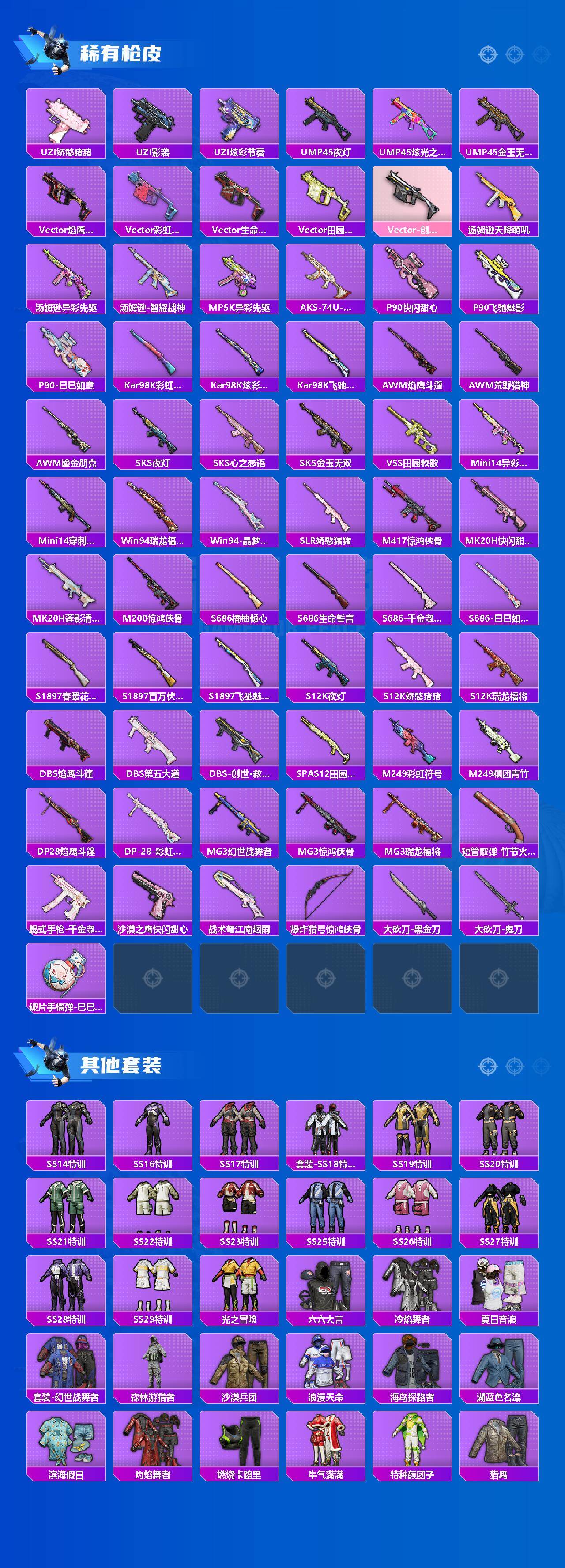 1载具-129套装-198呛皮-129套装/呛械8/装备237/载具1/战备131/王牌印记14/热力值58236/七级akm-梦之光华/五级scar-l-锦绣绵绵/五级m416-电玩时刻/五级groza-镜光银凌/五级aug-暖羊咩咩/五级kar98k-巳巳如意/五级dp-28-豹影疾电/七级pkm-江南烟雨/套装-浪漫天命/金羽特工/套装-龟仙人/智能音符/圣堂之誓/千金淑猫/晶梦灵驹/akm-梦之光华/scar-l-锦