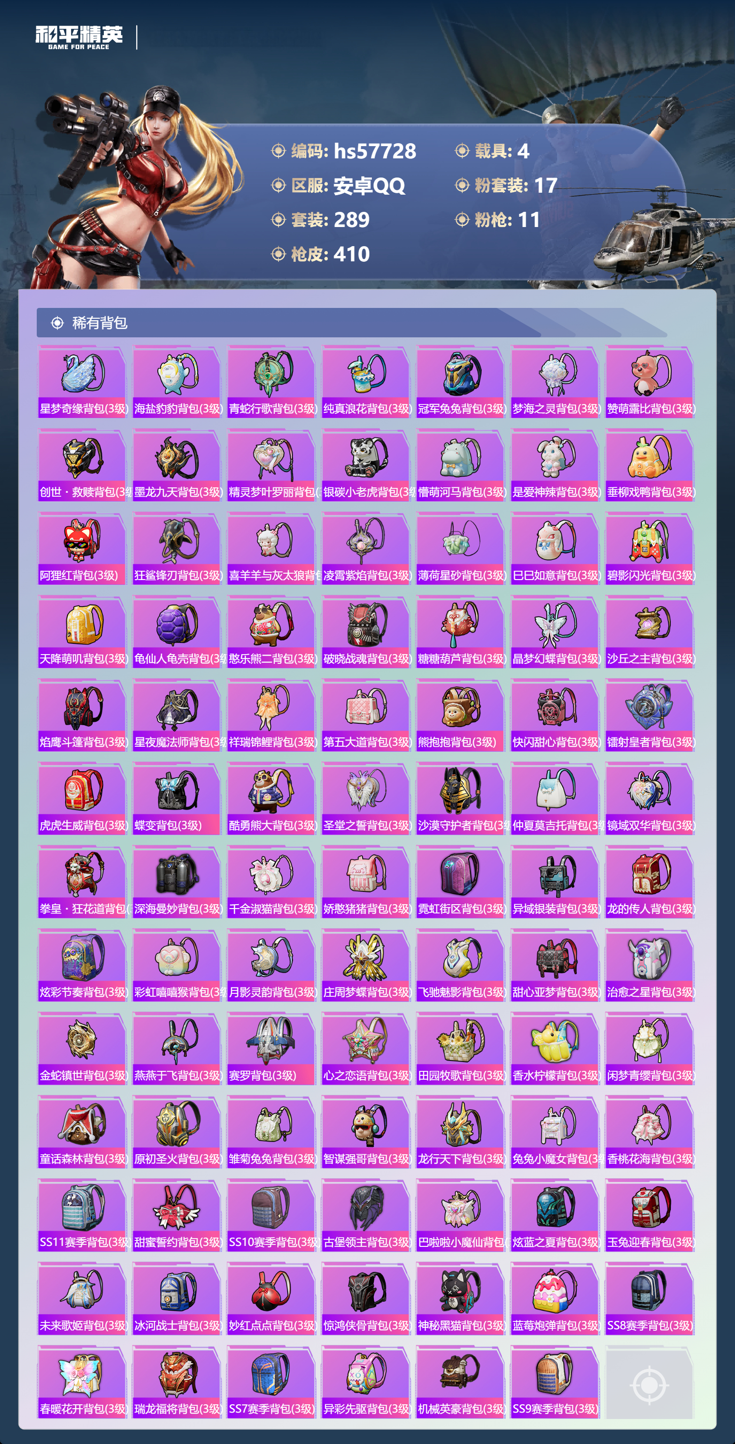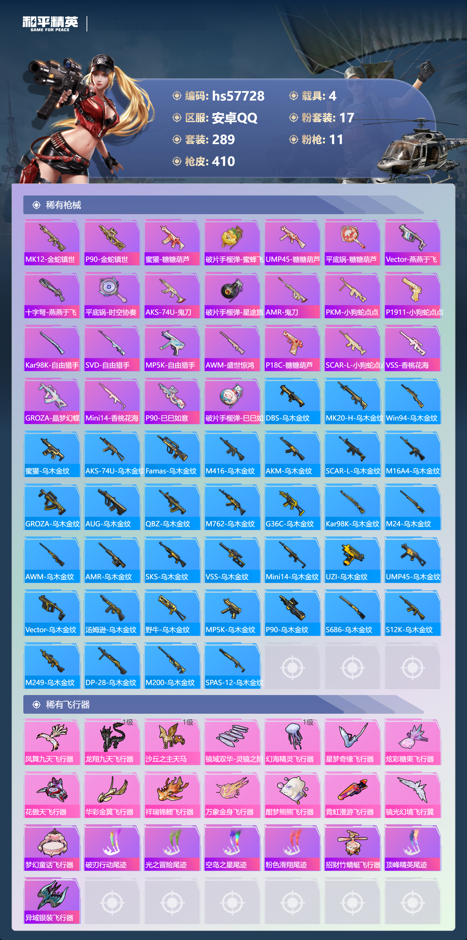 hs57728 安卓手q-18王牌印记-3红装-17粉装-11特效呛-4载具-热力值-289套装-410呛皮-2卓越印记-1传奇印记【3红装】金蛇镇世-烛九/1级梦海之灵-妮芮妲/4级沙丘之主-图卡盟/1级【17粉装】套装-炙焰牛王套装-青空秋雨套装-飒粉甜心套装-星穹咏叹调角色-星梦奇缘套装-冰川红玫角色-千金淑猫套装-草莓生巧角色-萨利娅套装-酣梦娃娃套