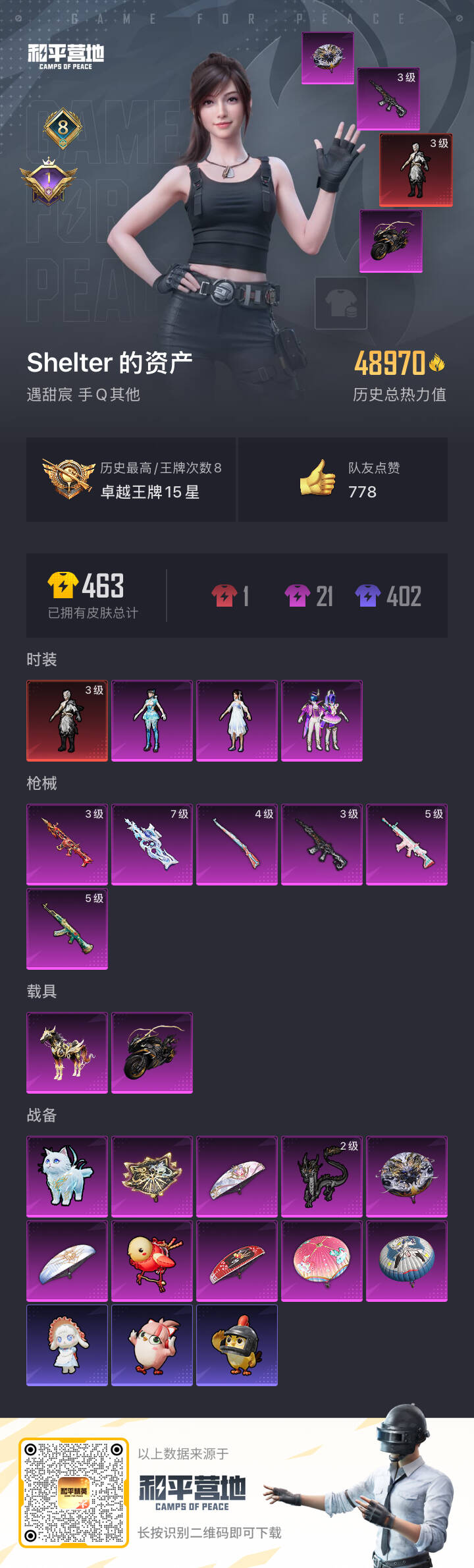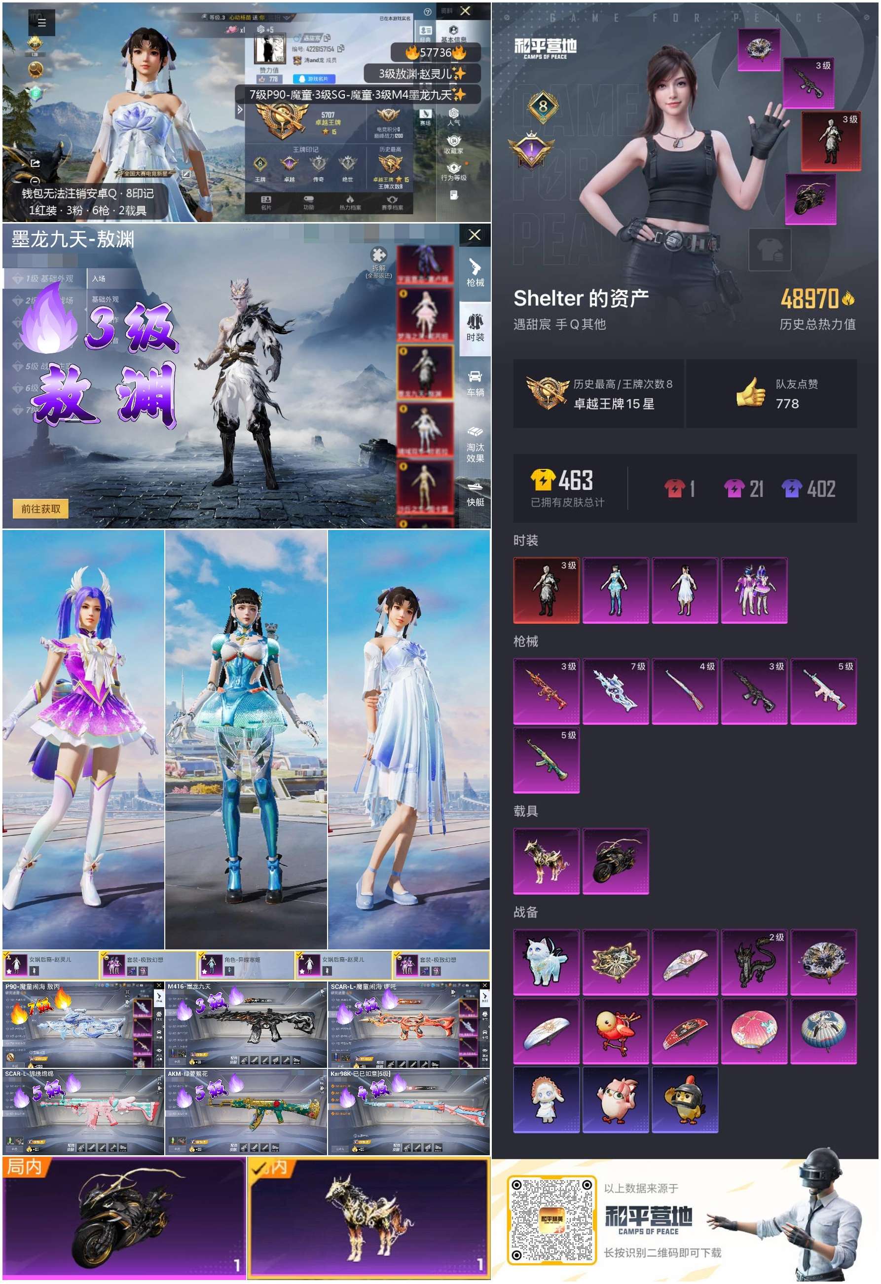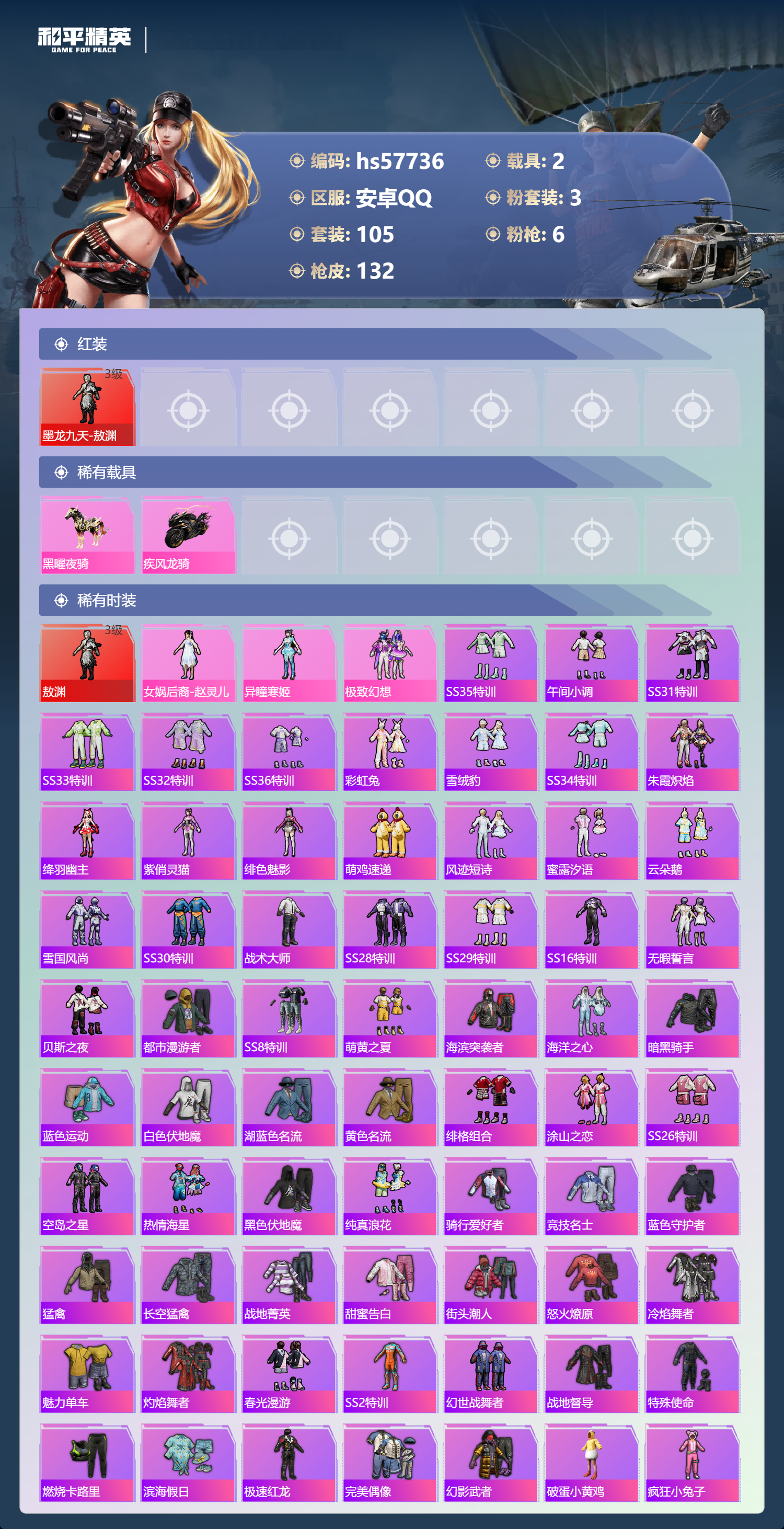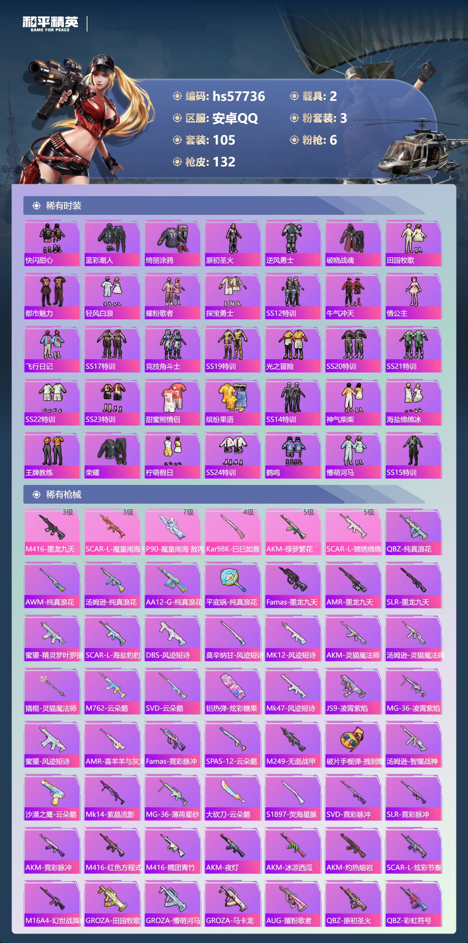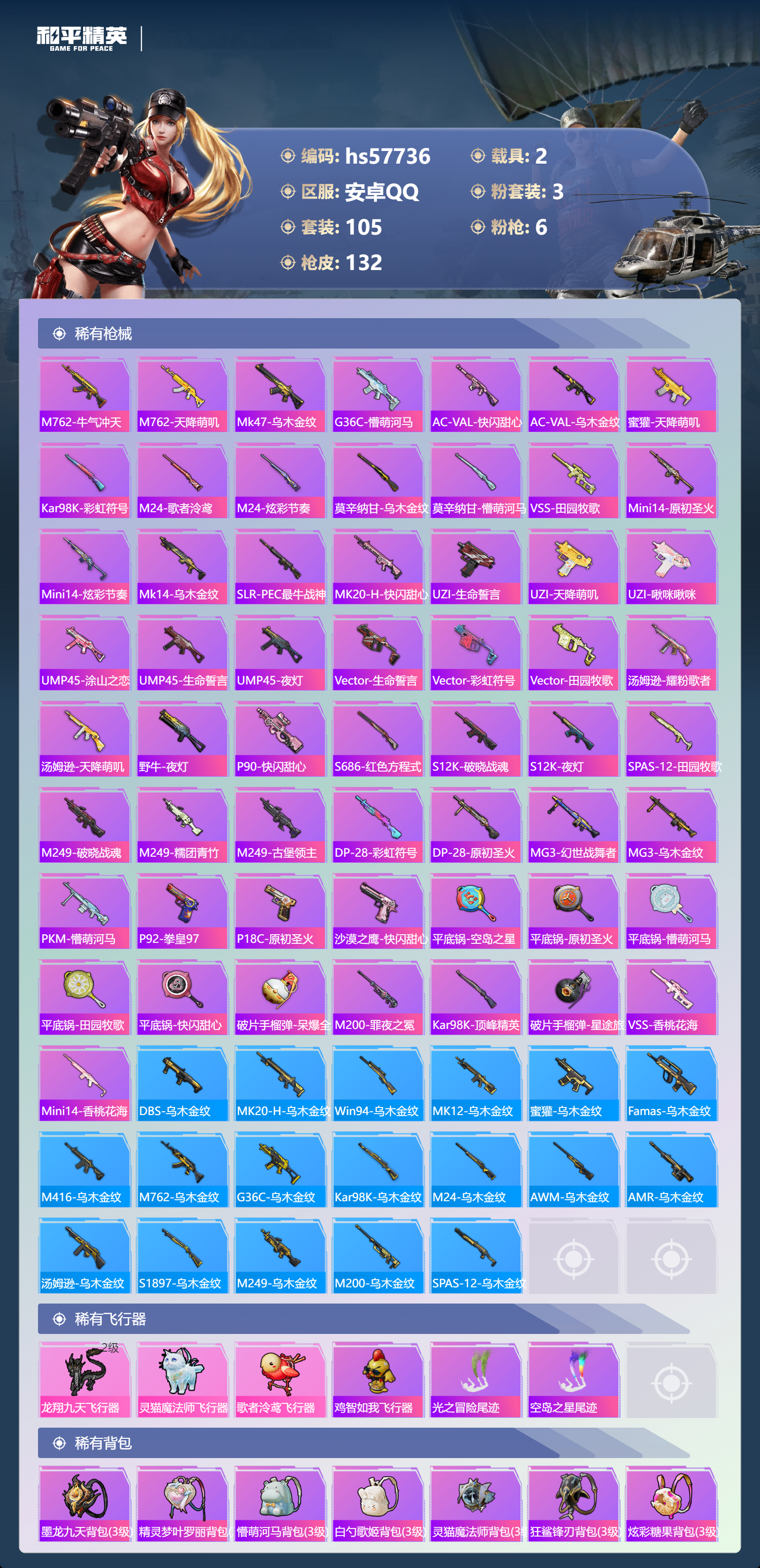 hs57736 安卓手q-8王牌印记-1红装-3粉装-6特效呛-2载具-48970热力值-105套装-132呛皮-1卓越印记【1红装】墨龙九天-敖渊/3级【3粉装】女娲后裔-赵灵儿套装-极致幻想角色-异瞳寒姬【6特效呛】p90-魔童闹海 敖丙/7级akm-绿萝繁花/5级kar98k-巳巳如意/4级m416-墨龙九天/3级scar-l-魔童闹海 哪吒/3级scar-l-锦绣绵绵/