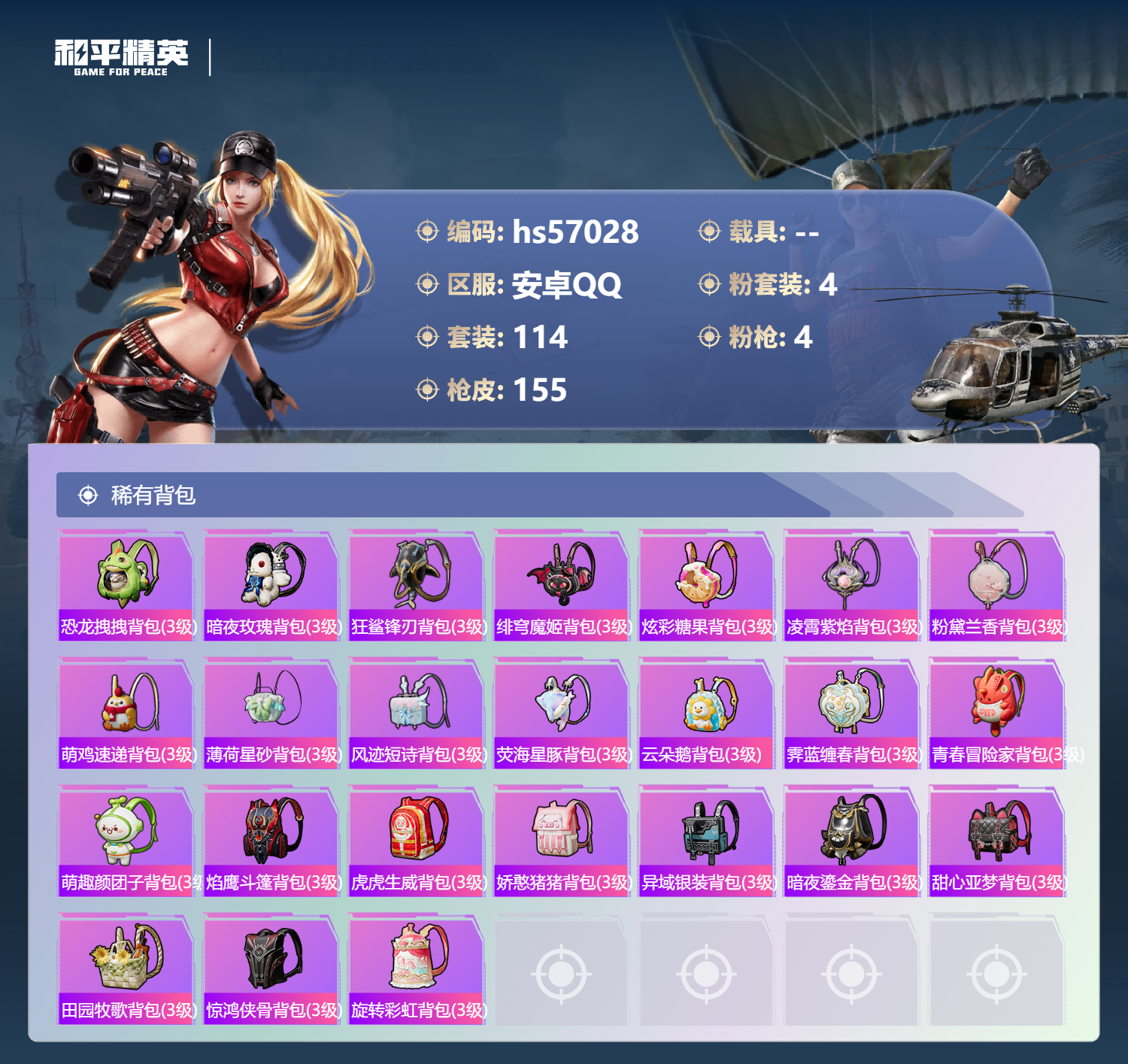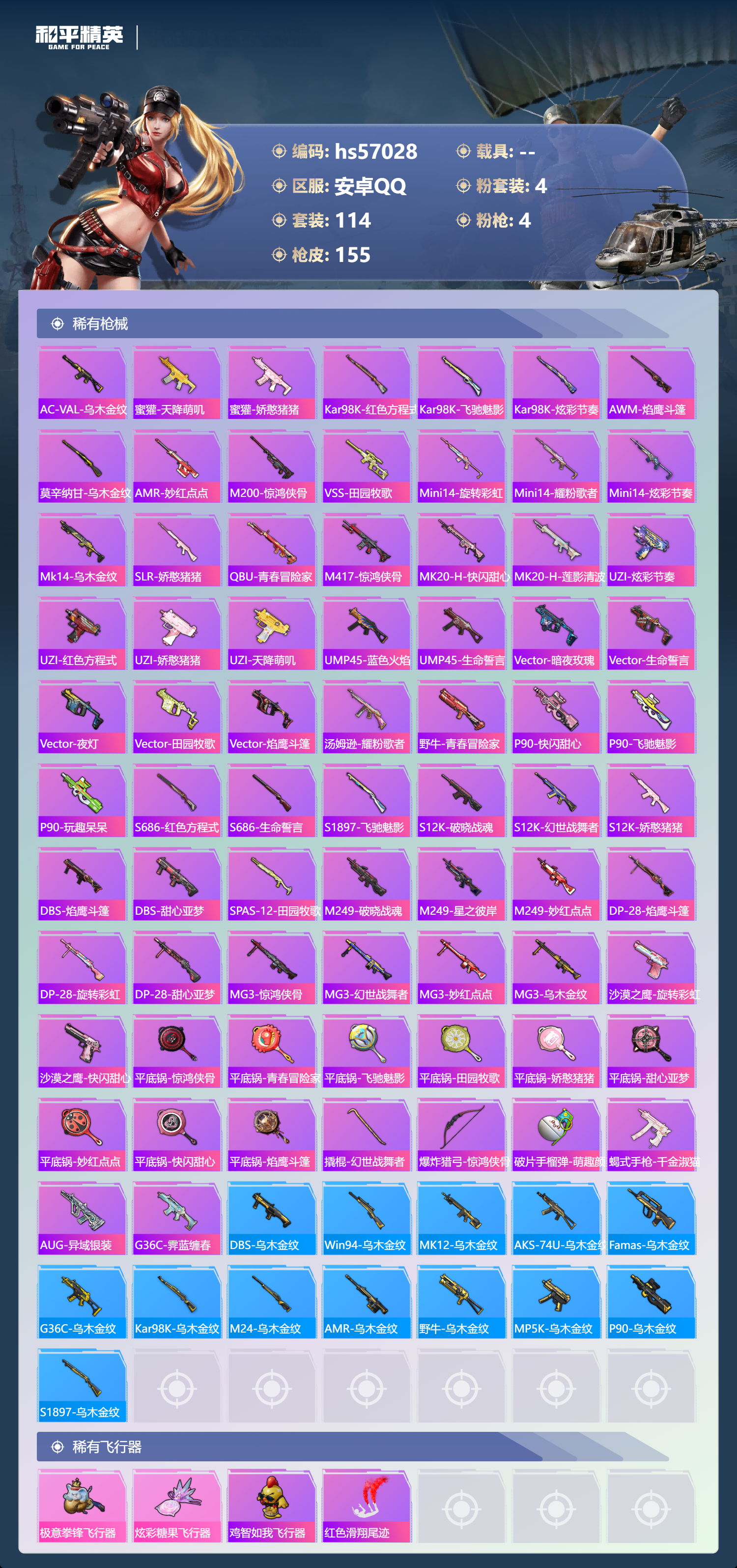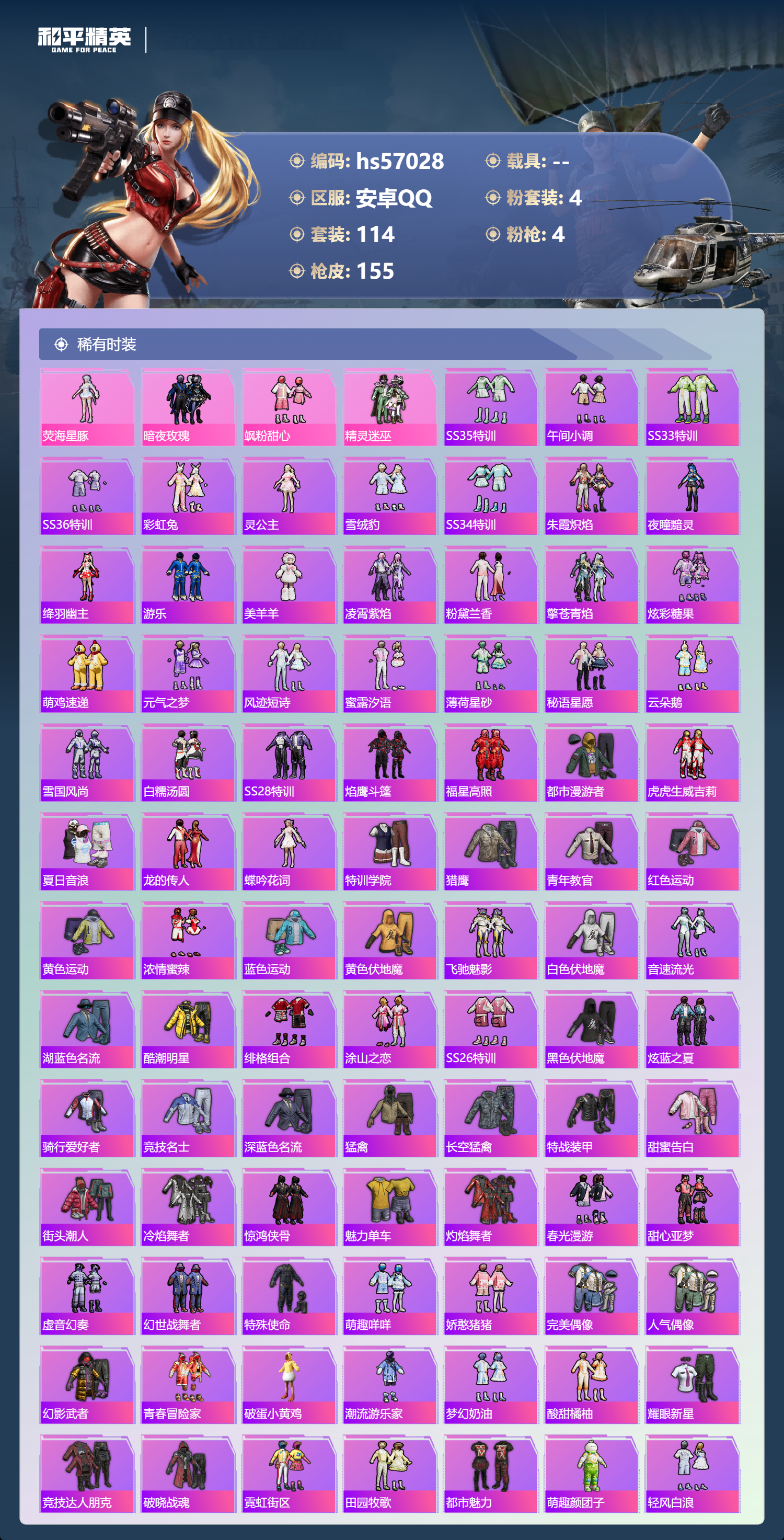hs57028 安卓手q-3王牌印记-4粉装-4特效呛-44006热力值-114套装-155呛皮【4粉装】套装-精灵迷巫套装-飒粉甜心角色-荧海星豚套装-暗夜玫瑰【4特效呛】groza-旋转彩虹/7级vect-绯穹魔姬/7级dp-28-豹影疾电/5级m249-霁蓝缠春/4级【114稀有时装】荧海星豚ss35特训午间小调ss33特训ss36特训彩虹兔灵公主雪绒豹