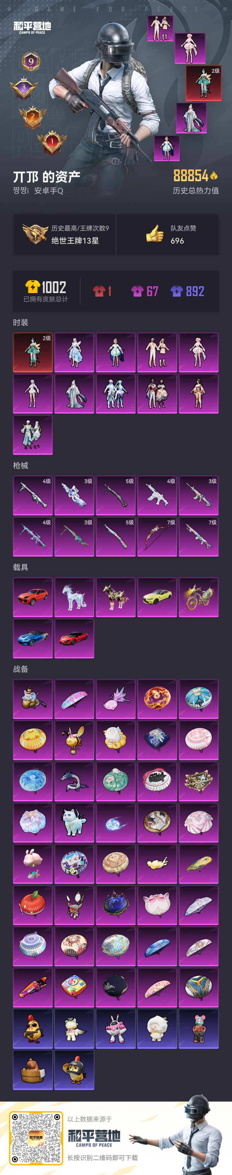 2398891-7载具-169套装-268呛皮-1红装8载具10粉装10特效呛9热门169套装268呛皮 88837热力值 9印记 历史绝世王牌13星 【1红装】 辉羽雀灵-初翊 2级 【8载具】 保时捷cayenne激情红 宝马m4圣保罗黄 仰望u9赤霞丹朱 幽澜尊爵静谧蓝 冰绡玉鳞 黑曜夜骑 辉羽雀灵自行车 萌兔起飞僚机 【10粉装】 狂花道·不知火舞 宁雨蝶 奇迹舞