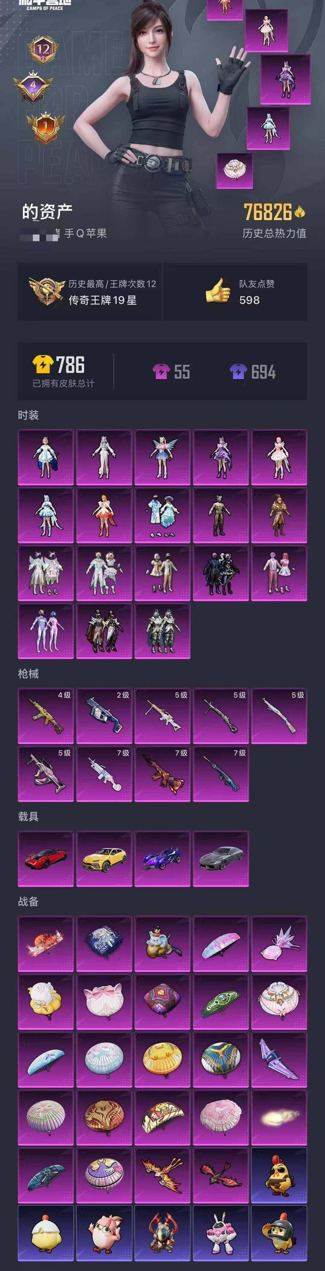 [15786197]时装数: 159 载具数: 4 呛械数: 199 战备数: 141 热门装扮: 梦幻火箭新101宝贝奶油派天使彩虹糖万圣娃娃山涧鹿灵赛罗闪耀型彩虹鹿灵暗夜玫瑰沙场疾风齐天大圣洛天依银龙傲海海螺星光暗夜魅影严莉莉美雪美琪小蓝电磁星冷漠罗丽 载具: 海龙奔腾兰博基尼estoque银翼灰兰博基尼urus明艳黄帕加尼imola光影红 稀有呛皮: m416-风花雪月七级,groza-镜光银凌五级,vect-环太平洋二级,aks-74u-森灵之息四级,kar98k-巳巳如意五级,slr-暗夜玫瑰七级,m249-彩虹甜喵七级,dp-28-豹影疾电五级,mg-36-沧焰双生五级