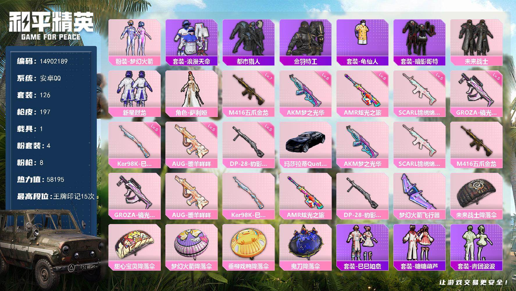 [15792176]das9346 包人脸 安卓q-满级m416-五爪金龙 7级 都市猎人 浪漫天命 玛莎拉蒂q蓝色 梦幻火箭 萨利娅 未来战士 新星烈龙 萌熊伴侣背包 2稀有1载具4粉装8特效呛9热门126套装197呛皮 58195热力值 15印记 历史超级王牌12星 【2稀有】 都市猎人 浪漫天命 【1载具】 玛莎拉蒂q蓝色 【4粉装】 梦幻火箭 萨利娅 未来战士 新星烈龙 【8特效呛】 m416-五爪金龙 7级 scar-l-锦绣绵绵 5级 kar98k-巳巳如意 5级 dp-28-豹影疾电 5级 aug-暖羊咩咩 5级 amr-炫光之旅 6级 groza-镜光银凌 5级 akm-梦之光华 6级 【9热门】 龟仙人 雪山精英 东方飞龙 鹰眼刺客 金羽特工 暗影哥特 西部牛仔 狂沙舞者 漫步者 【1飞行器】 梦幻火箭飞行器 【3头盔】 国宝胖达头盔 梦幻火箭头盔 甜心宝贝头盔 【2背包】 梦幻火箭背包 萌熊伴侣背包