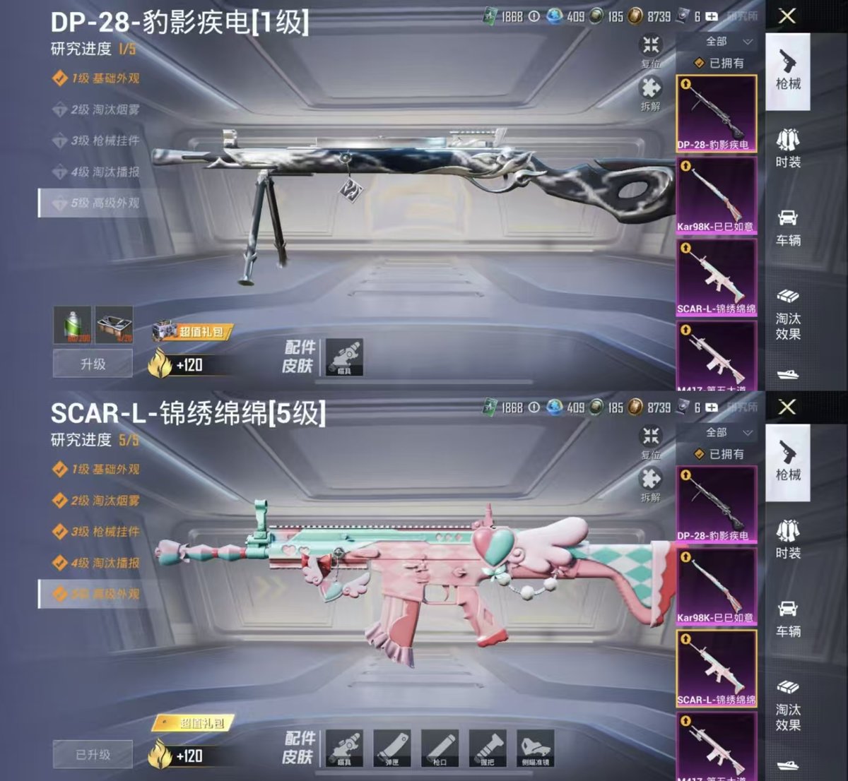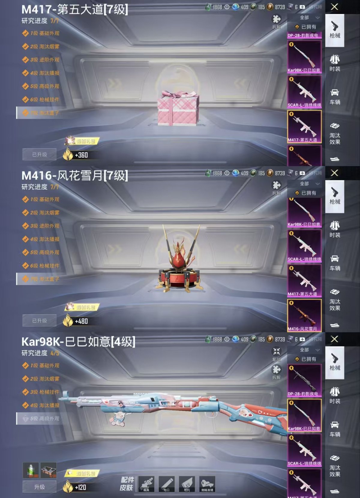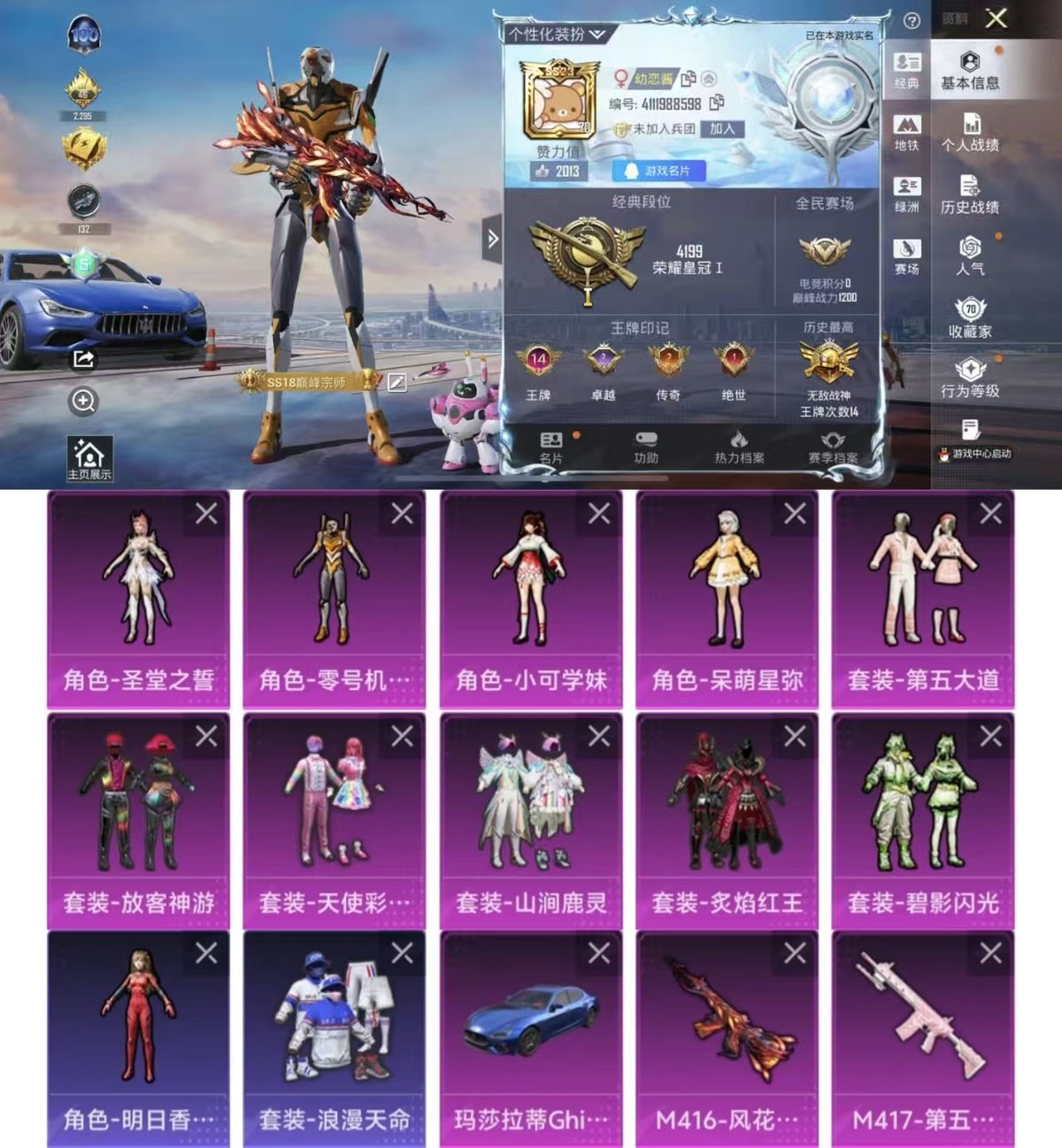_2399439-实名:可修改时装数:791载具数:1呛械数:269战备数:210热门装扮:天使彩虹糖放客神游迅捷狂鲨炙焰红王山涧鹿灵暗夜玫瑰吟月归客零号机款机体服碧影闪光奇迹天团蔷薇魔法师第五大道瑰丽时代小可学妹呆萌星弥暗夜魅影圣堂之誓载具:玛莎拉蒂ghibli蓝稀有呛皮:m416风花雪月m417第五大道scar-l-锦绣绵绵kar98k-巳巳如意dp-28-豹影疾电