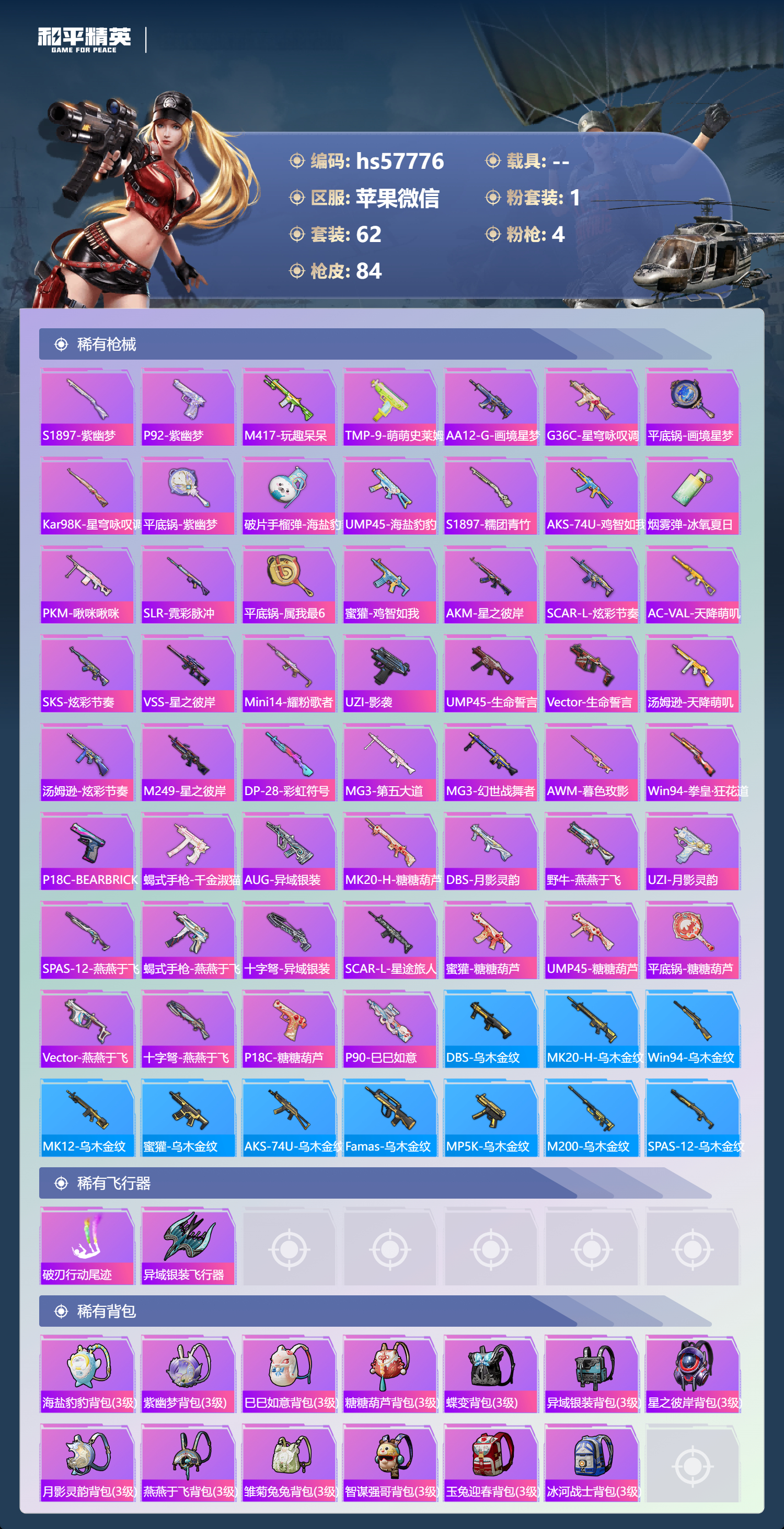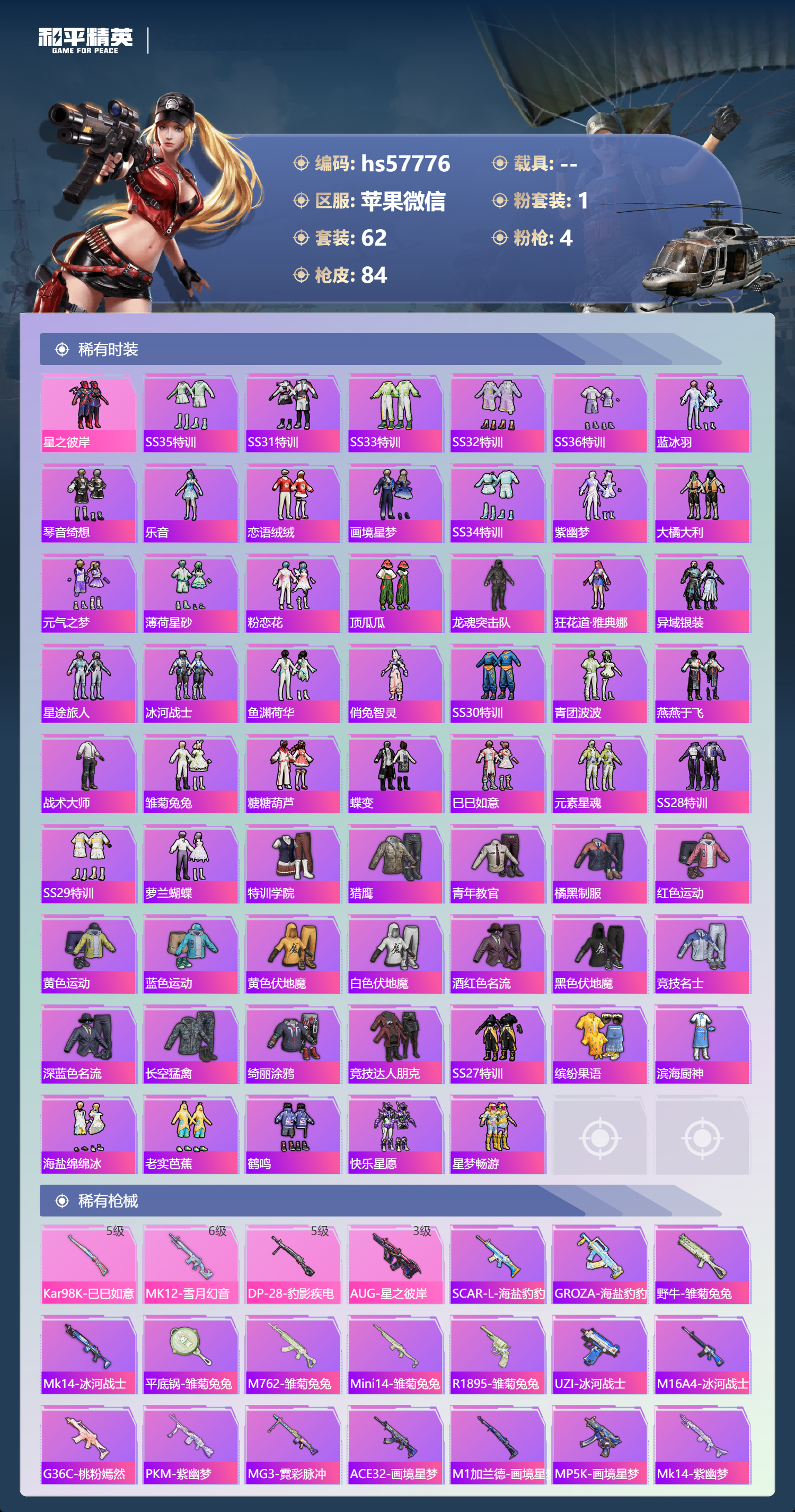 hs57776 苹果微信-5王牌印记-1粉装-4特效呛-24135热力值-62套装-84呛皮【1粉装】套装-星之彼岸【4特效呛】12-雪月幻音/6级kar98k-巳巳如意/5级dp-28-豹影疾电/5级aug-星之彼岸/3级【61稀有时装】ss35特训ss31特训ss33特训ss32特训ss36特训蓝冰羽琴音绮想乐音恋语绒绒画境星梦ss34特训紫幽梦大橘大利