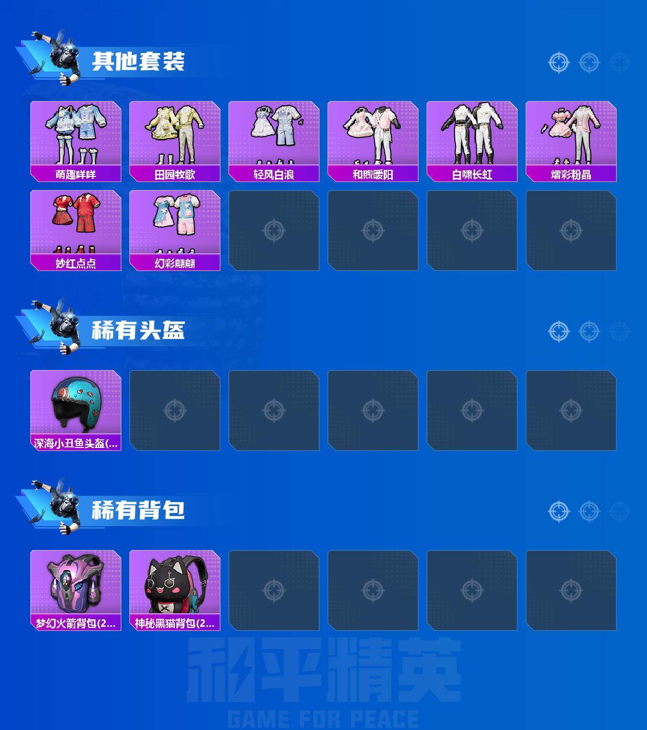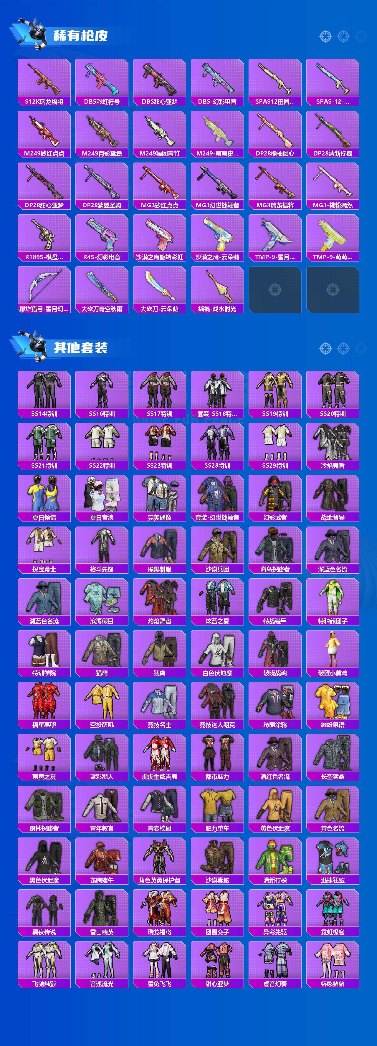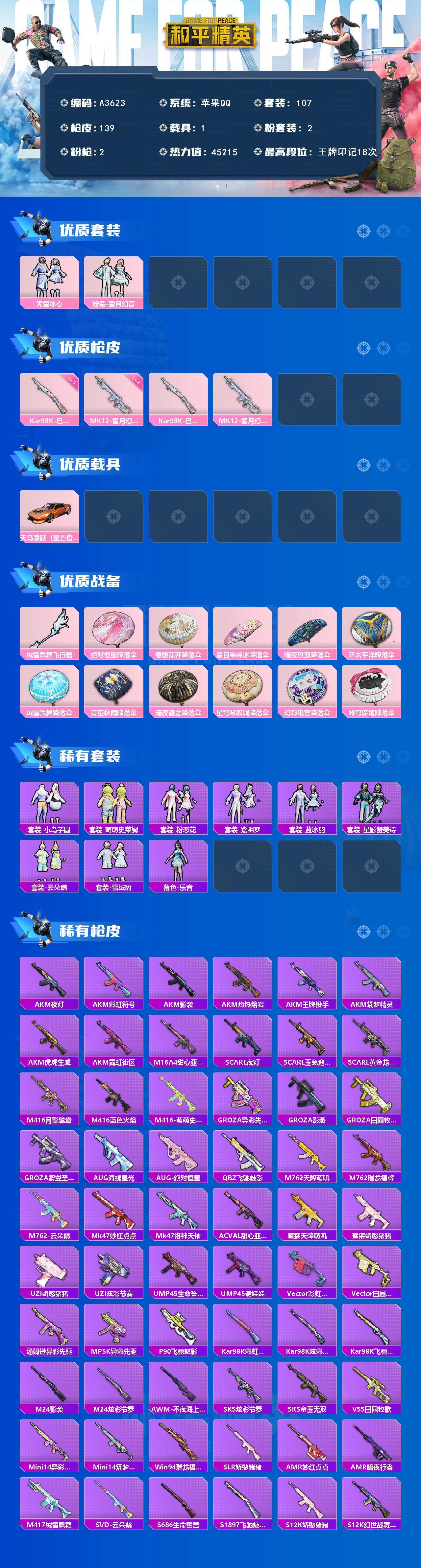 [15793345]苹果 【小号 霁雪冰心/雪月幻音/天马凌跃(星芒橙)】手q-2粉装-2特效呛-1载具-2粉色飞行器-45215热力值-18王牌印记-107套装-139呛皮 【粉色套装】:粉装-霁雪冰心,粉装-雪月幻音 【粉色呛皮等级】:汤姆逊-星月云朵二级mk12-雪月幻音,kar98k-巳巳如意五级 【粉色载具】:天马凌跃(星芒橙) 【粉色呛皮】:kar98k-巳巳如意,mk12-雪月幻音 【粉色飞行器】:绒雪飘舞飞行器 【粉色降落伞】:绝对恒星降落伞,春暖花开降落伞,夏日绵绵冰降落伞,暗夜玫瑰降落伞,环太平洋降落伞,绒雪飘舞降落伞,青空秋雨降落伞,暗夜鎏金降落伞,星穹咏叹调降落伞,幻彩电音降落伞,绯穹魔姬降落伞,炫彩糖果降落伞 【稀有套装】:套装-小鸟芋圆,套装-萌萌史莱姆,套装-粉恋花,套装-紫幽梦,套装-蓝冰羽,套装-星影赞美诗,套装-云朵鹅,套装-雪绒豹,角色-乐音,套装-炫彩糖果 【稀有呛皮】:akm-夜灯,akm-彩虹符号,akm-影袭,akm-灼热熔岩,akm-王牌投手,akm-筑梦精灵,akm-虎虎生威,akm-霓虹街区,m16a4-甜心亚梦,scar-l-夜灯,scar-l-玉兔迎春,scar-l-黄金龙骨,m416-月影鸳鸯,m416-蓝色火焰,m416-萌萌史莱姆,groza-异彩先驱,groza-影袭,groza-田园牧歌,groza-紫翼圣骑,aug-海螺星光,aug-绝对恒星,q-飞驰魅影,m762-天降萌叽,m762-瑞龙福将,m762-云朵鹅,mk47-妙红点点,mk47-洛神天依,ac-val-甜心亚梦,蜜獾-天降萌叽,蜜獾-娇憨猪猪,uzi-娇憨猪猪,uzi-炫彩节奏,ump45-生命誓言,ump45-诡娃娃,vect-彩虹符号,vect-田园牧歌,汤姆逊-异彩先驱,mp5k-异彩先驱,p90-飞驰魅影,kar98k-彩虹符号,kar98k-炫彩节奏,kar98k-飞驰魅影,m24-影袭,m24-炫彩节奏,awm-不夜海上花,sks-炫彩节奏,sks-金玉无双,vss-田园牧歌,mini14-异彩先驱,mini14-筑梦精灵,win94-瑞龙福将,slr-娇憨猪猪,amr-妙红点点,amr-暗夜行者,m417-绒雪飘舞,svd-云朵鹅,s686-生命誓言,s1897-飞驰魅影,s12k-瑞龙福将,s12k-娇憨猪猪,s12