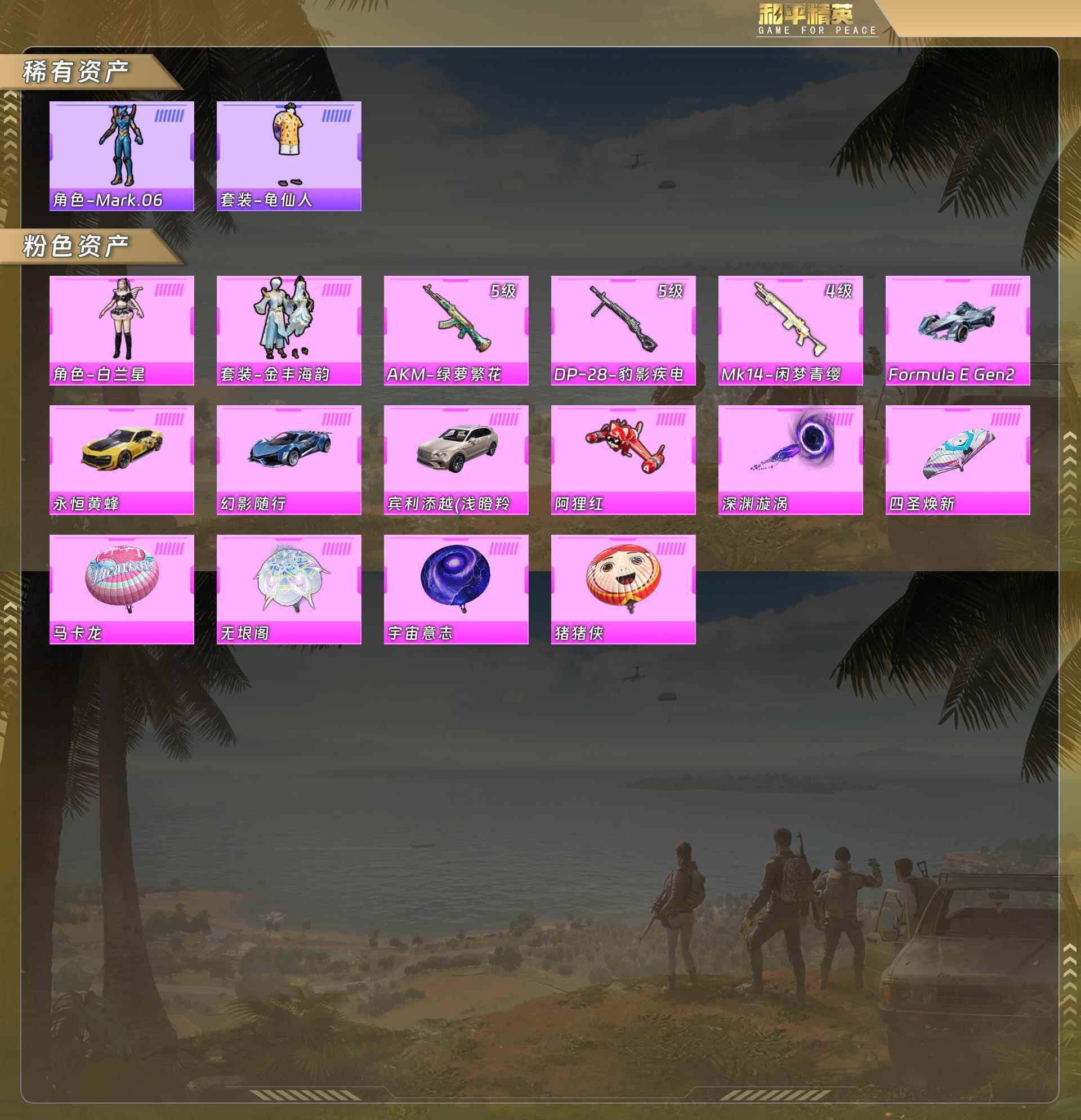 (2粉套3粉呛4载具)蓝螳螂/白兰星/金丰海韵/ak绿萝繁花5级/dp28豹影疾电5级/mk14闲梦青缨4级/f2巅峰兰/永恒黄蜂/幻影随行/宾利添越浅瞪羚棕没战神框hp5143-2粉色飞行器-36471热力值-5王牌印记-68套装-111呛皮 【热门品类】:套装-龟仙人,角色-mark.06 【粉色套装】:角色-白兰星,粉装-金丰海韵 【粉色呛皮等级】:akm-绿萝繁花五级,dp-28-豹影疾电五级 【粉色载具】:宾利添越(浅瞪羚棕),永恒黄蜂,幻影随行,fmula e gen2(巅峰兰) 【粉色呛皮】:akm-绿萝繁花,mk14-闲梦青缨,dp-28-豹影疾电 【粉色飞行器】:阿狸红飞行器,深渊漩涡飞行器 【粉色降落伞】:四圣焕新降落伞,马卡龙降落伞,猪猪侠降落伞,宇宙意志降落伞,无垠阁降落伞 【稀有套装】:套装-龟仙人,套装-雏菊兔兔,套装-萝兰蝴蝶,角色-米开朗基罗 【稀有呛皮】:akm-四圣焕新,akm-夜灯,akm-龙的传人,m16a4-幻世战舞者,scar-l-夜灯,scar-l-炫彩节奏,scar-l-红色方程式,m416-摩登王国,m416-糯团青竹,m416-红色方程式,m416-蓝色火焰,groza-2b战斗服款,groza-治愈之星,aug-耀粉歌者,q-未来歌姬,m762-牛气冲天,m762-镭射皇者,mk47-摩登王国,蜜獾-天降萌叽,uzi-啾咪啾咪,uzi-天降萌叽,uzi-幻影战神,uzi-红色方程式,ump45-生命誓言,ump45-蓝色火焰,vect-彩虹符号,vect-暗夜玫瑰,vect-治愈之星,vect-香水柠檬,汤姆逊-天降萌叽,汤姆逊-耀粉歌者,汤姆逊-花间之火,p90-倾城蜜语,kar98k-彩虹符号,kar98k-洛神天依,kar98k-红色方程式,m24-治愈之星,sks-炫彩节奏,vss-镭射皇者,mini14-梦幻火箭,mini14-耀粉歌者,mk14-治愈之星,win94-夏日绵绵冰,m417-惊鸿侠骨,m200-惊鸿侠骨,s686-红色方程式,s1897-镭射皇者,s12k-玩趣呆呆,s12k-破晓战魂,s12k-幻世战舞者,dbs-创世·救赎,m249-彩虹符号,m249-破晓战魂,m249-镭射皇者,dp-28-山经魅狐,dp-28-彩虹符号,mg3-幻世战舞者,mg3-惊鸿侠骨,爆炸猎弓-惊鸿侠骨 【其他套装】:套装-ss12特训,套装-ss13特训,套装-ss14特训,套装-ss15特训,套装-ss25特训,套装-ss26特训,套装-ss27特训,套装-ss28特训,套装-ss29特训,套装-蝶恋花·桂语,套装-北国孤狼,套装-旭日情侣,套装-极速红龙,套装-灼焰舞者,套装-牛气满满,套装-猛禽,套装-疯狂小兔子,套装-白色伏地魔,套装-破蛋小黄鸡,套装-福星高照,套装-空岛之星,套装-竞技名士,套装-绯格组合,套装-缤纷果语,套装-萌趣颜团子,套装-萌黄之夏,套装-长空猛禽,套装-霓虹街区,套装-青涩时光,套装-飞行日记,套装-黑色伏地魔,套装-龙的传人,套装-龟仙人,套装-沙漠毒蛇,套装-呆萌铁蟹,套装-冰川特警,套装-本愿之火,套装-辉星之火,套装-镭射皇者,套装-银白舞王,套装-治愈之星,套装-科技之星,套装-电音精灵,套装-娇憨猪猪,套装-元气发射,套装-惊鸿侠骨,套装-锦衣飞扬,套装-纯真浪花,套装-热情海星,套装-曼妙人鱼,套装-创世·追猎,角色-mark.06 【稀有头盔】:梦幻火箭头盔3级 【稀有背包】:夏日绵绵冰背包3级 【营地id】:752481489