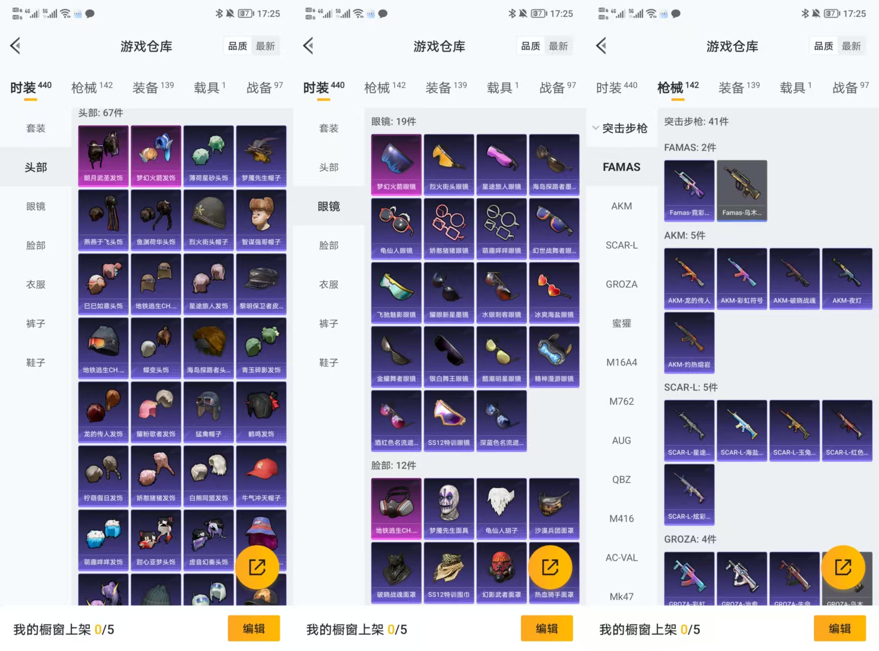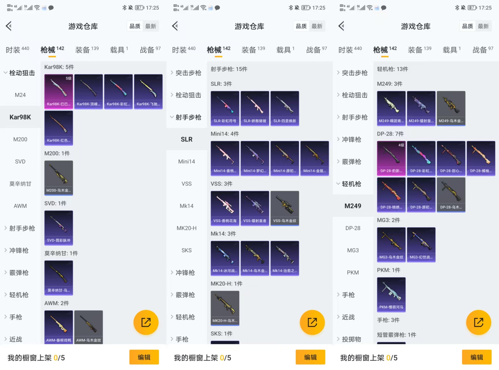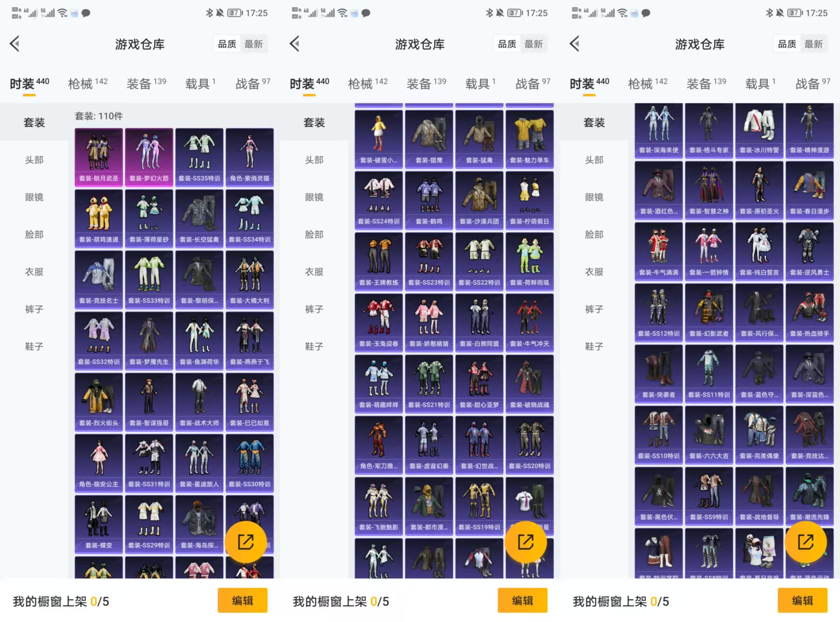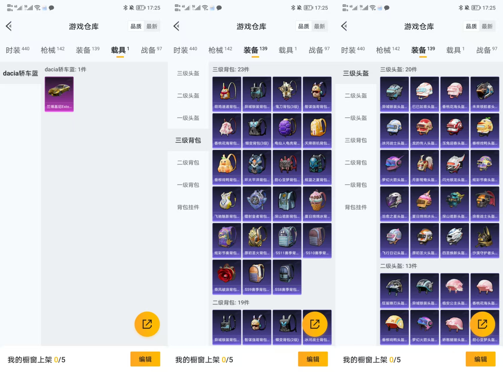 2安卓q-3王牌印记-2粉装-2特效呛-142呛皮-110套装-1载具【1载具】 兰博轿车金色 【2粉装】 梦幻火箭 朗月武圣 【2特效呛】 dp-28-豹影疾电 kar98k-巳巳如意 【3飞行器】 顶峰精英尾迹 梦幻火箭飞行器 闪光银龙飞行器 【17头盔】 未来领航者头盔3级 月影鸳鸯头盔3级 飞行日记头盔3级 四圣焕新头盔3级 沙漠守护者头盔3级 深山