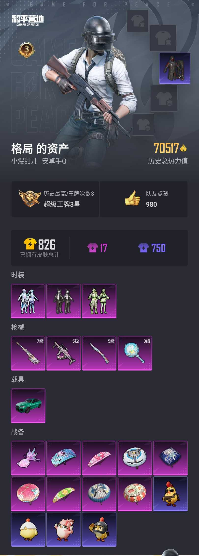 【和平精英】【lyhp20353】3粉装,4特效呛,1载具,历史最高段位:超级王牌3星 王牌印记3次 热力值:70517,181套装,238呛械,244装备,131战备;套装:套装-数码大师,套装-碧影闪光,套装-幻彩电音,套装-特训学院,套装-猎鹰,套装-青年教官,套装-橘黑制服,套装-红色运动,套装-黄色运动,套装-蓝色运动,套装-黄色伏地魔,套装-白色伏地魔,套装-黑色伏地魔,套装-冰川格斗者,套装-竞技名士,套装-深蓝色名流,套装-酒红色名流,套装-湖蓝色名流,套装-黄色名流,套装-猛禽,套装-长空猛禽,套装-竞技勇士朋克,套装-黎明保卫者,套装-海岛探路者,套装-冷焰舞者,套装-灼焰舞者,套装-特战装甲,套装-战地督导,套装-突袭者,套装-甜蜜告白,套装-滨海假日,套装-暗黑骑手,套装-沙漠毒蛇,套装-冰冻风暴,套装-完美偶像,套装-人气偶像,套装-幻影武者,套装-街头潮人,套装-蓝彩潮人,套装-神秘领域,套装-魅力单车,套装-绮丽涂鸦,套装-耀眼新星,套装-坚韧舞者,套装-竞技达人朋克,套装-都市漫游者,套装-破晓战魂,套装-都市魅力,套装-热血青春,套装-雪山精英,套装-酷潮明星,套装-传奇侦探,套装-幻世战舞者,套装-甜蜜菠萝,套装-馥郁哈密,套装-奇异狩猎者,套装-甜蜜熊情侣,套装-青涩时光,套装-滨海厨神,套装-龙魂突击队,套装-冰川特警,套装-极速红龙,套装-格斗先锋,套装-海上生明月,套装-麻辣教官,套装-ss4特训,套装-破蛋小黄鸡,套装-疯狂小兔子,套装-ss5特训,套装-圣诞大吉,套装-凛冬战士,套装-裁决冥王,套装-金鼠迎春,套装-北国孤狼,套装-ss6特训,套装-拳皇97草薙京,套装-炽焰拳师,套装-格斗专家,套装-玲珑飞花,套装-跃动心情,套装-ss7特训,套装-霓虹街区,套装-ss10特训,套装-ss8特训,套装-萌黄之夏,套装-超能拳王,套装-夏日音浪,套装-ss9特训,套装-丝绸行者,套装-探宝勇士,套装-牛气满满,套装-ss11特训,套装-青春冒险家,套装-潮流游乐家,套装-原初圣火,套装-逆风勇士,套装-萌趣颜团子,套装-特种颜团子,套装-战术大师,套装-ss12特训,套装-牛气冲天,套装-ss18特训,套装-镭射皇者,套装-银白舞王,套装-耀粉歌者,套装-迅捷之星,套装-治愈之星,套装-科技之星,套装-飞行日记,套装-ss13特训,套装-ss14特训,套装-吉莉礼服,套装-ss15特训,套装-ss16特训,套装-ss17特训,套装-瑞龙福将,套装-团圆交子,套装-极乐追光,套装-福星高照,套装-虎虎生威吉莉,套装-异彩先驱,套装-霓虹极客,套装-空投萌叽,套装-ss19特训,套装-飞驰魅影,套装-音速流光,套装-ss20特训,套装-ss21特训,套装-萌趣咩咩,套装-娇憨猪猪,套装-玉兔迎春,套装-ss22特训,套装-田园牧歌,套装-轻风白浪,套装-光之冒险,套装-绯格组合,套装-ss23特训,套装-神气柴柴,套装-懵萌河马,套装-妙红点点,套装-幻彩翩翩,套装-王牌教练,套装-柠萌假日,套装-ss24特训,套装-龟仙人,套装-涂山之恋,套装-ss25特训,套装-惊鸿侠骨,套装-锦衣飞扬,套装-香桃花海,套装-龙的传人,套装-ss26特训,套装-空岛之星,套装-童真绒兔,套装-ss27特训,套装-恋语绒绒,套装-海盐绵绵冰,套装-异域银装,套装-星途旅人,角色-俏兔智灵,套装-ss30特训,套装-青团波波,套装-糖糖葫芦,套装-ss31特训,套装-鱼渊荷华,套装-燕燕于飞,套装-紫幽梦,套装-ss33特训,角色-猎影月神,套装-云朵鹅,套装-巳巳如意,套装-ss32特训,套装-青翼流星,套装-蓝冰羽,套装-顶瓜瓜,套装-雪绒豹,套装-大橘大利,套装-ss34特训,套装-ss35特训,角色-月烬之祷,套装-ss36特训;呛皮:akm-灼热熔岩,akm-破晓战魂,akm-霓虹街区,akm-夜灯,akm-四圣焕新,akm-彩虹符号,akm-萌趣颜团子,akm-虎虎生威,akm-龙的传人,aug-耀粉歌者,aug-青春冒险家,aug-天降萌叽,aug-异域银装,aug-乌木金纹,mk47-百万伏特,mk47-青春冒险家,mk47-乌木金纹,mk47-妙红点点,g36c-暗夜玫瑰,g36c-懵萌河马,g36c-星穹咏叹调,g36c-乌木金纹,蜜獾-娇憨猪猪,蜜獾-天降萌叽,蜜獾-精灵梦叶罗丽,蜜獾-糖糖葫芦,蜜獾-鸡智如我,蜜獾-乌木金纹,q-原初圣火,q-飞驰魅影,q-乌木金纹,scar-l-红色方程式,scar-l-黄金龙骨,scar-l-炫彩节奏,scar-l-玉兔迎春,scar-l-星途旅人,scar-l-海盐豹豹,m762-绯红前夜,m762-拳皇97,m762-牛气冲天,m762-镭射皇者,m762-瑞龙福将,m762-彩虹符号,m762-天降萌叽,m762-云朵鹅,m416-夜灯,m416-蓝色火焰,m416-红色方程式,m416-糯团青竹,m416-乌木金纹,m16a4-蓝色火焰,m16a4-红色方程式,m16a4-夜灯,m16a4-幻世战舞者,5级groza-镜光银凌,groza-生命誓言,groza-治愈之星,groza-异彩先驱,groza-田园牧歌,groza-懵萌河马,groza-海盐豹豹,groza-乌木金纹,ace32-冰晶雪宝,ac-val-乌木金纹,ac-val-天降萌叽,famas-乌木金纹,莫辛纳甘-乌木金纹,莫辛纳甘-懵萌河马,svd-云朵鹅,m24-治愈之星,m24-乌木金纹,5级kar98k-巳巳如意,kar98k-红色方程式,kar98k-终极赛罗,kar98k-彩虹符号,kar98k-洛神天依,kar98k-飞驰魅影,kar98k-乌木金纹,7级amr-智耀战神,amr-妙红点点,amr-乌木金纹,awm-乌木金纹,win94-瑞龙福将,win94-乌木金纹,m200-惊鸿侠骨,m200-乌木金纹,mini14-金鼠迎春,mini14-原初圣火,mini14-炫彩节奏,mini14-耀粉歌者,mini14-异彩先驱,mini14-香桃花海,mini14-乌木金纹,m417-惊鸿侠骨,m417-玩趣呆呆,slr-pec最牛战神,slr-娇憨猪猪,slr-彩虹符号,vss-镭射皇者,vss-田园牧歌,vss-彩虹符号,vss-香桃花海,vss-乌木金纹,mk20-h-糖糖葫芦,mk20-h-乌木金纹,sks-夜灯,sks-炫彩节奏,mk12-乌木金纹,mk14-治愈之星,mk14-乌木金纹,mk14-紫幽梦,qbu-青春冒险家,ump45-夜灯,ump45-蓝色火焰,ump45-生命誓言,ump45-金玉无双,ump45-怪兽之王,ump45-海盐豹豹,ump45-糖糖葫芦,m