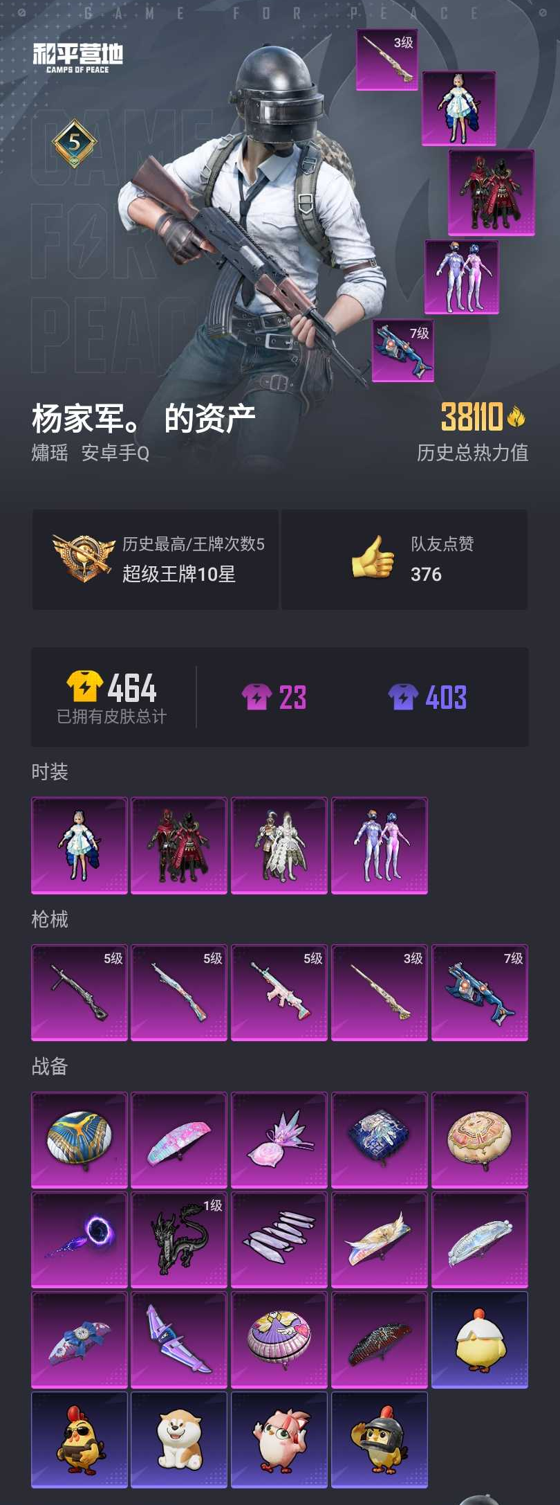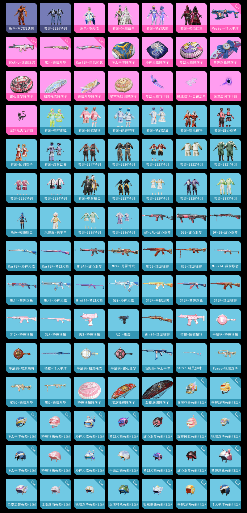 【和平精英】【lyhp20351】4粉装,5特效呛,0载具,历史最高段位:超级王牌10星 王牌印记5次 热力值:38110,93套装,120呛械,154装备,76战备;套装:套装-梦幻火箭,套装-冰霜白皇,套装-炙焰红王,角色-洛天依,套装-特训学院,套装-猎鹰,套装-青年教官,套装-蓝色运动,套装-黄色伏地魔,套装-白色伏地魔,套装-黑色伏地魔,套装-骑行爱好者,套装-竞技名士,套装-深蓝色名流,套装-酒红色名流,套装-长空猛禽,套装-海岛探路者,套装-旭日情侣,套装-灼焰舞者,套装-特战装甲,套装-黄色格斗者,套装-战地名士,套装-燃烧卡路里,套装-幻影武者,套装-决胜时刻,套装-魅力单车,套装-热血青春,套装-沙漠兵团,套装-雪山精英,套装-幻世战舞者,套装-青涩时光,套装-缤纷果语,套装-龙魂突击队,套装-麻辣教官,套装-破蛋小黄鸡,套装-疯狂小兔子,套装-北国孤狼,套装-探宝勇士,套装-牛气满满,套装-战术大师,套装-牛气冲天,套装-飞行日记,套装-电音精灵,套装-ss17特训,套装-瑞龙福将,套装-团圆交子,套装-福星高照,套装-虎虎生威吉莉,角色-军刀雅典娜,套装-ss20特训,套装-甜心亚梦,套装-虚音幻奏,套装-ss21特训,套装-萌趣咩咩,套装-娇憨猪猪,套装-荷畔雨呱,套装-梦幻奶油,套装-玉兔迎春,套装-ss22特训,套装-光之冒险,套装-绯格组合,套装-ss23特训,套装-王牌教练,套装-ss24特训,套装-ss25特训,套装-香桃花海,套装-冰河战士,套装-ss26特训,套装-空岛之星,套装-云魄琉璃,套装-ss27特训,套装-老实芭蕉,套装-ss28特训,套装-海盐绵绵冰,套装-蝶变,套装-ss29特训,套装-星途旅人,套装-ss30特训,角色-夜瞳黯灵,套装-ss31特训,套装-ss33特训,套装-ss32特训,套装-青翼流星,套装-狂鲨锋刃,套装-炫彩糖果,玩偶服-懒羊羊,套装-元气之梦,套装-ss34特训,套装-薄荷星砂,套装-ss35特训,套装-ss36特训,套装-雪国风尚,套装-萌鸡速递;呛皮:m762-瑞龙福将,m762-彩虹符号,m762-天降萌叽,akm-生命誓言,akm-破晓战魂,akm-涂鸦街区,akm-虎虎生威,akm-霓彩脉冲,akm-乌木金纹,m16a4-蓝色火焰,m16a4-甜心亚梦,m16a4-冰河战士,mk47-洛神天依,mk47-乌木金纹,famas-镜域双华,famas-霓彩脉冲,famas-乌木金纹,aug-冰晶雪宝,aug-紫晶流影,aug-乌木金纹,5级scar-l-锦绣绵绵,scar-l-生命誓言,scar-l-玉兔迎春,scar-l-星途旅人,scar-l-海盐豹豹,scar-l-乌木金纹,g36c-镜域双华,g36c-乌木金纹,m416-蓝色火焰,m416-乌木金纹,q-洛神天依,groza-海盐豹豹,ace32-冰晶雪宝,蜜獾-娇憨猪猪,蜜獾-天降萌叽,ac-val-甜心亚梦,ac-val-乌木金纹,ac-val-天降萌叽,5级kar98k-巳巳如意,kar98k-王子的夏天,kar98k-梦幻火箭,kar98k-彩虹符号,kar98k-洛神天依,amr-鸡智如我,amr-乌木金纹,svd-霓彩脉冲,win94-瑞龙福将,win94-乌木金纹,3级m24-镜域双华,m24-炫彩节奏,m200-乌木金纹,mini14-梦幻火箭,mini14-耀粉歌者,mini14-香桃花海,slr-娇憨猪猪,slr-霓彩脉冲,mk20-h-星途旅人,mk20-h-狂鲨锋刃,mk20-h-乌木金纹,mk14-童趣迷兔,mk14-乌木金纹,mk14-冰河战士,mk14-薄荷星砂,vss-香桃花海,sks-炫彩节奏,sks-乌木金纹,mk12-乌木金纹,mp5k-乌木金纹,uzi-生命誓言,uzi-影袭,uzi-炫彩节奏,uzi-娇憨猪猪,uzi-天降萌叽,uzi-冰河战士,uzi-炫彩糖果,p90-乌木金纹,7级vect-环太平洋,ump45-蓝色火焰,ump45-生命誓言,汤姆逊-炫彩节奏,汤姆逊-环太平洋,aks-74u-乌木金纹,s12k-童趣迷兔,s12k-瑞龙福将,s12k-娇憨猪猪,s12k-垂柳戏鸭,s12k-幻世战舞者,s12k-霓彩脉冲,spas-12-狂鲨锋刃,spas-12-乌木金纹,s1897-炫彩节奏,s1897-精灵梦叶罗丽,s686-生命誓言,dbs-甜心亚梦,dbs-乌木金纹,mg3-瑞龙福将,mg3-幻世战舞者,mg3-乌木金纹,mg3-镜域双华,5级dp-28-豹影疾电,dp-28-甜心亚梦,m249-破晓战魂,m249-月影鸳鸯,m249-彩虹符号,m249-糯团青竹,m249-无面战甲,mg-36-薄荷星砂,平底锅-相思残雪,平底锅-瑞龙福将,平底锅-甜心亚梦,平底锅-娇憨猪猪,平底锅-光之冒险,撬棍-环太平洋,撬棍-冰晶雪宝,铝热弹-炫彩糖果,破片手留单-星途旅人,破片手留单-拽到爆炸,破片手留单-爆破雪人,十子怒-异域银装,盐雾蛋-冰氧夏日;降落伞:梦幻火箭飞行器,镜域双华-灵镜之阶,深渊漩涡飞行器,炫彩糖果飞行器,龙翔九天飞行器,异域银装飞行器,顶峰精英尾迹,狂鲨锋刃飞行器,鸡智如我飞行器,登顶巅峰飞行器; 详情看图连体王者v8 4粉装5特效呛 梦幻火箭 洛天依 满级维克托