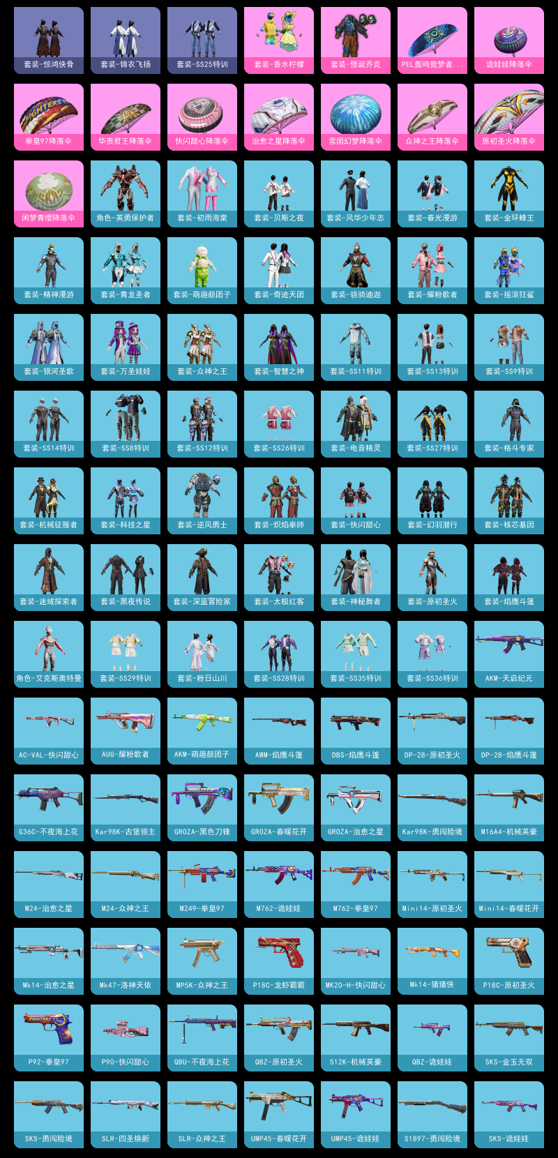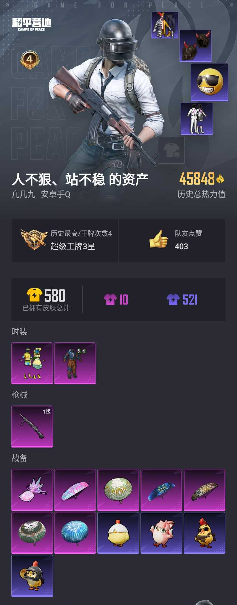 【和平精英】【lyhp20221】2粉装,1特效呛,0载具,历史最高段位:超级王牌3星 王牌印记4次 热力值:45848,140套装,161呛械,165装备,92战备;套装:套装-怪诞乔克,套装-香水柠檬,套装-特训学院,套装-猎鹰,套装-青年教官,套装-橘黑制服,套装-红色运动,套装-黄色运动,套装-蓝色运动,套装-黄色伏地魔,套装-白色伏地魔,套装-黑色伏地魔,套装-骑行爱好者,套装-竞技名士,套装-深蓝色名流,套装-湖蓝色名流,套装-黄色名流,套装-猛禽,套装-游猎者,套装-长空猛禽,套装-竞技勇士朋克,套装-蓝色守护者,套装-海岛探路者,套装-旭日情侣,套装-冷焰舞者,套装-灼焰舞者,套装-刚毅裁决者,套装-特战装甲,套装-战地菁英,套装-战地督导,套装-黄色格斗者,套装-灰色格斗者,套装-迎春赐吉,套装-潮流先锋,套装-龙腾端午,套装-完美偶像,套装-人气偶像,套装-幻影武者,套装-街头潮人,套装-蓝彩潮人,套装-千禧之恋,套装-决胜时刻,套装-魅力单车,套装-绮丽涂鸦,套装-雪山征服者,套装-坚韧舞者,套装-竞技达人朋克,套装-夜莺强袭者,套装-都市漫游者,套装-野性战心,套装-破晓战魂,套装-都市魅力,套装-热血青春,套装-丛林猎人,套装-雪山精英,套装-传奇侦探,套装-自由不朽乐队,套装-甜蜜熊情侣,套装-青涩时光,套装-缤纷果语,套装-龙魂突击队,套装-元素星魂,套装-极速红龙,套装-太极红客,套装-初雨海棠,套装-金环蜂王,套装-梦魇先生,套装-万圣娃娃,套装-黑夜传说,套装-破蛋小黄鸡,套装-花面小丑,套装-狂徒小丑,套装-深蓝冒险家,套装-迷域探索者,套装-机械征服者,套装-圣诞大吉,套装-凛冬战士,套装-北国孤狼,套装-炽焰拳师,套装-格斗专家,套装-奇迹天团,套装-跃动心情,套装-核芯基因,套装-精神漫游,套装-银河圣歌,套装-霓虹街区,套装-ss8特训,套装-众神之王,套装-智慧之神,套装-萌黄之夏,套装-摇滚狂鲨,套装-夏日音浪,套装-ss9特训,套装-风华少年志,套装-神秘舞者,套装-牛气满满,套装-ss11特训,套装-青龙圣者,套装-骁骑迪迦,套装-原初圣火,套装-逆风勇士,套装-萌趣颜团子,套装-ss12特训,套装-耀粉歌者,套装-科技之星,套装-ss13特训,套装-ss14特训,套装-电音精灵,角色-迪迦奥特曼,角色-艾克斯奥特曼,套装-吉莉礼服,角色-英勇保护者,套装-龟仙人,套装-ss25特训,套装-惊鸿侠骨,套装-锦衣飞扬,套装-香桃花海,套装-龙的传人,套装-冰河战士,套装-ss26特训,套装-快闪甜心,套装-春光漫游,套装-空岛之星,套装-贝斯之夜,套装-焰鹰斗篷,套装-幻羽潜行,套装-ss27特训,套装-ss28特训,套装-街头风暴,套装-海盐绵绵冰,套装-蝶变,套装-粉日山川,套装-ss29特训,套装-星途旅人,套装-ss30特训,套装-炫彩糖果,套装-ss34特训,套装-ss35特训,套装-ss36特训,套装-雪国风尚;呛皮:akm-破晓战魂,akm-天启纪元,akm-霓虹街区,akm-夜灯,akm-萌趣颜团子,akm-龙的传人,akm-乌木金纹,groza-生命誓言,groza-春暖花开,groza-黑色刀锋,groza-治愈之星,groza-海盐豹豹,groza-乌木金纹,scar-l-红色方程式,scar-l-夜灯,scar-l-炫彩节奏,scar-l-星途旅人,scar-l-海盐豹豹,scar-l-乌木金纹,蜜獾-天降萌叽,蜜獾-精灵梦叶罗丽,aug-小丑,aug-耀粉歌者,aug-紫晶流影,aug-乌木金纹,m762-诡娃娃,m762-小丑,m762-拳皇97,m762-牛气冲天,m762-乌木金纹,m416-夜灯,m416-蓝色火焰,m416-生命誓言,m416-红色方程式,m416-糯团青竹,m416-乌木金纹,mk47-洛神天依,ac-val-快闪甜心,q-诡娃娃,q-原初圣火,q-乌木金纹,m16a4-生命誓言,m16a4-机械英豪,m16a4-冰河战士,m16a4-乌木金纹,ace32-冰晶雪宝,g36c-不夜海上花,kar98k-红色方程式,kar98k-小丑,kar98k-古堡领主,kar98k-勇闯险境,kar98k-彩虹符号,kar98k-顶峰精英,awm-天降萌叽,awm-焰鹰斗篷,awm-乌木金纹,m24-众神之王,m24-治愈之星,win94-机械英豪,win94-乌木金纹,amr-乌木金纹,m200-惊鸿侠骨,mk20-h-快闪甜心,mk20-h-星途旅人,mk20-h-乌木金纹,mini14-春暖花开,mini14-原初圣火,mini14-炫彩节奏,mini14-香桃花海,mini14-乌木金纹,mk12-乌木金纹,vss-黑色刀锋,vss-香桃花海,vss-乌木金纹,sks-金玉无双,sks-诡娃娃,sks-勇闯险境,sks-乌木金纹,m417-惊鸿侠骨,qbu-不夜海上花,slr-众神之王,slr-四圣焕新,mk14-治愈之星,mk14-冰河战士,mk14-猪猪侠,mp5k-众神之王,mp5k-乌木金纹,汤姆逊-小丑,汤姆逊-勇闯险境,汤姆逊-耀粉歌者,汤姆逊-乌木金纹,uzi-小丑,uzi-众神之王,uzi-天降萌叽,uzi-冰河战士,uzi-啾咪啾咪,uzi-炫彩糖果,uzi-乌木金纹,vect-生命誓言,vect-彩虹符号,vect-治愈之星,vect-焰鹰斗篷,vect-乌木金纹,ump45-生命誓言,ump45-诡娃娃,ump45-春暖花开,ump45-乌木金纹,p90-快闪甜心,p90-乌木金纹,野牛-机械英豪,dbs-焰鹰斗篷,dbs-乌木金纹,s686-红色方程式,s686-生命誓言,s686-冰封烈焰,s686-彩虹符号,s686-乌木金纹,s12k-夜灯,s12k-机械英豪,s12k-极意拳锋,s12k-乌木金纹,s1897-勇闯险境,spas-12-乌木金纹,m249-拳皇97,m249-彩虹符号,m249-金丰海韵,m249-乌木金纹,mg3-幻世战舞者,mg3-惊鸿侠骨,1级dp-28-豹影疾电,dp-28-原初圣火,dp-28-焰鹰斗篷,mg-36-薄荷星砂,蝎式手呛-闲梦青缨,沙墨之鹦-快闪甜心,p18c-龙虾霸霸,p18c-原初圣火,p18c-竞速先锋,p1911-冰封烈焰,p92-拳皇97,平底锅-诡娃娃,平底锅-冰封烈焰,平底锅-拳皇97,平底锅-黑色刀锋,平底锅-勇闯险境,平底锅-众神之王,平底锅-不夜海上花,平底锅-机械英豪,平底锅-原初圣火,平底锅-治愈之星,平底锅-惊鸿侠骨,平底锅-快闪甜心,平底锅-电糖天使,平底锅-空岛之星,平底锅-焰鹰斗篷,撬棍-传奇侦探,破片手留单-呆爆全场,破片手留单-星途旅人,破片手留单-爆破