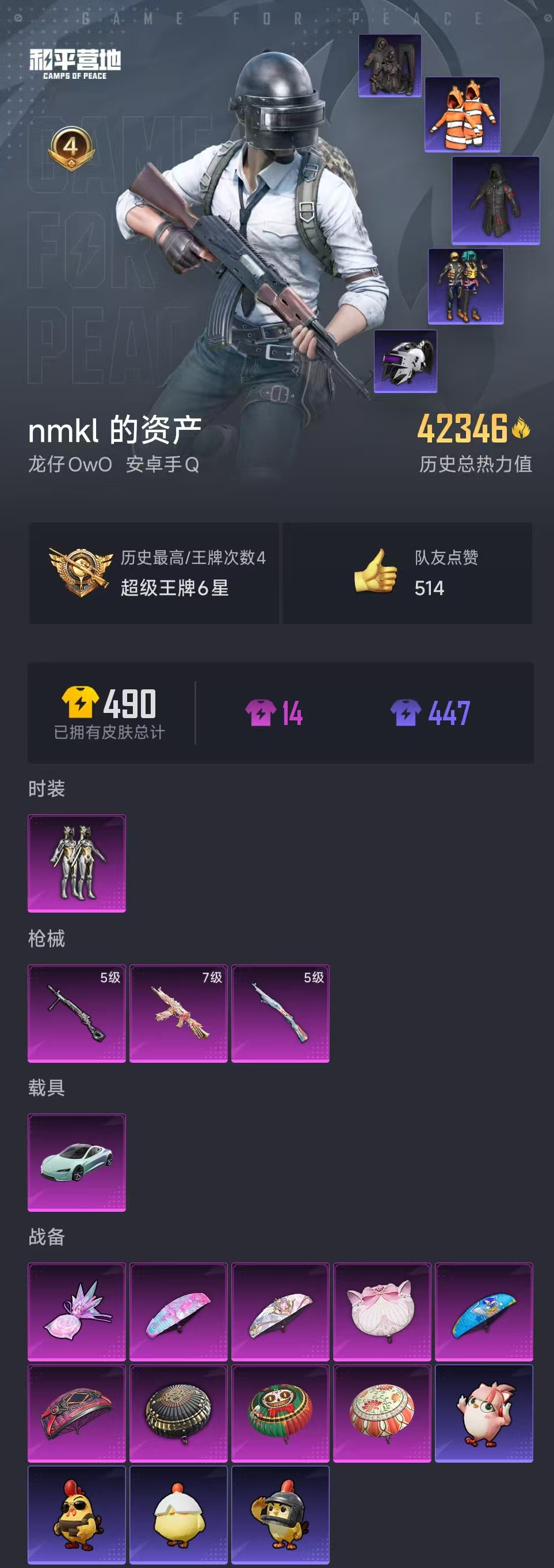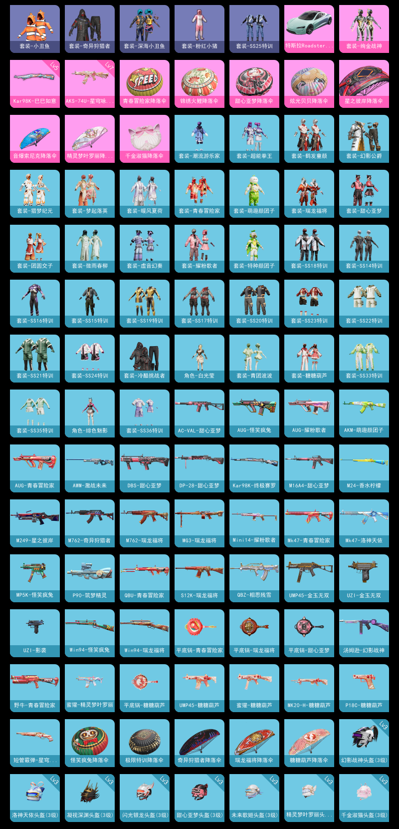 【和平精英】【lyhp20320】1粉装,3特效呛,1载具,历史最高段位:超级王牌6星 王牌印记4次 热力值:42346,127套装,131呛械,143装备,72战备;套装:套装-绚金战神,套装-特训学院,套装-猎鹰,套装-青年教官,套装-橘黑制服,套装-红色运动,套装-黄色运动,套装-蓝色运动,套装-黄色伏地魔,套装-白色伏地魔,套装-黑色伏地魔,套装-竞技名士,套装-深蓝色名流,套装-酒红色名流,套装-湖蓝色名流,套装-黄色名流,套装-猛禽,套装-长空猛禽,套装-蓝色守护者,套装-海岛探路者,套装-旭日情侣,套装-冷焰舞者,套装-灼焰舞者,套装-特战装甲,套装-战地菁英,套装-战地督导,套装-特殊使命,套装-滨海假日,套装-冷酷挑战者,套装-完美偶像,套装-人气偶像,套装-幻影武者,套装-街头潮人,套装-蓝彩潮人,套装-魅力单车,套装-绮丽涂鸦,套装-耀眼新星,套装-竞技达人朋克,套装-都市漫游者,套装-破晓战魂,套装-都市魅力,套装-沙漠兵团,套装-幻世战舞者,套装-冰凉西瓜,套装-奇异狩猎者,套装-深海小丑鱼,套装-青涩时光,套装-缤纷果语,套装-风暴特警,套装-冰川特警,套装-元素星魂,套装-幻影公爵,套装-极速红龙,套装-海上生明月,套装-麻辣教官,套装-小丑鱼,套装-粉红小猪,套装-破蛋小黄鸡,套装-萌黄之夏,套装-超能拳王,套装-探宝勇士,套装-牛气满满,套装-白糯汤圆,套装-青春冒险家,套装-潮流游乐家,套装-萌趣颜团子,套装-特种颜团子,套装-战术大师,套装-牛气冲天,套装-ss18特训,套装-耀粉歌者,套装-梦起落英,套装-ss14特训,套装-吉莉礼服,套装-微雨春柳,套装-暖风夏荷,套装-鹤发童颜,套装-ss15特训,套装-ss16特训,套装-ss17特训,套装-瑞龙福将,套装-团圆交子,套装-福星高照,套装-空投萌叽,套装-ss19特训,套装-ss20特训,套装-猎梦纪元,套装-甜心亚梦,套装-虚音幻奏,套装-ss21特训,套装-玉兔迎春,套装-ss22特训,套装-光之冒险,套装-ss23特训,套装-王牌教练,套装-柠萌假日,套装-ss24特训,套装-龟仙人,套装-ss25特训,套装-香桃花海,套装-冰河战士,套装-漫游都市,套装-云魄琉璃,角色-白光莹,套装-街头风暴,套装-海盐绵绵冰,套装-蝶变,角色-绯色魅影,套装-异域银装,套装-星途旅人,套装-ss30特训,套装-青团波波,套装-糖糖葫芦,套装-智谋强哥,套装-ss33特训,套装-青翼流星,套装-狂鲨锋刃,套装-大橘大利,套装-炫彩糖果,套装-元气之梦,套装-ss34特训,套装-游乐,套装-薄荷星砂,套装-ss35特训,套装-ss36特训,套装-雪国风尚,套装-萌鸡速递;呛皮:m762-奇异狩猎者,m762-瑞龙福将,m762-天降萌叽,m762-登顶巅峰,famas-霓彩脉冲,famas-乌木金纹,ace32-冰晶雪宝,aug-耀粉歌者,aug-青春冒险家,aug-怪笑疯兔,aug-天降萌叽,aug-异域银装,aug-冰晶雪宝,aug-紫晶流影,m16a4-甜心亚梦,m16a4-幻世战舞者,m16a4-冰河战士,akm-破晓战魂,akm-夜灯,akm-涂鸦街区,akm-彩虹符号,akm-萌趣颜团子,akm-霓彩脉冲,scar-l-红色方程式,scar-l-炫彩节奏,scar-l-彩虹符号,scar-l-玉兔迎春,scar-l-星途旅人,scar-l-海盐豹豹,g36c-乌木金纹,蜜獾-天降萌叽,蜜獾-精灵梦叶罗丽,蜜獾-糖糖葫芦,m416-夜灯,m416-蓝色火焰,m416-红色方程式,m416-糯团青竹,ac-val-甜心亚梦,ac-val-乌木金纹,ac-val-天降萌叽,q-彩虹符号,q-相思残雪,groza-彩虹符号,groza-海盐豹豹,mk47-青春冒险家,mk47-洛神天依,mk47-乌木金纹,5级kar98k-巳巳如意,kar98k-终极赛罗,kar98k-彩虹符号,kar98k-顶峰精英,kar98k-乌木金纹,m24-香水柠檬,m24-炫彩节奏,莫辛纳甘-乌木金纹,win94-怪笑疯兔,win94-瑞龙福将,win94-乌木金纹,awm-激战未来,awm-乌木金纹,qbu-青春冒险家,mk20-h-星途旅人,mk20-h-糖糖葫芦,mk20-h-狂鲨锋刃,mk20-h-乌木金纹,vss-香桃花海,mini14-耀粉歌者,mini14-香桃花海,mk14-乌木金纹,mk14-冰河战士,mk14-薄荷星砂,slr-霓彩脉冲,mk12-乌木金纹,vect-生命誓言,ump45-蓝色火焰,ump45-生命誓言,ump45-金玉无双,ump45-糖糖葫芦,野牛-青春冒险家,野牛-乌木金纹,uzi-影袭,uzi-金玉无双,uzi-炫彩节奏,uzi-天降萌叽,uzi-冰河战士,uzi-炫彩糖果,7级aks-74u-星穹咏叹调,aks-74u-鸡智如我,aks-74u-乌木金纹,汤姆逊-幻影战神,p90-筑梦精灵,mp5k-怪笑疯兔,dbs-甜心亚梦,dbs-彩虹符号,dbs-乌木金纹,spas-12-狂鲨锋刃,spas-12-乌木金纹,s686-红色方程式,s686-生命誓言,s686-彩虹符号,s12k-破晓战魂,s12k-瑞龙福将,s12k-幻世战舞者,s12k-霓彩脉冲,s1897-炫彩节奏,s1897-乌木金纹,pkm-啾咪啾咪,m249-星之彼岸,m249-冰晶雪宝,m249-乌木金纹,mg-36-薄荷星砂,mg3-瑞龙福将,mg3-幻世战舞者,mg3-乌木金纹,5级dp-28-豹影疾电,dp-28-彩虹符号,dp-28-甜心亚梦,短管霰弹-星穹咏叹调,p18c-糖糖葫芦,平底锅-青春冒险家,平底锅-瑞龙福将,平底锅-甜心亚梦,平底锅-光之冒险,平底锅-糖糖葫芦,撬棍-幻世战舞者,撬棍-冰晶雪宝,盐雾蛋-冰氧夏日,十子怒-异域银装,铝热弹-炫彩糖果,破片手留单-星途旅人,破片手留单-拽到爆炸;载具:特斯拉roadster水滴蓝;降落伞:炫彩糖果飞行器,火焰蝠人飞行服,红色滑翔尾迹,异域银装飞行器,顶峰精英尾迹,狂鲨锋刃飞行器,鸡智如我飞行器,登顶巅峰飞行器; 详情看图地铁满天赋 绚金战神 奇异 小丑鱼 满级aks-74u 特斯拉