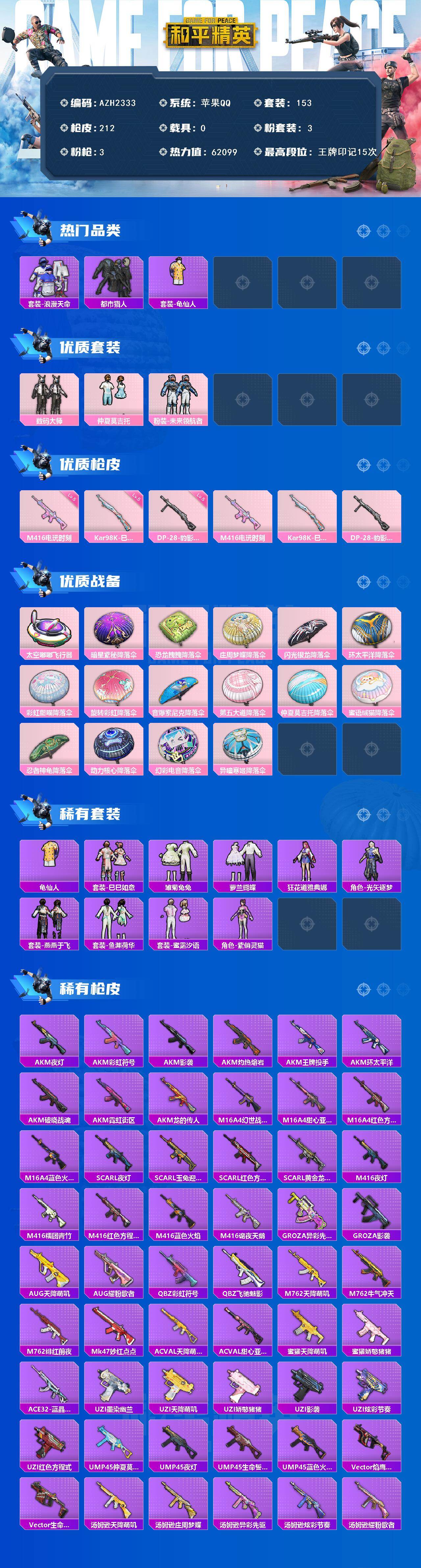 苹果 手q【15印记 仲夏莫吉托都市猎人】3粉装-3特效呛-0载具-2粉色飞行器-62099热力值-15王牌印记-153套装-212呛皮 【热门品类】:套装-浪漫天命,套装-都市猎人,套装-龟仙人 【粉色套装】:粉装-数码大师,粉装-仲夏莫吉托,粉装-未来领航者 【粉色呛皮等级】:m416-电玩时刻五级,kar98k-巳巳如意五级,dp-28-豹影疾电五级 【粉色呛皮】:m416-