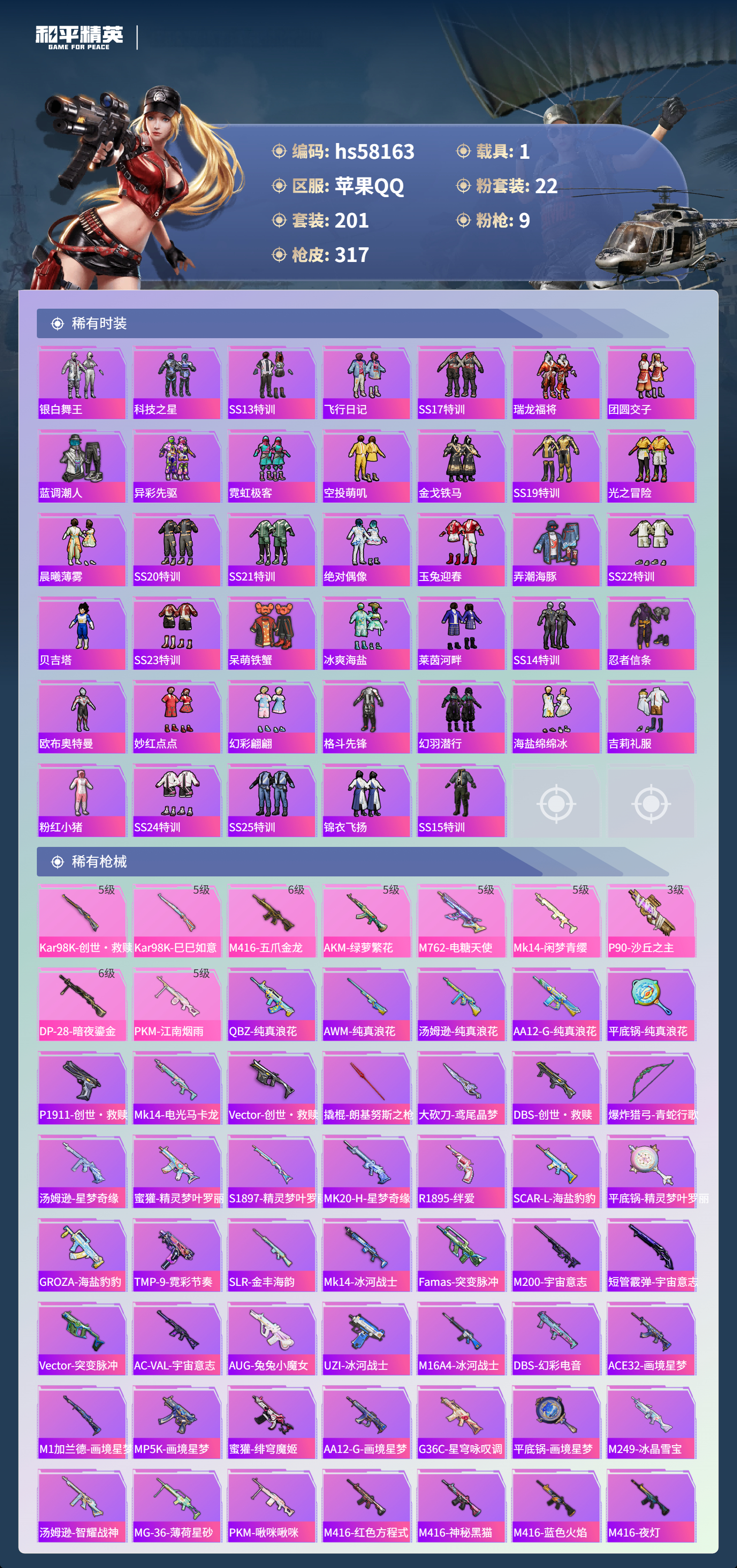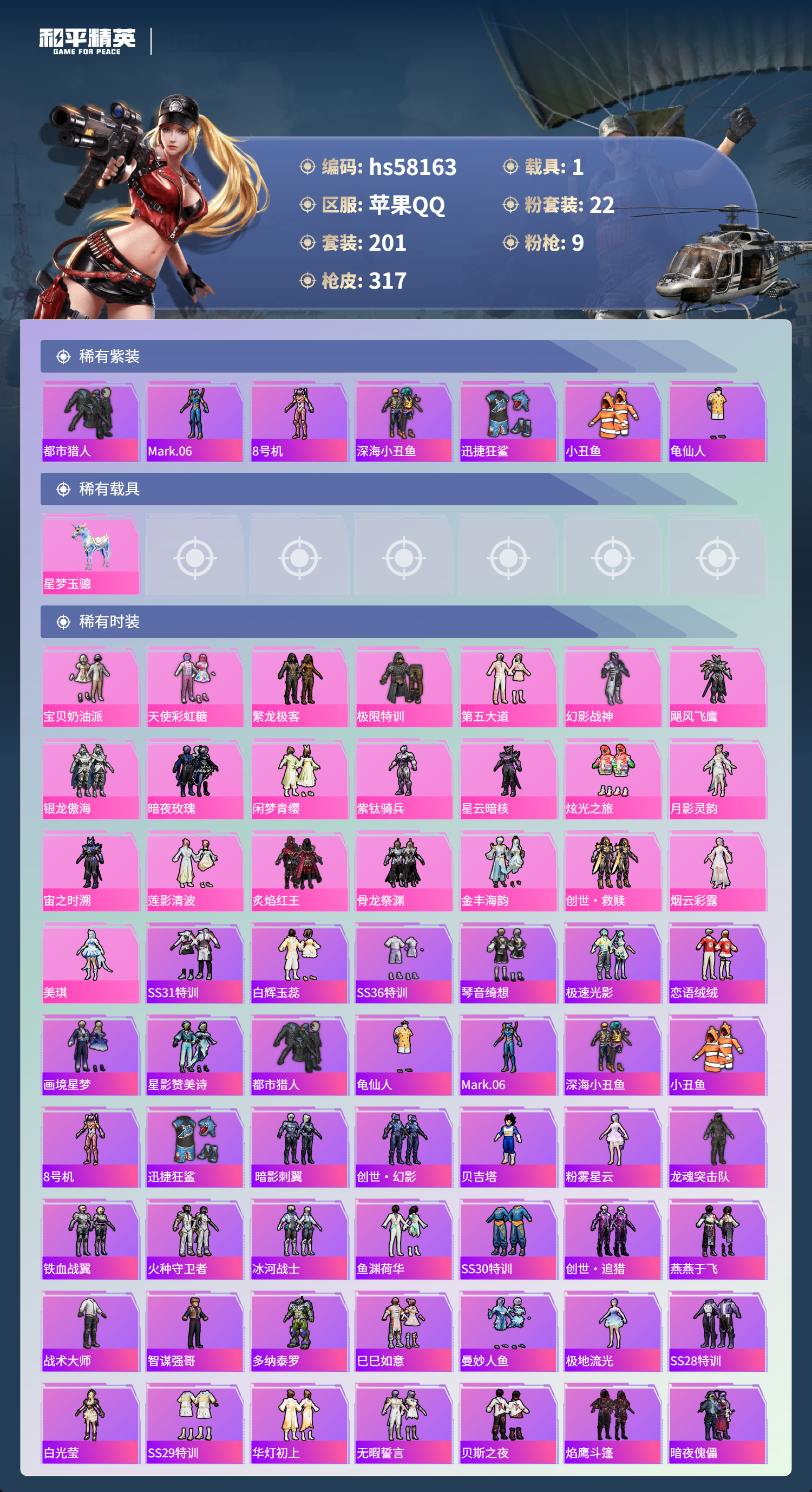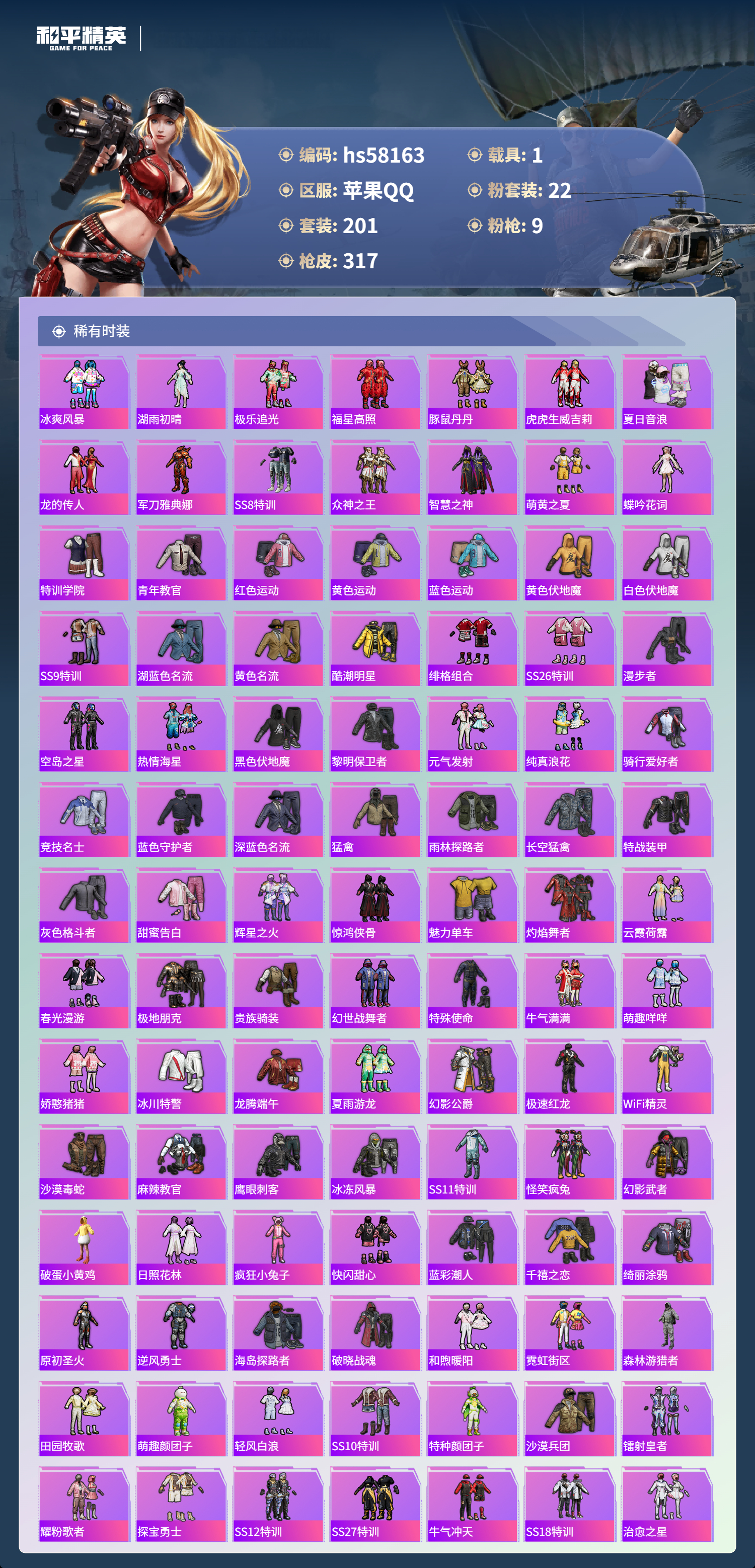 1载具-201套装-317呛皮-hs58163 苹果手q-7王牌印记-22粉装-9特效呛-1载具-热力值-201套装-317呛皮【22粉装】套装-炙焰红王套装-宝贝奶油派套装-飓风飞鹰套装-银龙傲海角色-月影灵韵套装-金丰海韵套装-莲影清波套装-天使彩虹糖角色-烟云彩露套装-幻影战神角色-紫钛骑兵套装-炫光之旅套装-闲梦青缨角色-美琪套装-暗夜玫瑰套装-极限特训套装-繁龙极客角色-