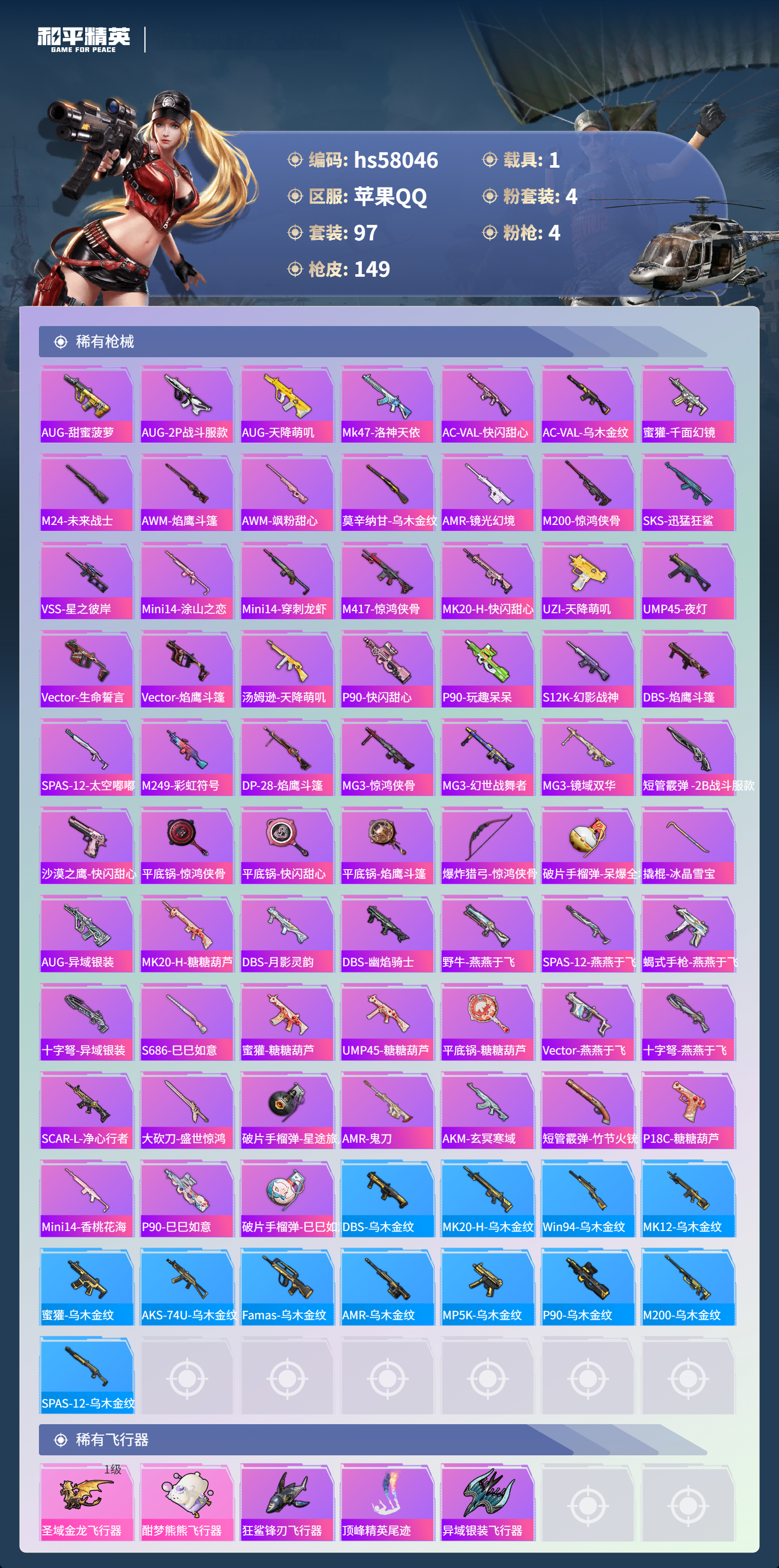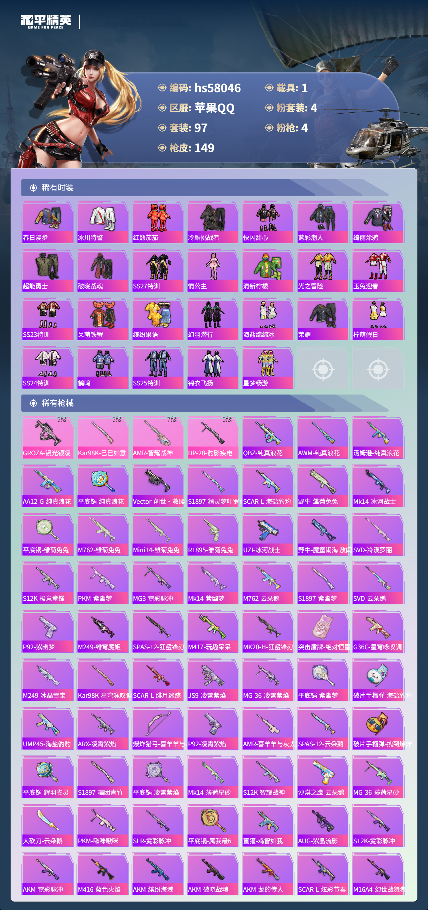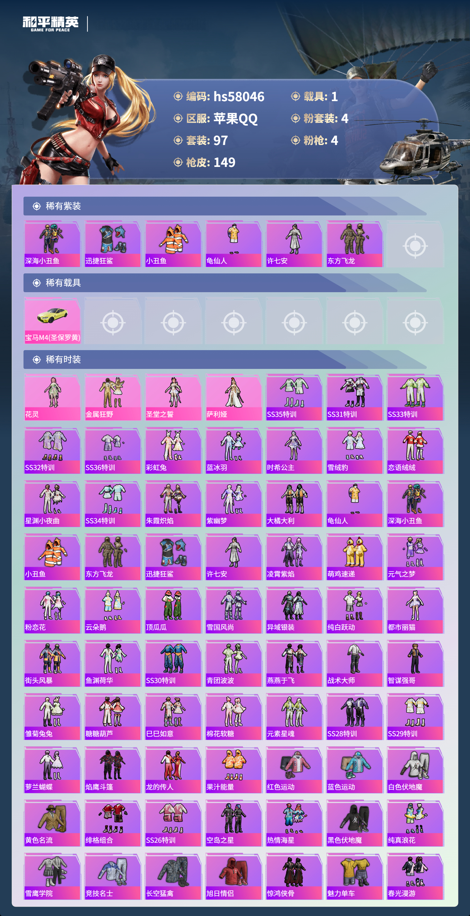 1载具-97套装-149呛皮-hs58046 苹果手q-8王牌印记-4粉装-4特效呛-1载具-45574热力值-97套装-149呛皮【4粉装】角色-萨利娅套装-金属狂野角色-花灵角色-圣堂之誓【4特效呛】groza-镜光银凌/5级kar98k-巳巳如意/5级amr-智耀战神/7级dp-28-豹影疾电/5级【6稀有紫装】深海小丑鱼迅捷狂鲨小丑鱼龟仙人许七安东方飞龙【1稀有载具】宝马m4圣保罗黄