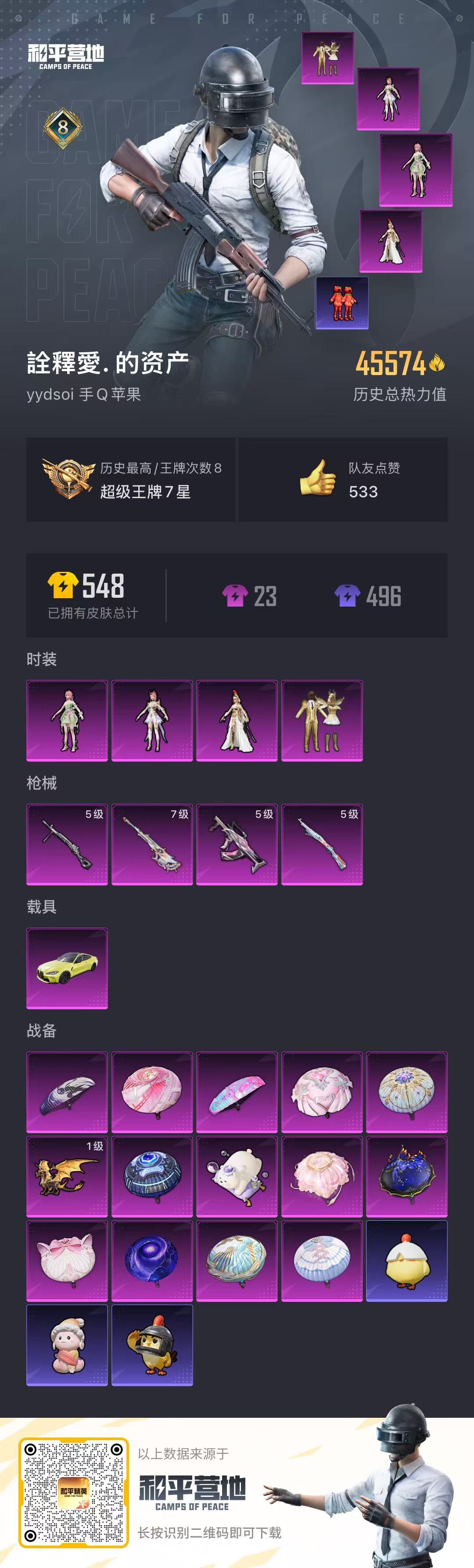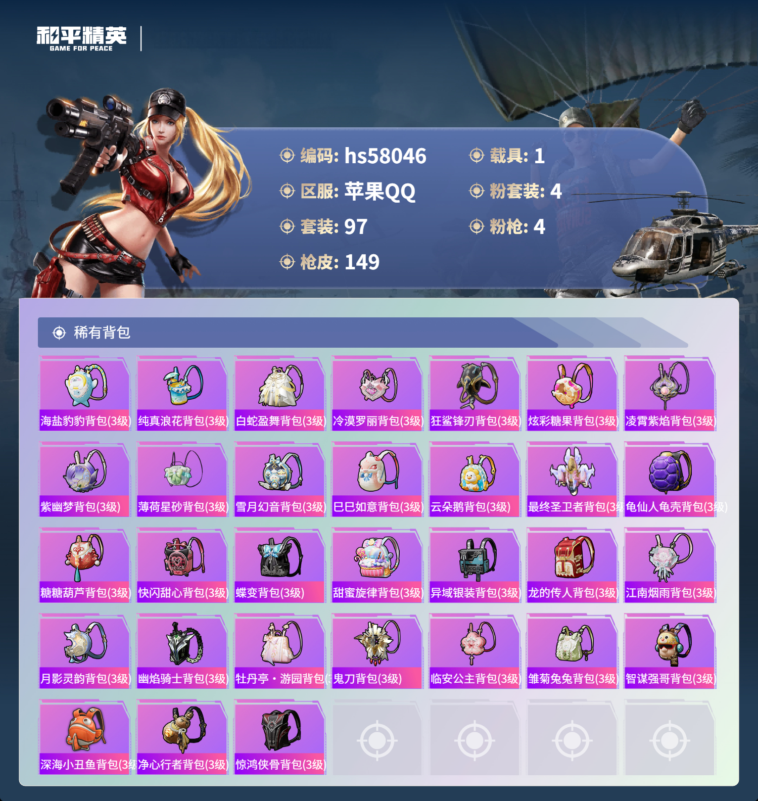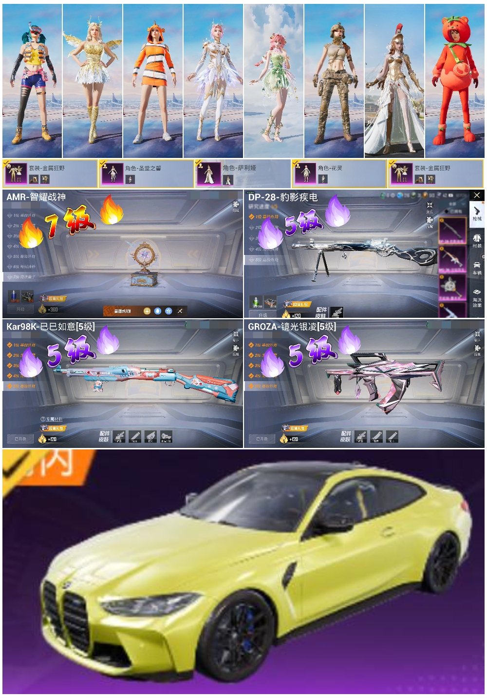 1载具-97套装-149呛皮-hs58046 苹果手q-8王牌印记-4粉装-4特效呛-1载具-45574热力值-97套装-149呛皮【4粉装】角色-萨利娅套装-金属狂野角色-花灵角色-圣堂之誓【4特效呛】groza-镜光银凌/5级kar98k-巳巳如意/5级amr-智耀战神/7级dp-28-豹影疾电/5级【6稀有紫装】深海小丑鱼迅捷狂鲨小丑鱼龟仙人许七安东方飞龙【1稀有载具】宝马m4圣保罗黄